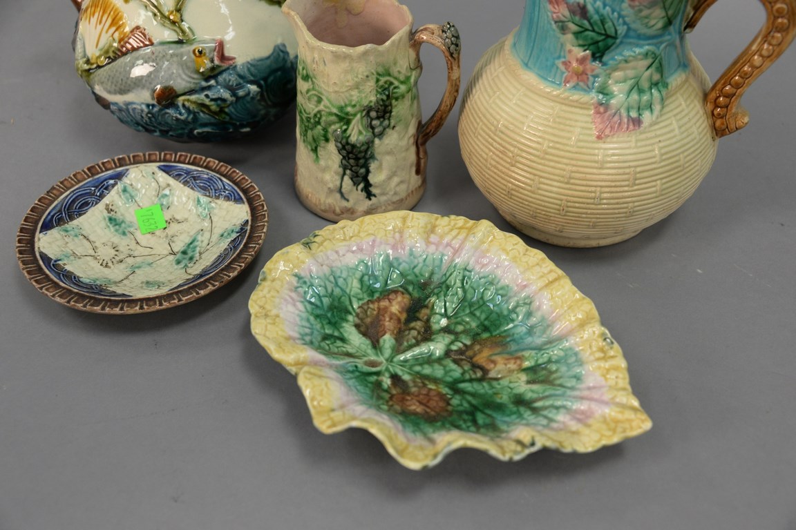 Five pieces of Majolica to include a pitcher with basket weave bottom, leaf dish, small dish, creamer, and a fish pitcher marked Shorter & sons. ht. 5 1/2 in. to ht. 8 in.
