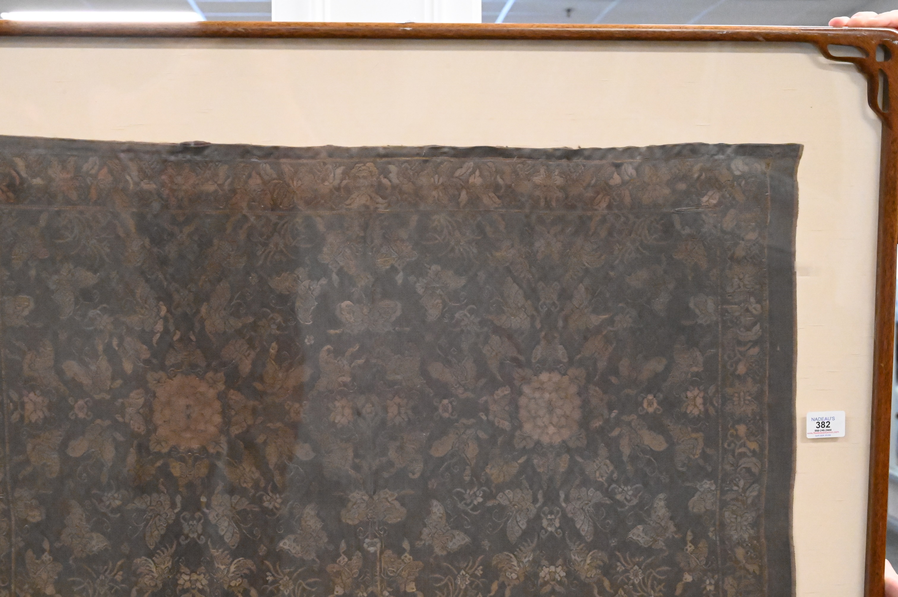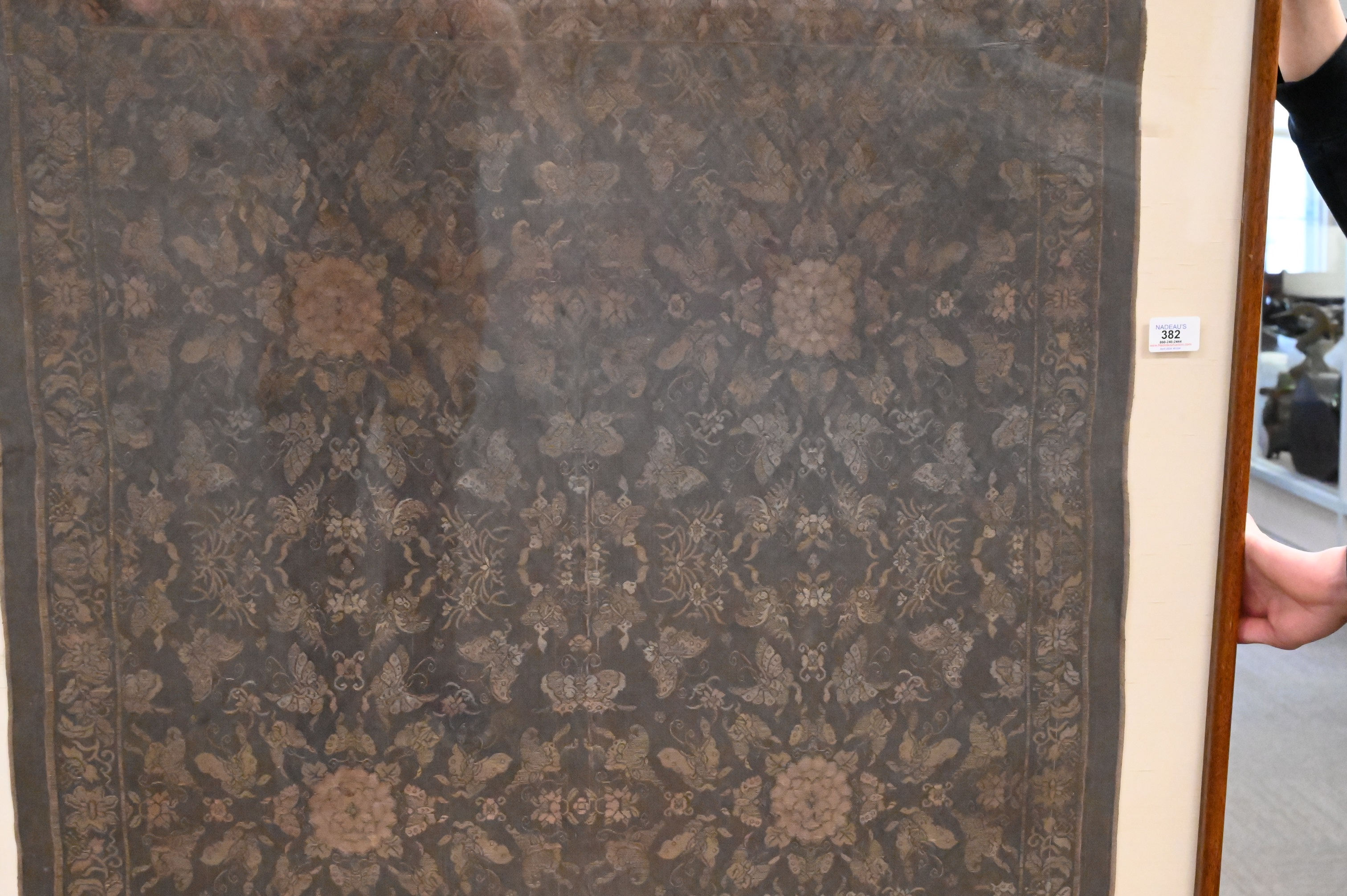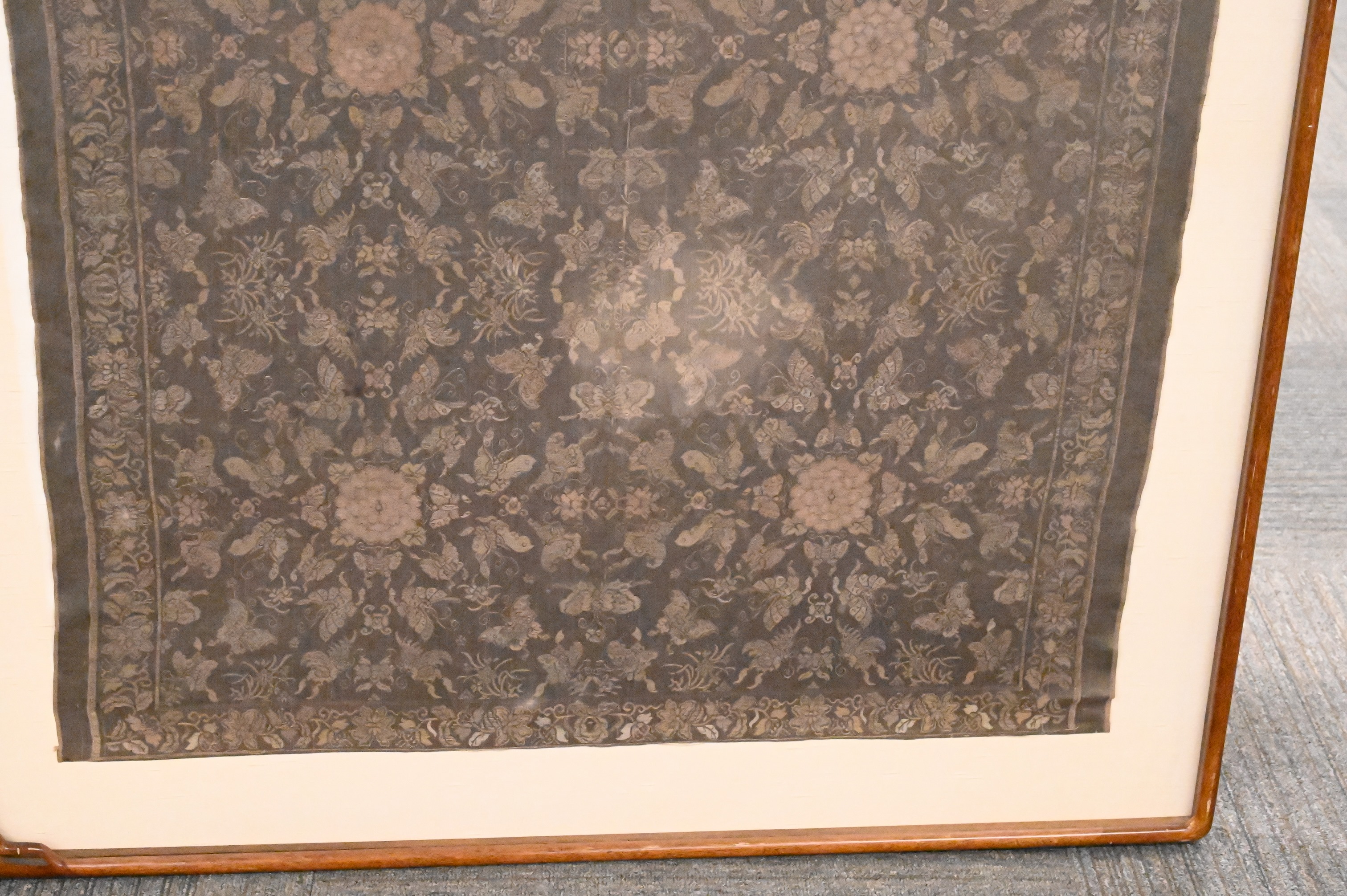 fragment panel, silk embroidered having butterfly lotus flower motif in custom wood frame with silk border