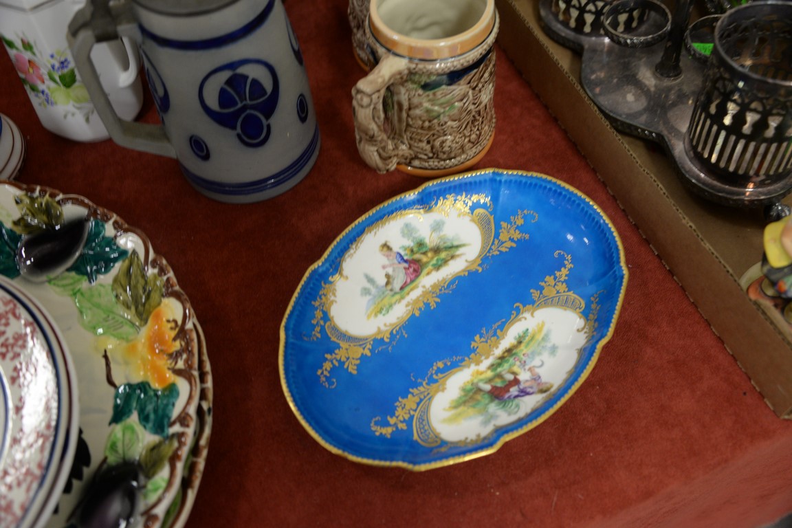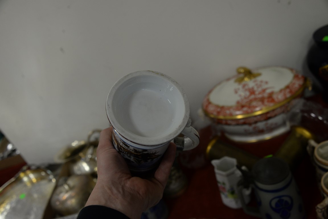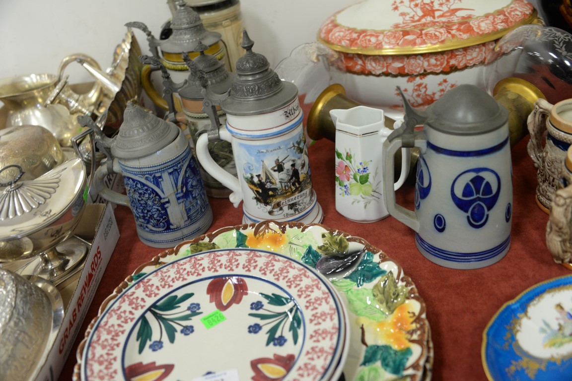 Lot 382: Group lot with Royal Crown Derby tureen, six steins including a lithophane stein, and several dishes.