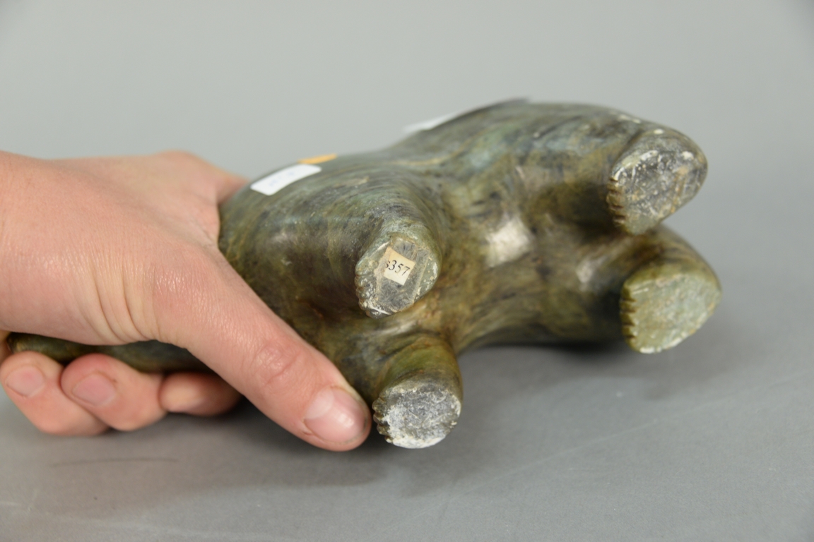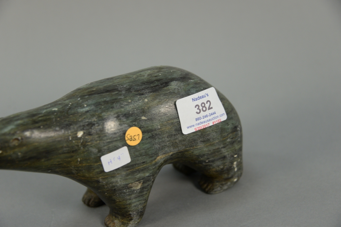 Inuit Eskimo carving Esau Ulayok b. 1921 Igulik dark green serpentine Bear, ht. 4in., 3 x 3.