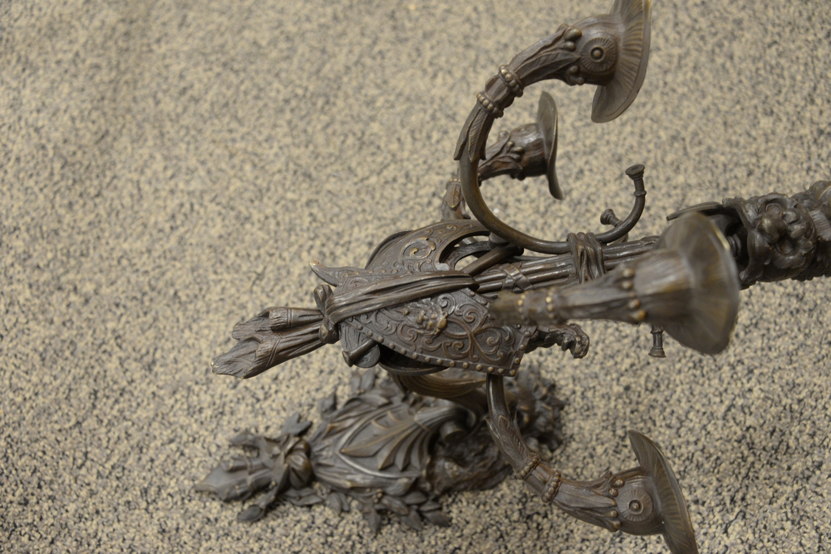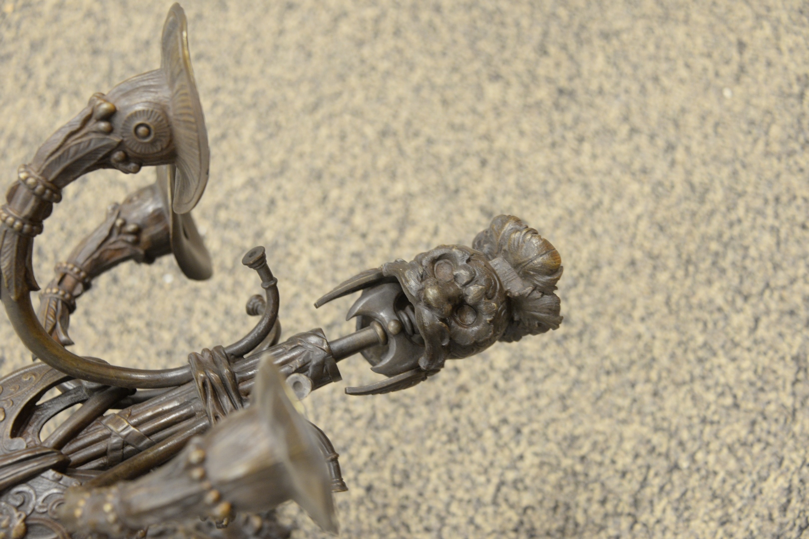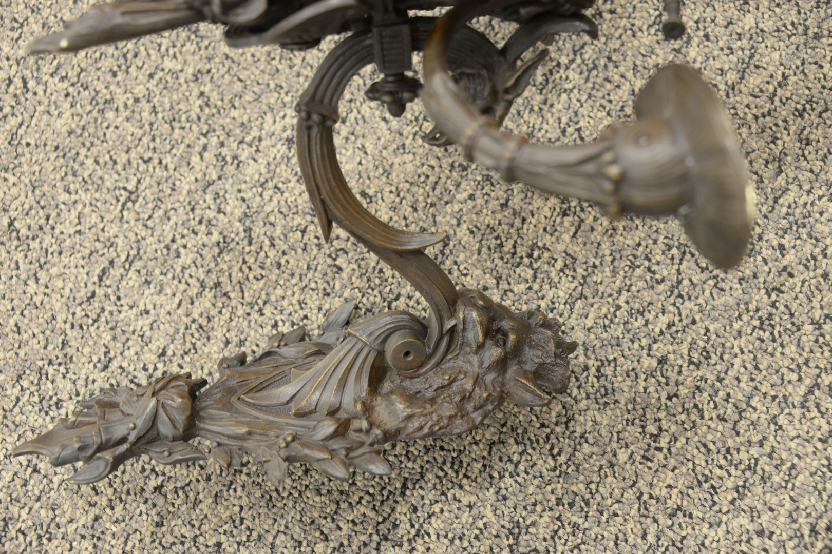 Lot 382: Large Neoclassical Style Bronze Sconce, having five lights and a gladiator helmet form to the top, height 17 inches, width 15 inches, depth 15 1/2 inches.