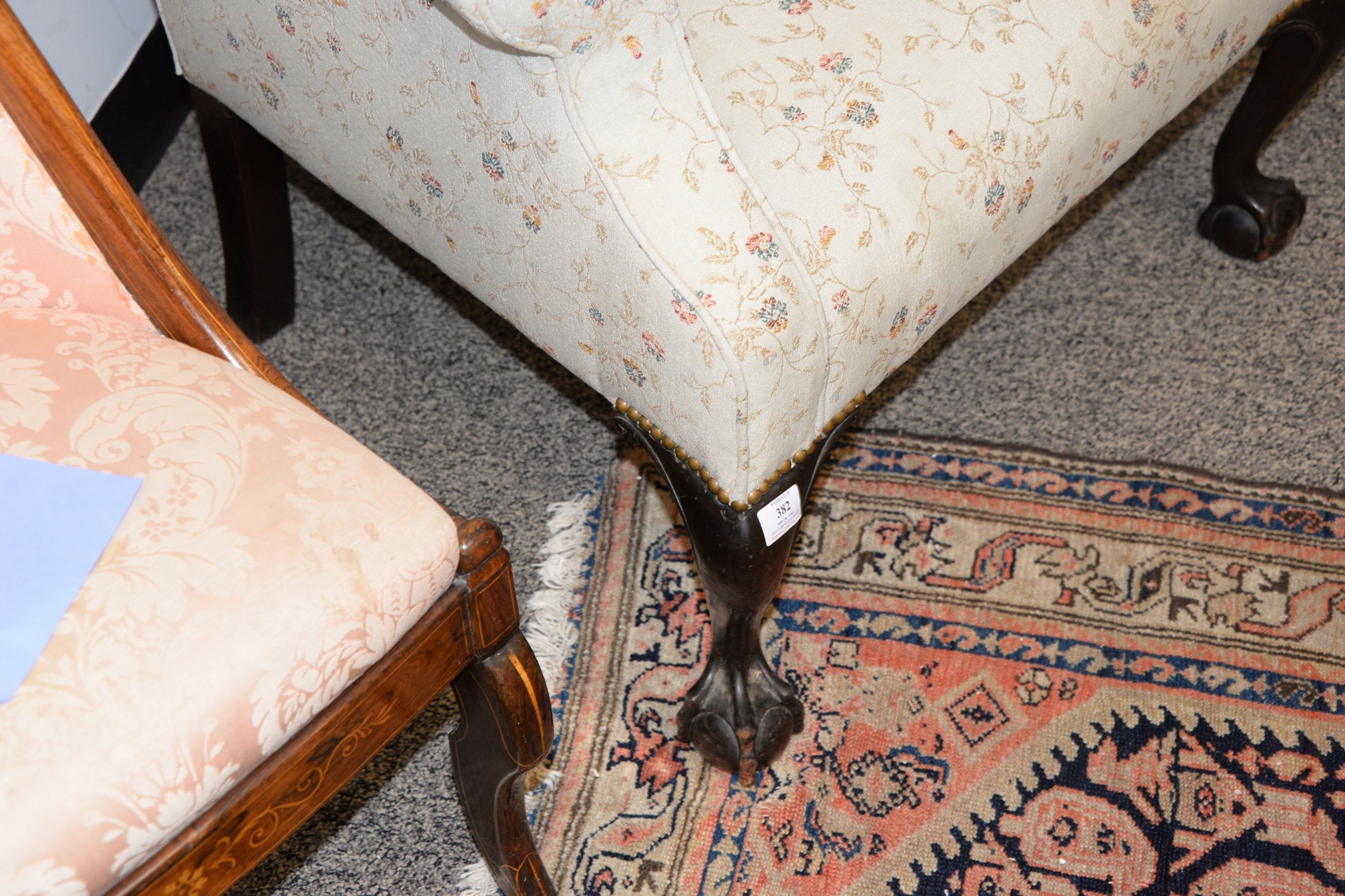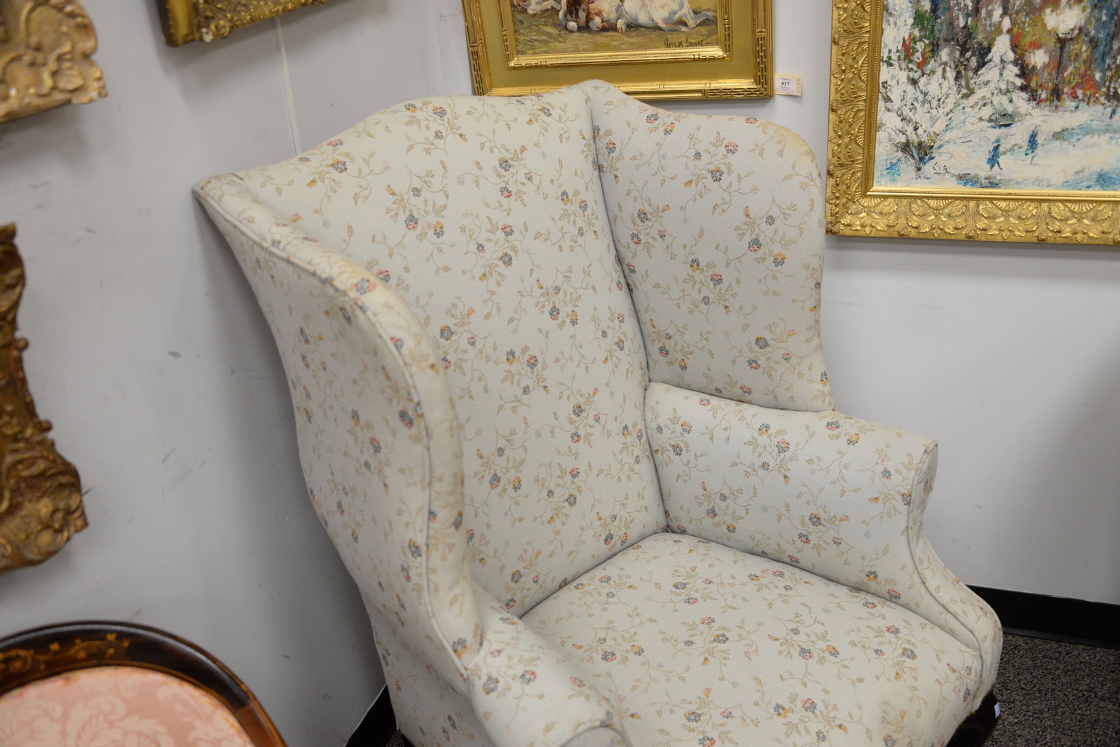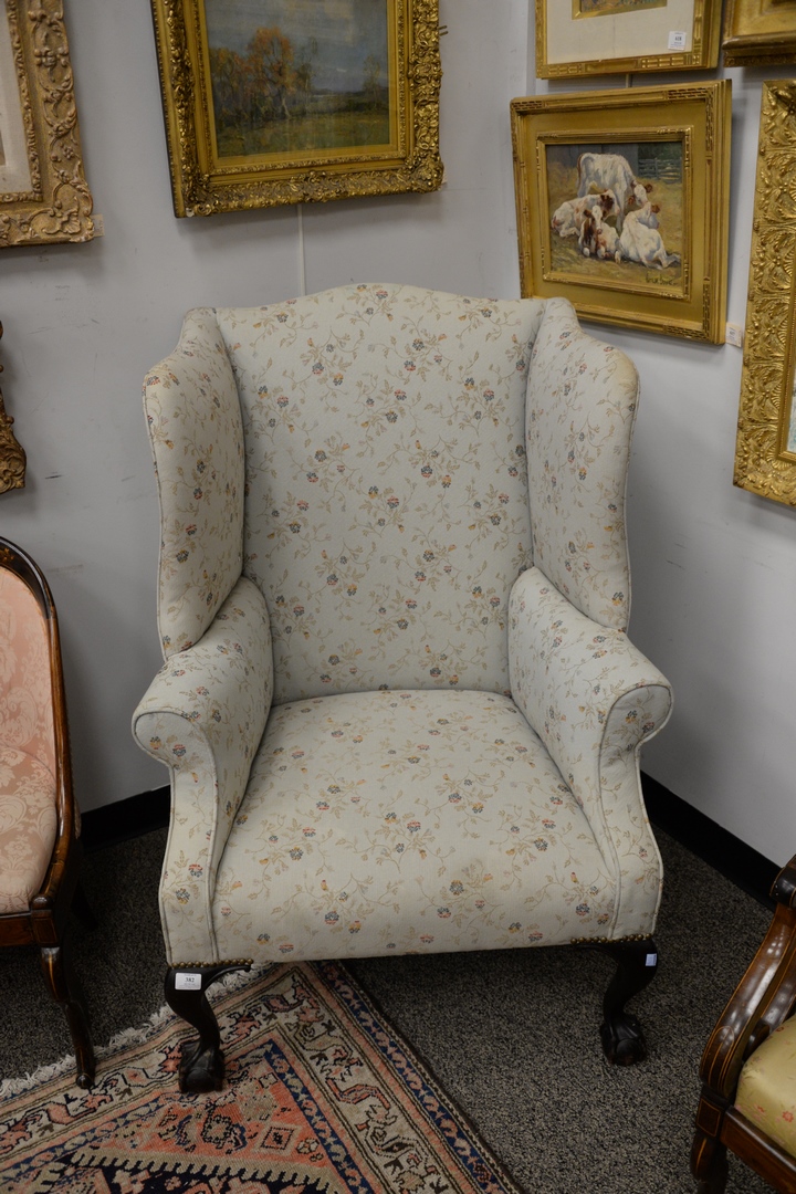 Lot 382: Margolis Mahogany Chippendale Style Wing Chair seat height 29 inches, total height 45 inches, width 32 1/2 inches Provenance: From a…