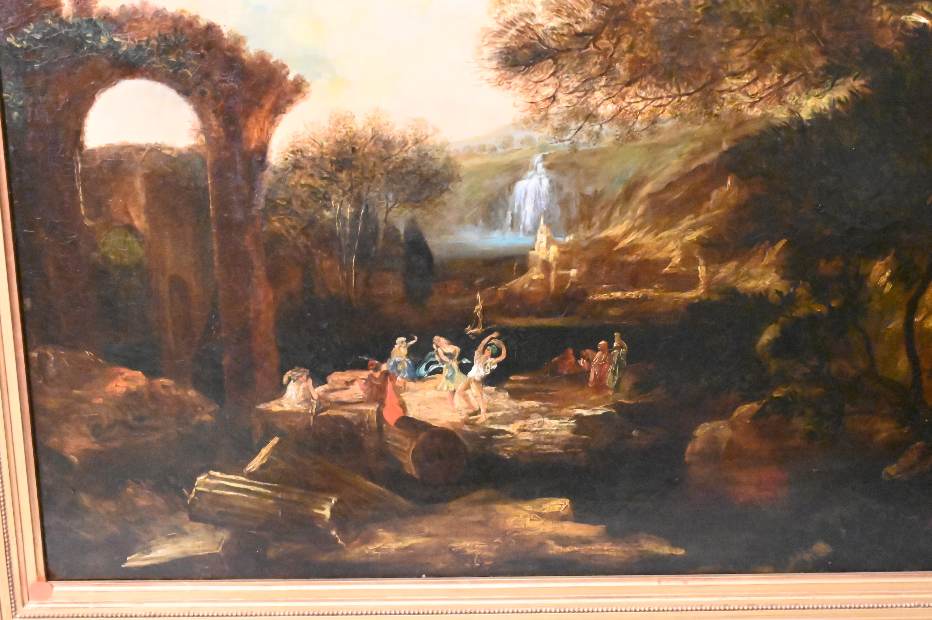 Landscape having figures dancing in foreground by ruins and waterfall in background
