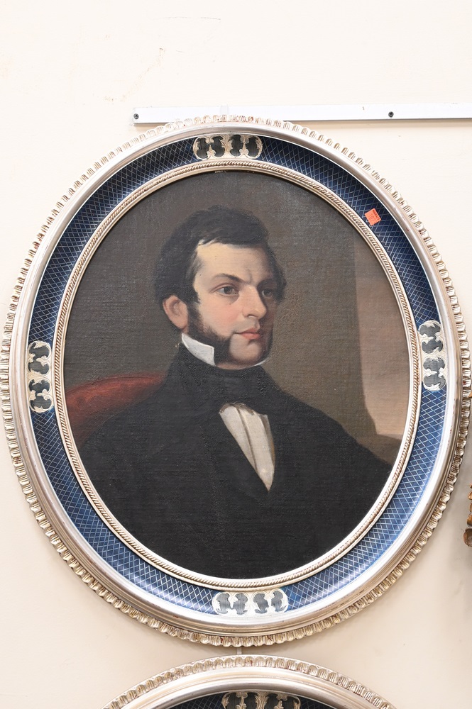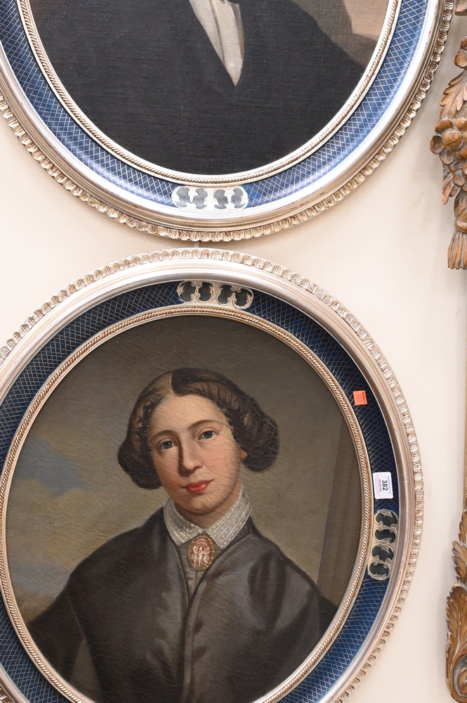 Lot 382: Pair of Victorian Oval Portraits, to include bust of a man and woman in blue and silver frame, 23 1/2″ x 19 1/4″.