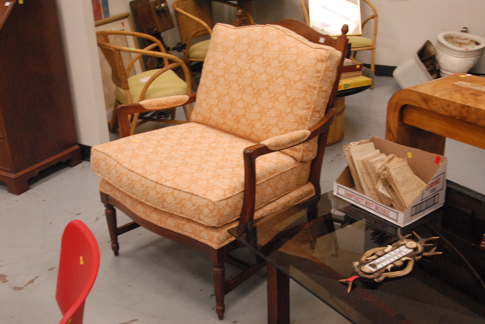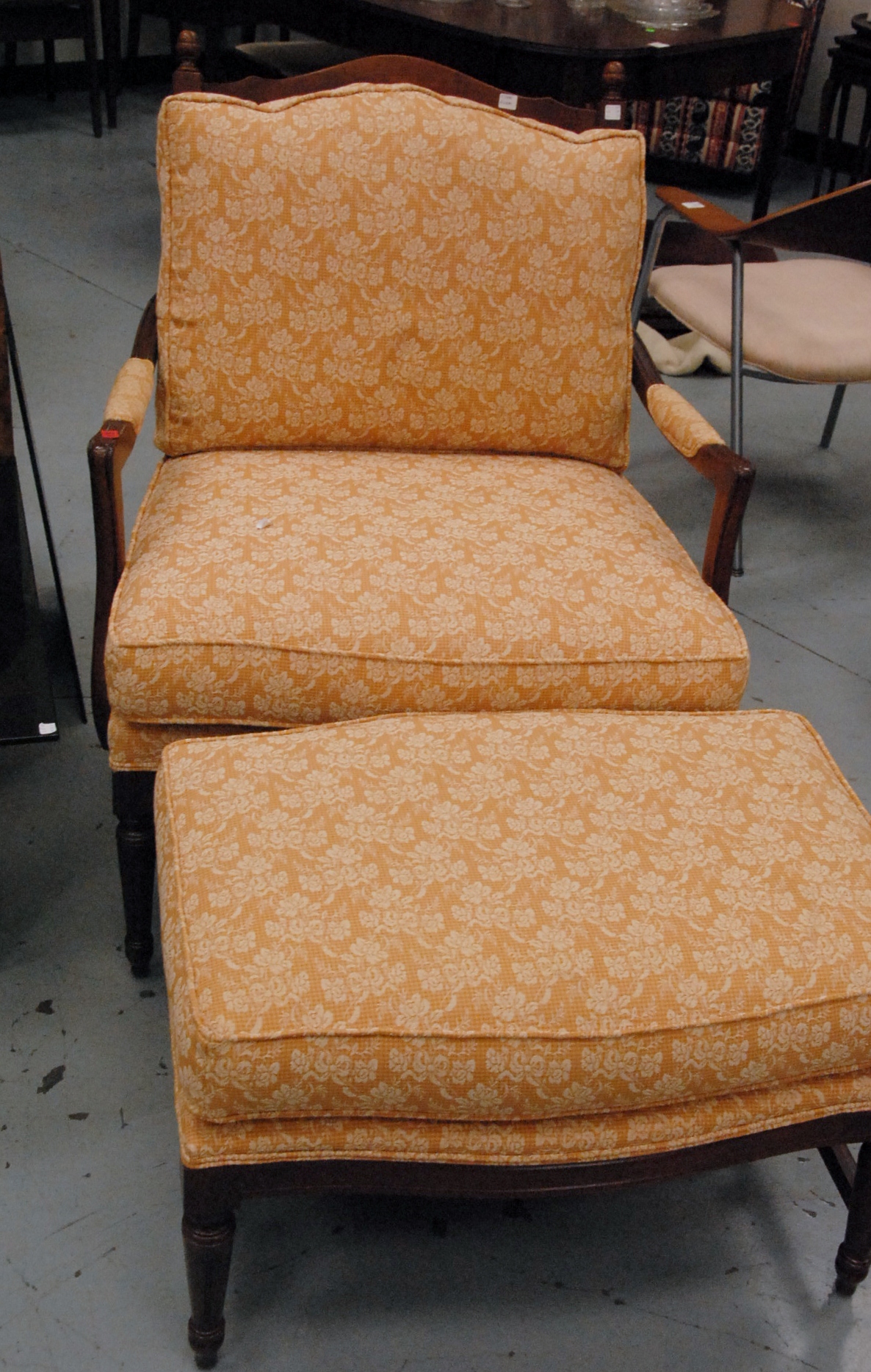 Three piece lot pair of Ethan Allen armchairs with upholstered seats and back and ottoman.