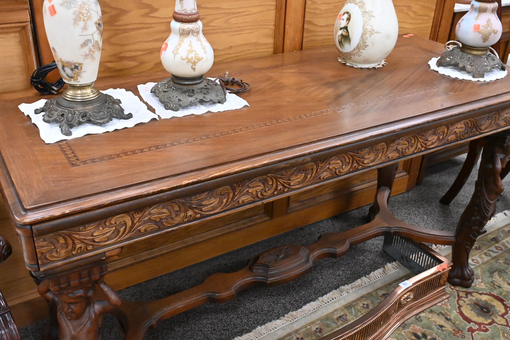 Walnut Extension Table, having caryatid supports, paw feet, and inlaid top, height 31 1/2 inches, top 24 1/2″ x 60″.