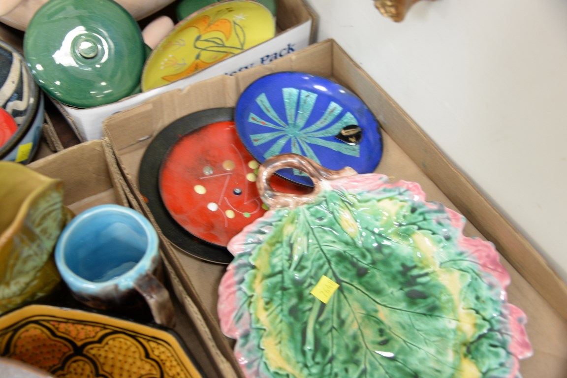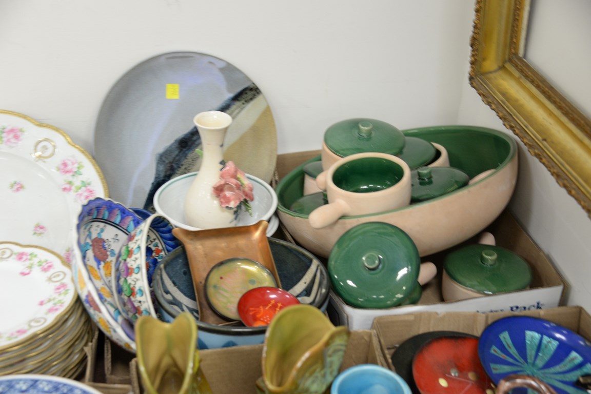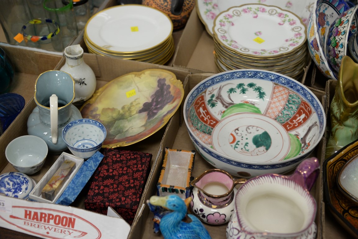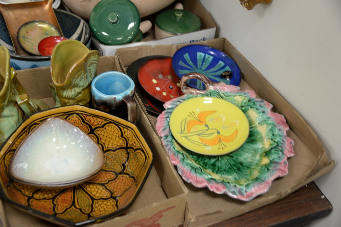 Lot 383: Eight box lots to include enameled dishes, Wildweed Aspen, Etruscan Majolica, soap stone seals, porcelain Asian bowl, etc.