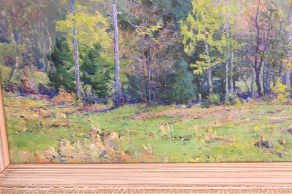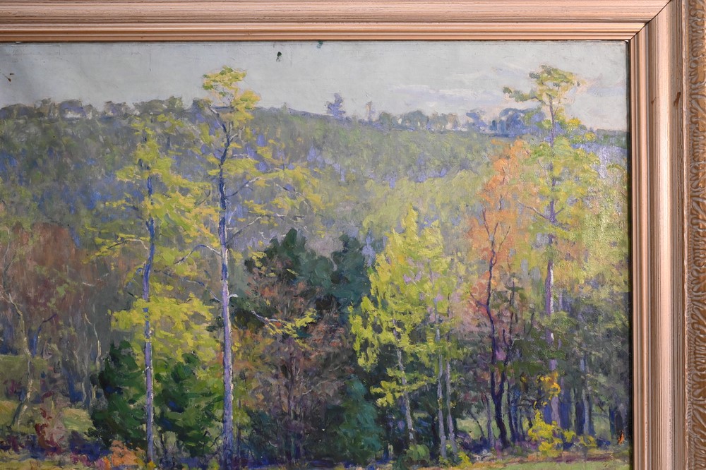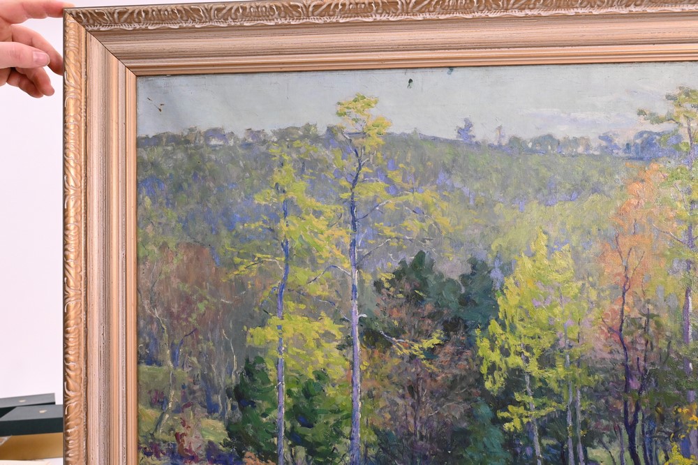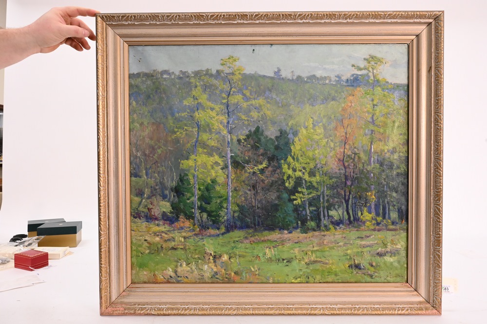 Lot 383: Harriet Randall Lumis (1870 – 1953), May in New England, oil on canvas, 24″ x 28″, signed lower right Harriet R. Lumis, titled and s…