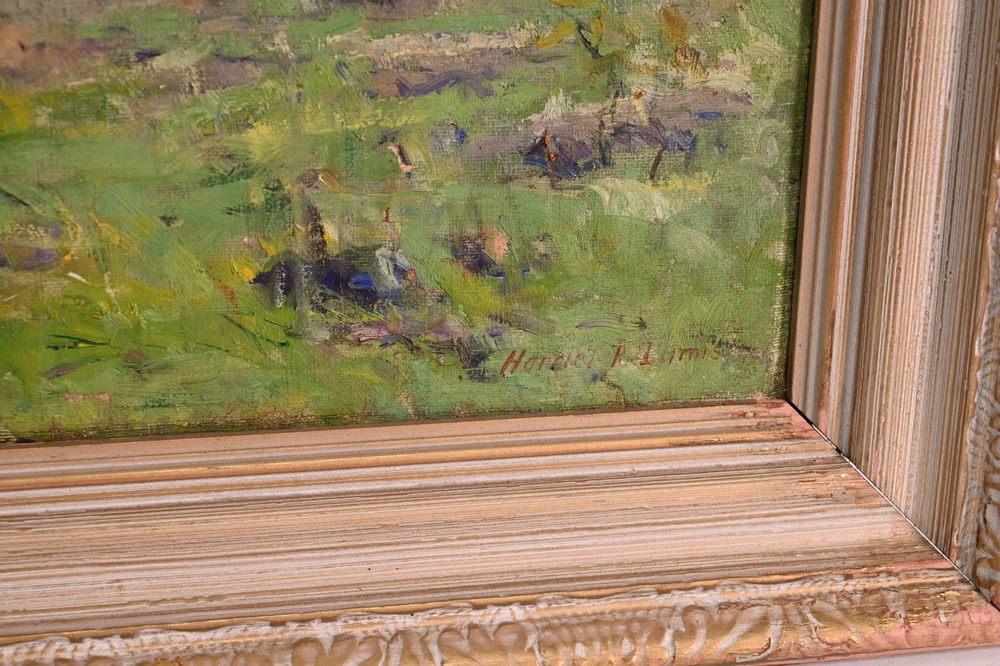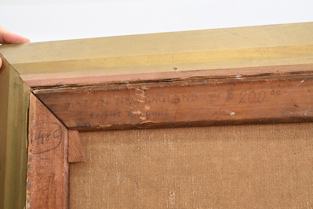 Harriet Randall Lumis (1870 – 1953), May in New England, oil on canvas, 24″ x 28″, signed lower right Harriet R. Lumis, titled and signed on stretcher.