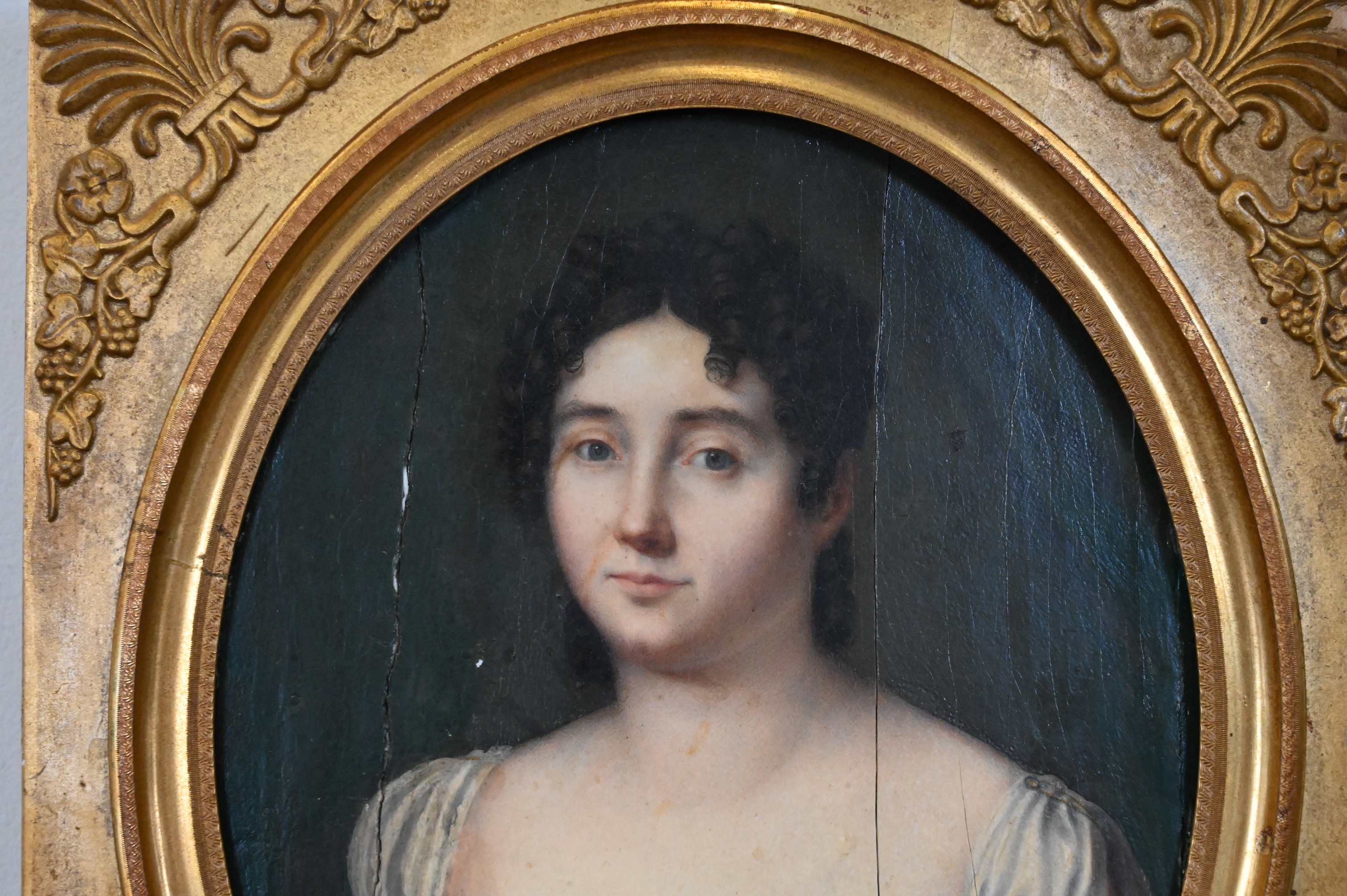 Oil on wood panel board, presented in gilt gesso Empire-style frame