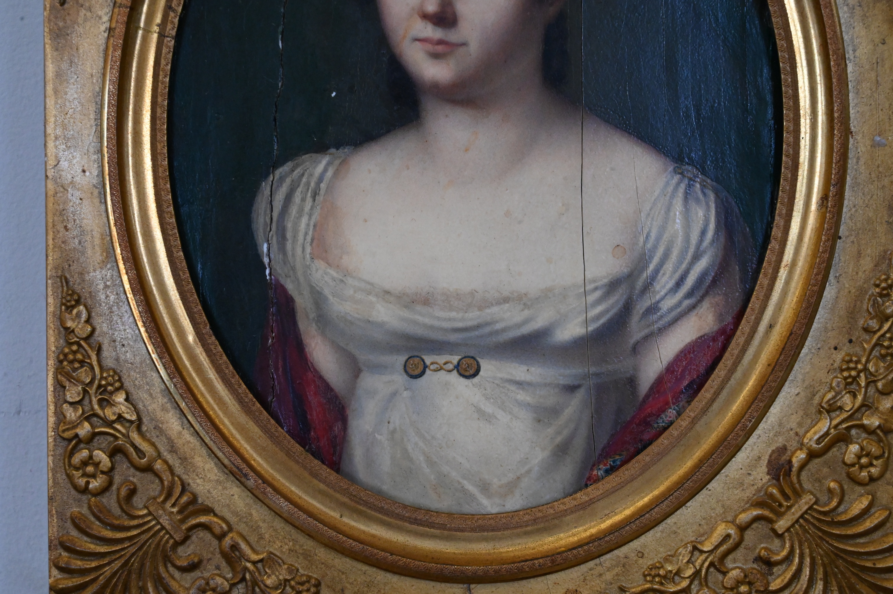 Oval portrait of a young woman wearing a white Empire-style gown fastened with gilt clasps and a red shawl draped over her shoulders, set against a dark green ground; the sitter’s serene expression and delicate modeling reflect the refined neoclassical portrait tradition of post-Napoleonic France