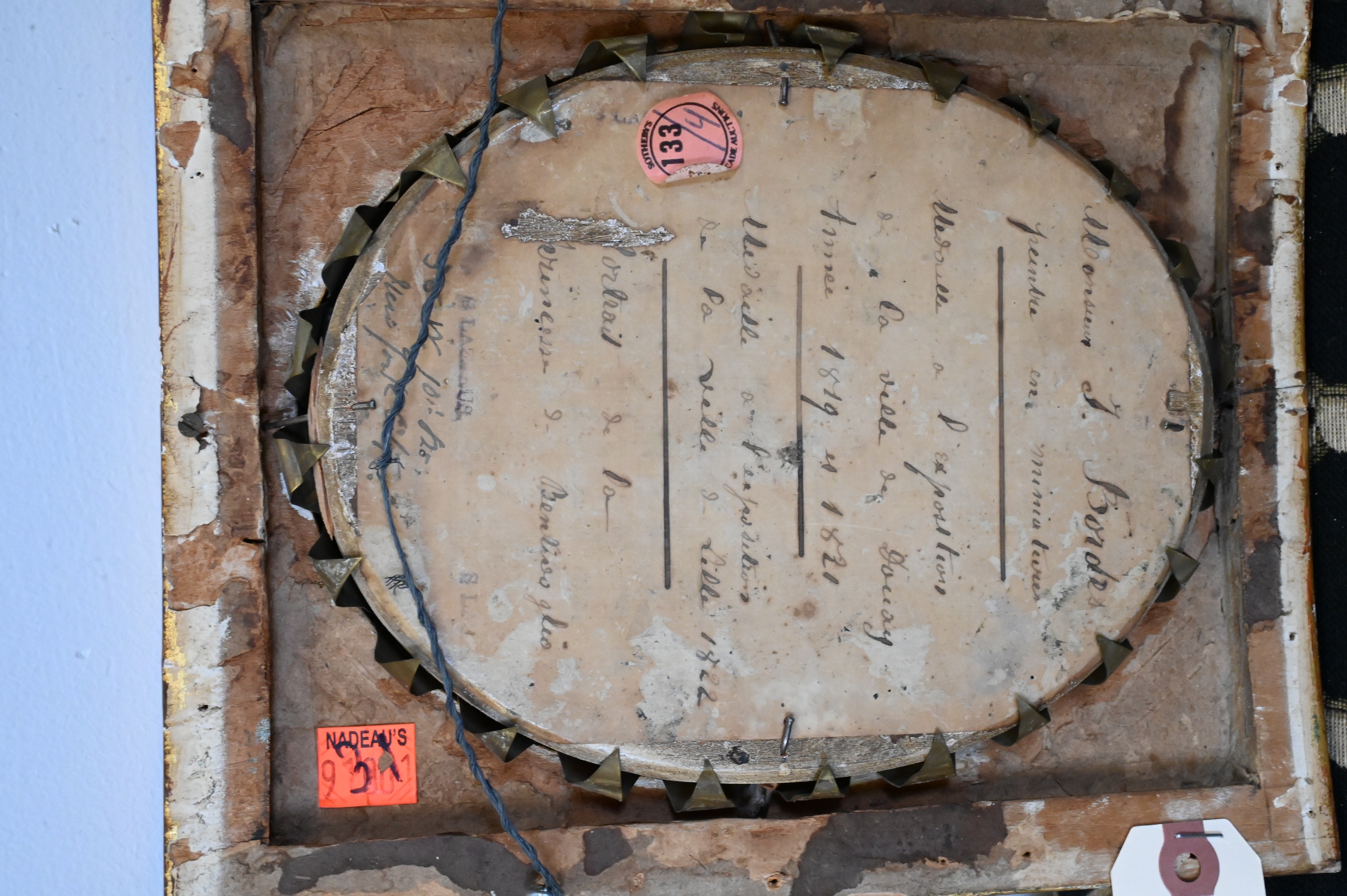 The reverse inscribed identifying the artist as Monsieur J. Bordes, peintre en miniature, noting medals from the 1849 and 1852 exhibitions in Douai, and referencing a portrait of the Princess of Bentheim
