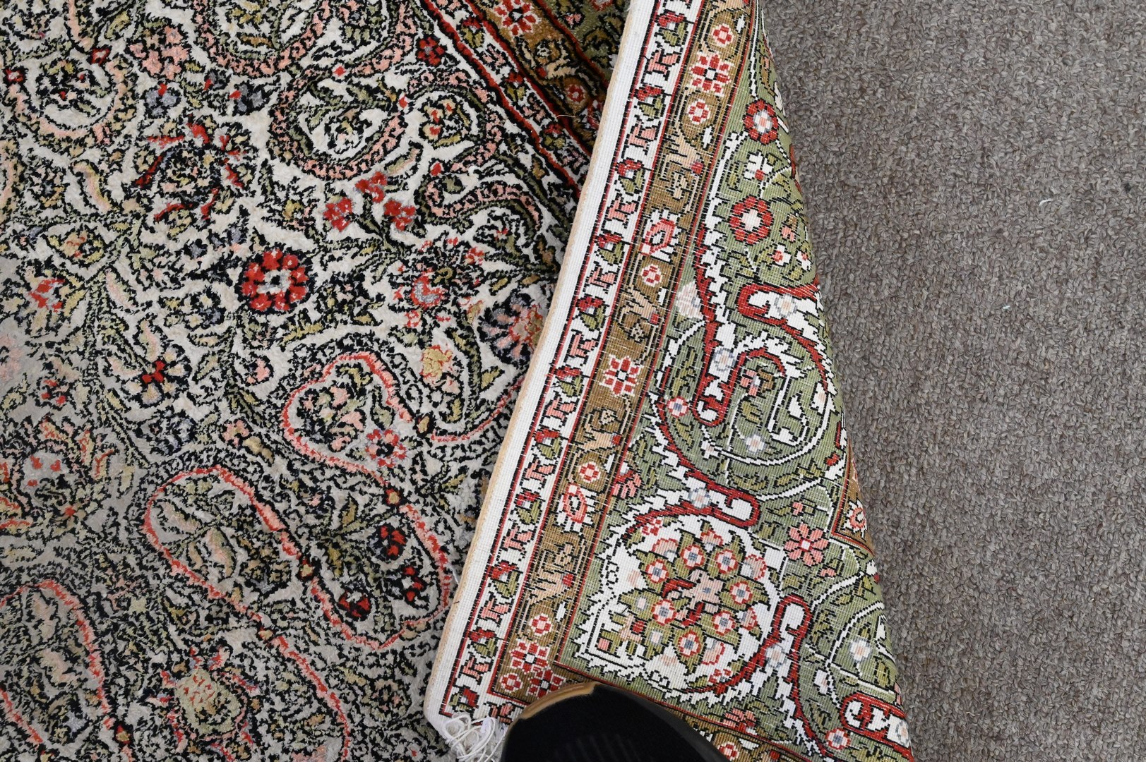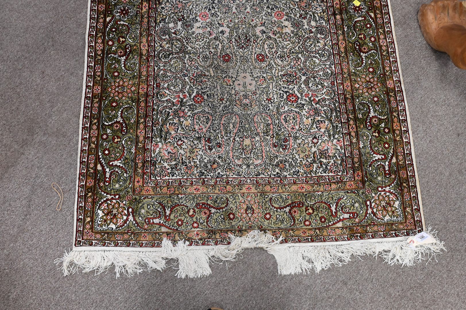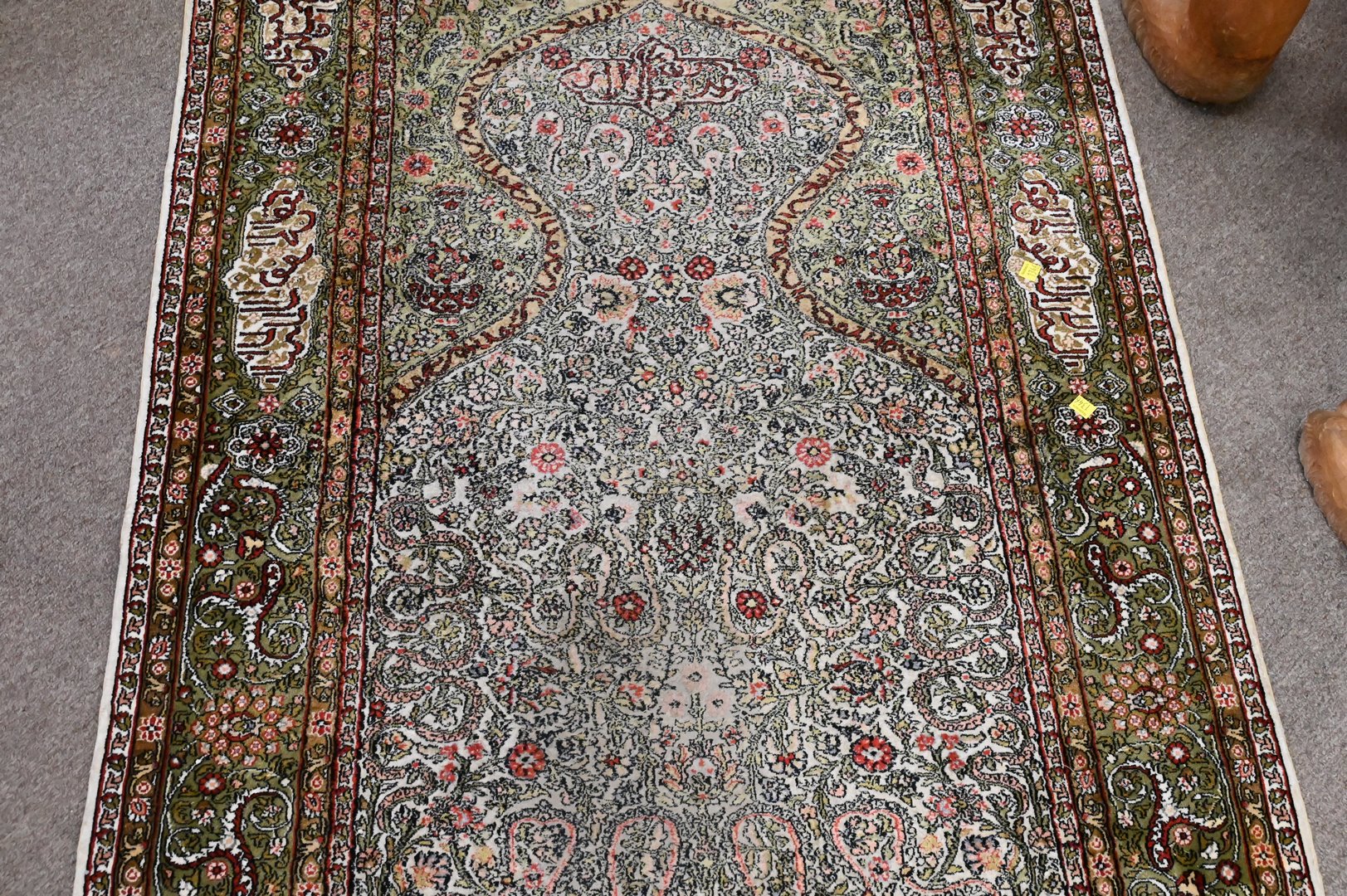 Oriental Silk Throw Rug, signed on border, 3′ 2″ x 5′.