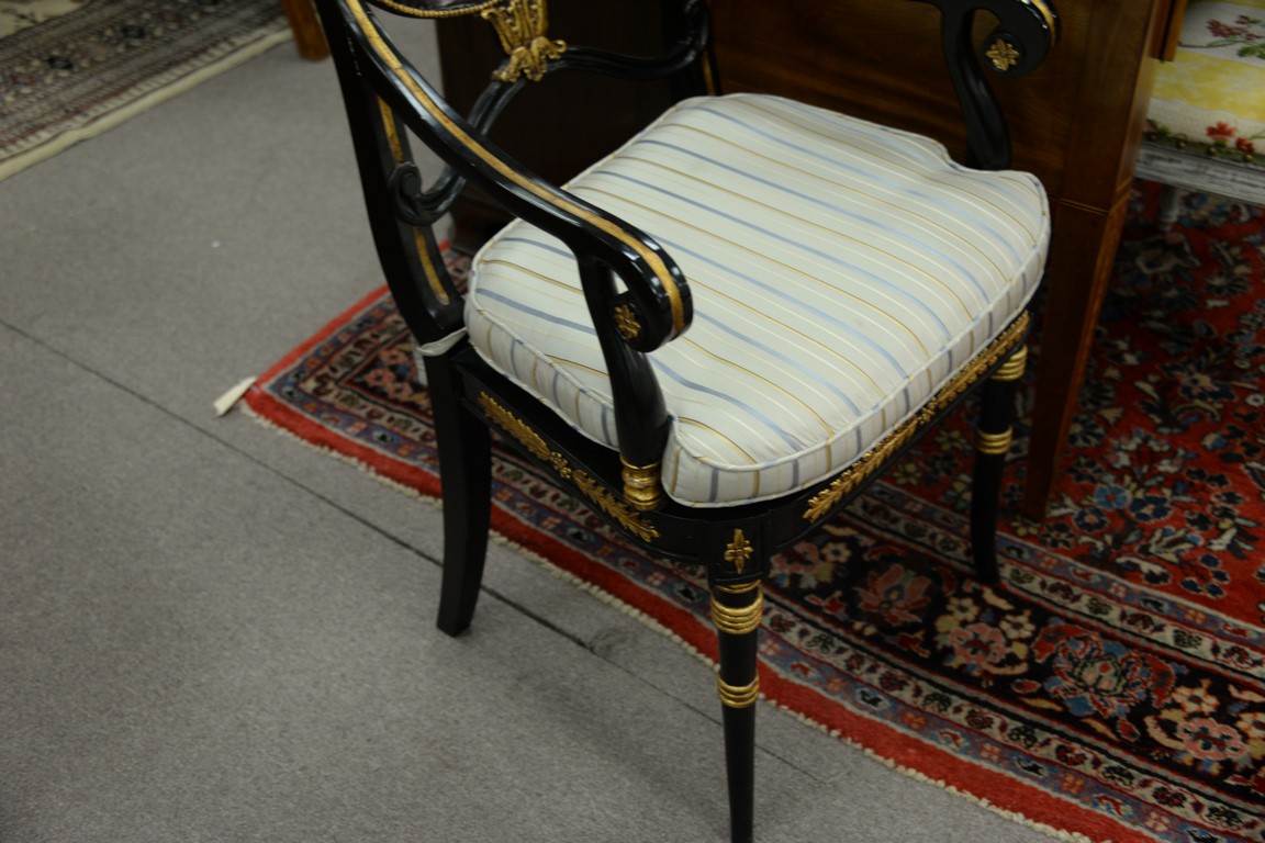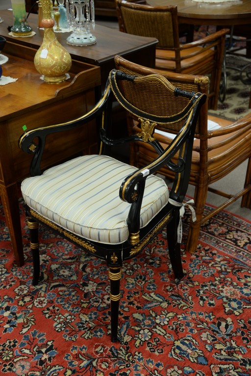 Pair of decorative armchairs with caned seats and custom upholstered cushions.