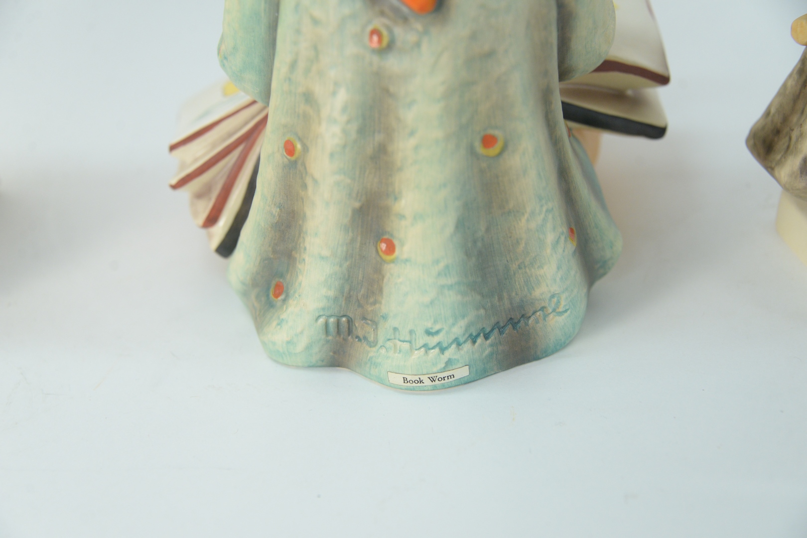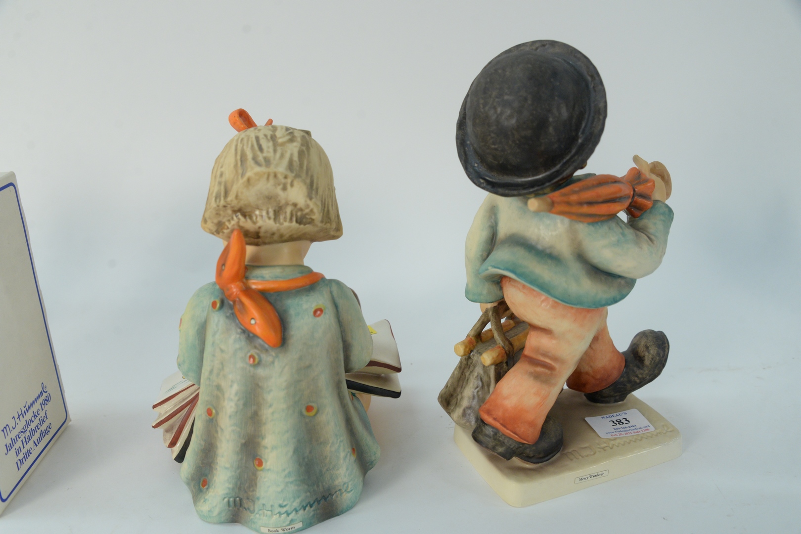 Lot 383: Pair of Large Hummel’s, to include ‘Bookworm’ and ‘Merry Traveler’, each inscribed along the base and marked to the underside, heights 8 1/2 inches and 9 1/2 inches.