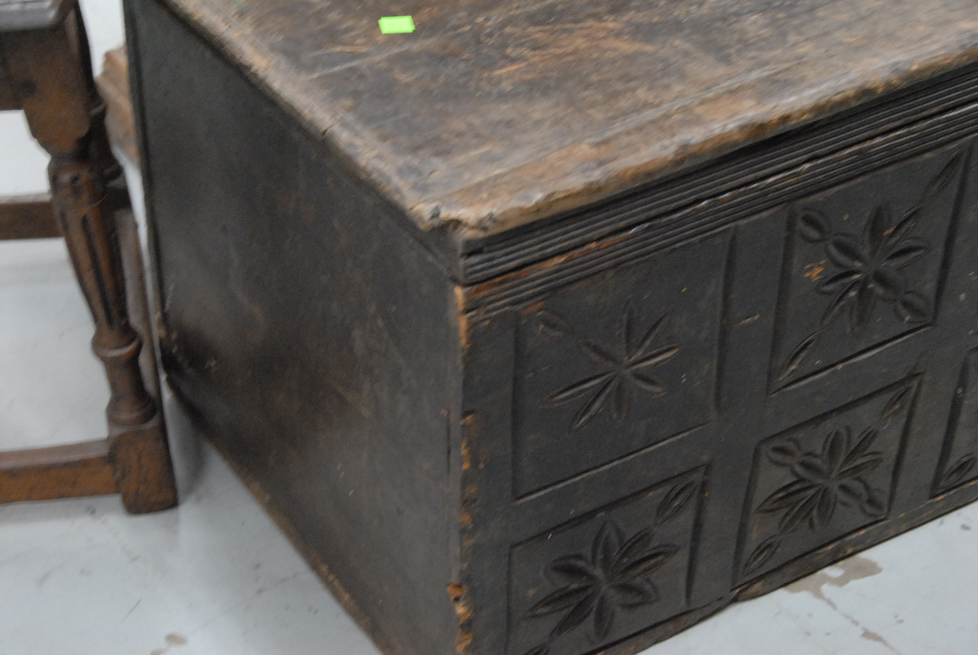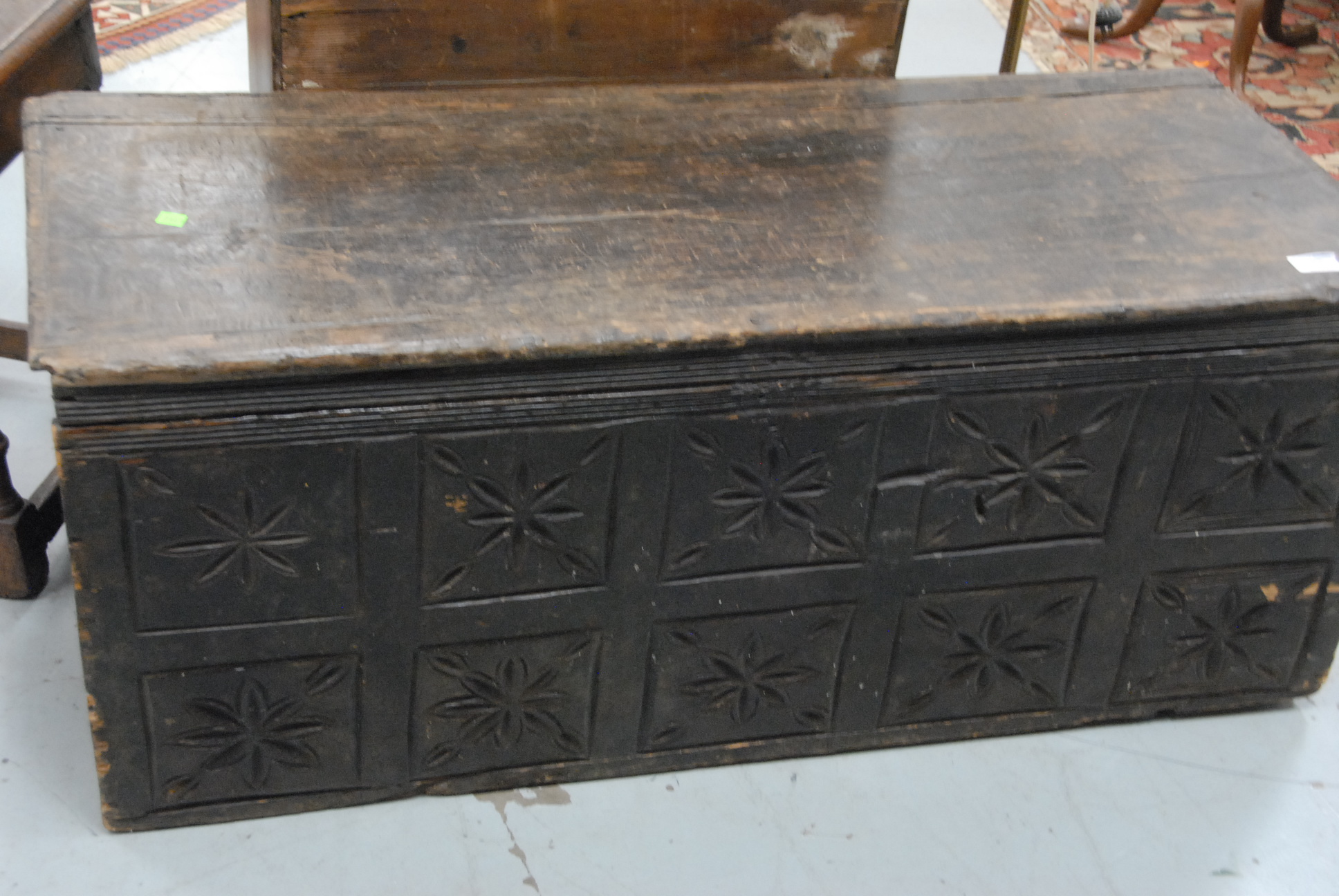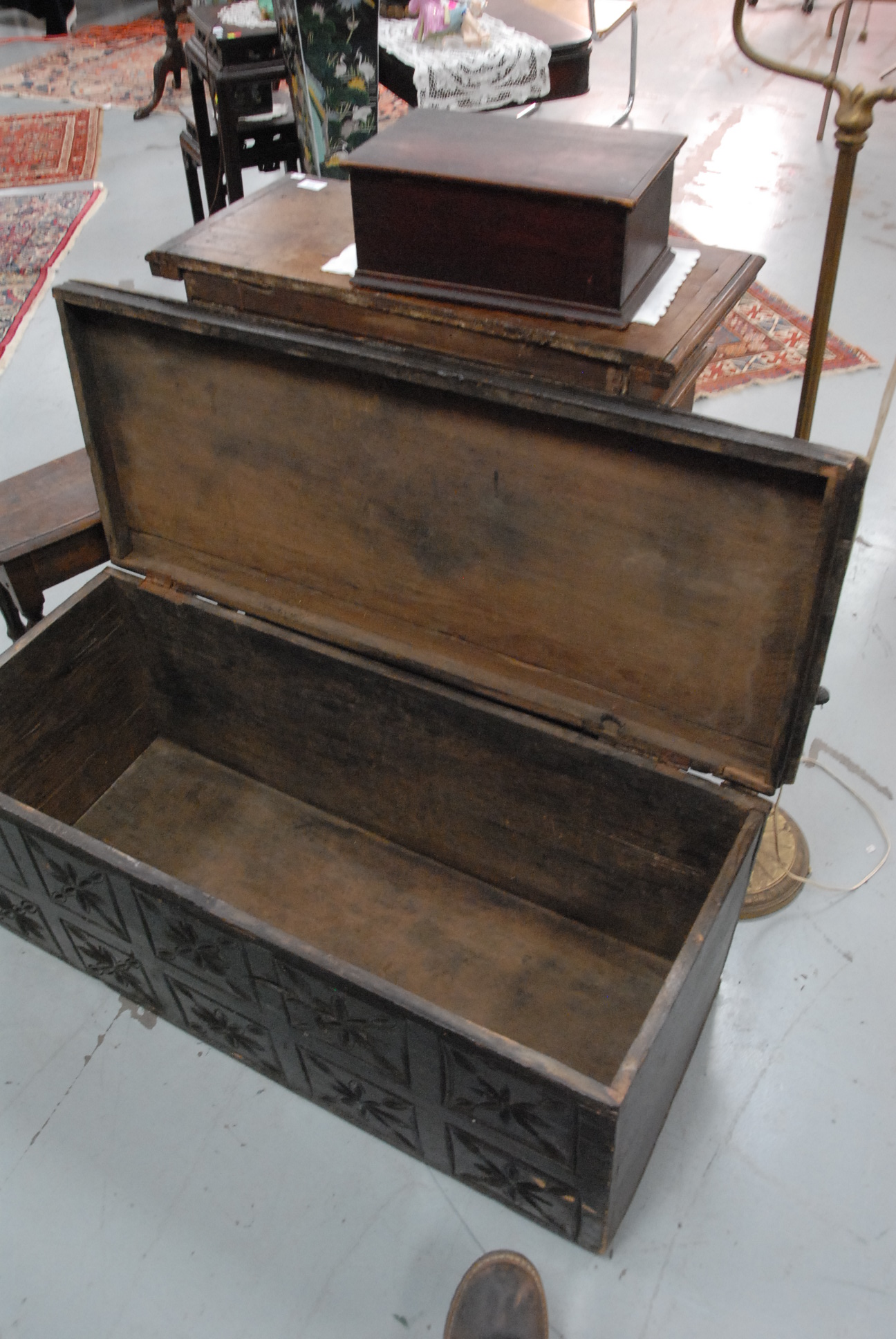 Lot 383: Primitive lift top chest, front with carved squares and stars. ht. 18in. wd. 44in.