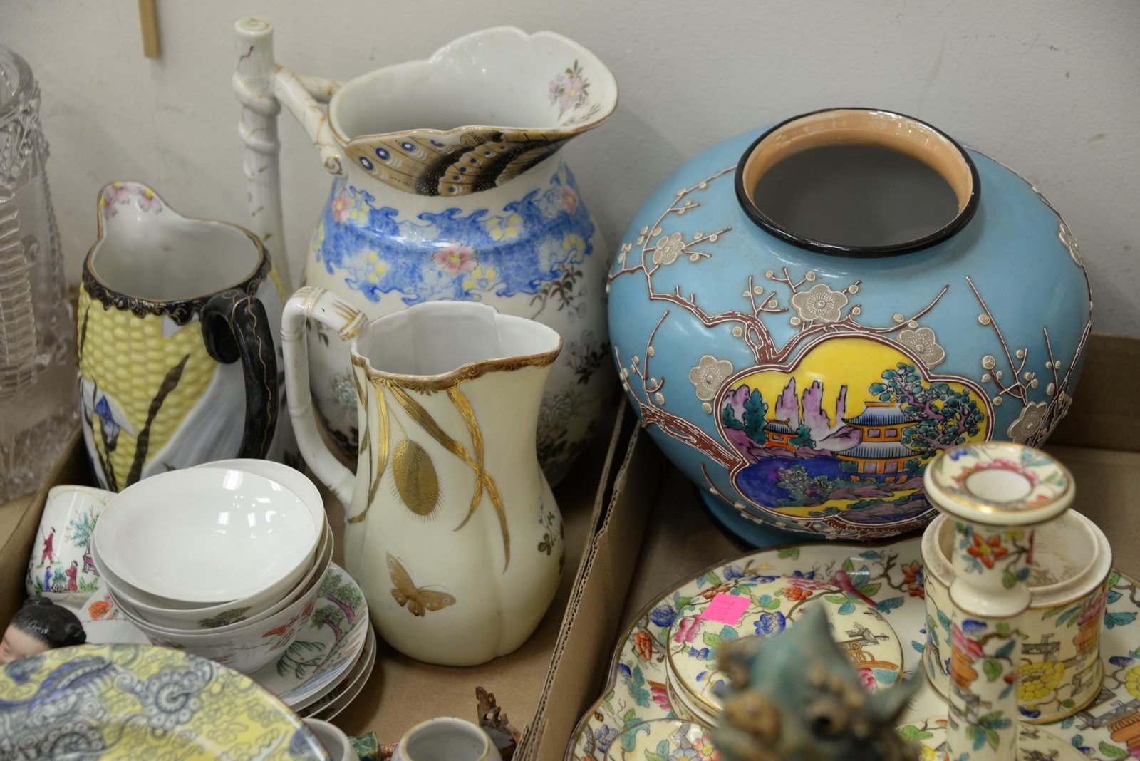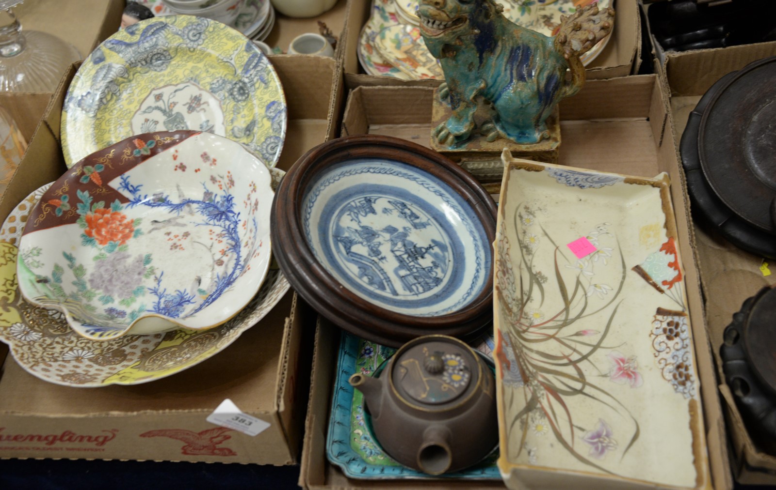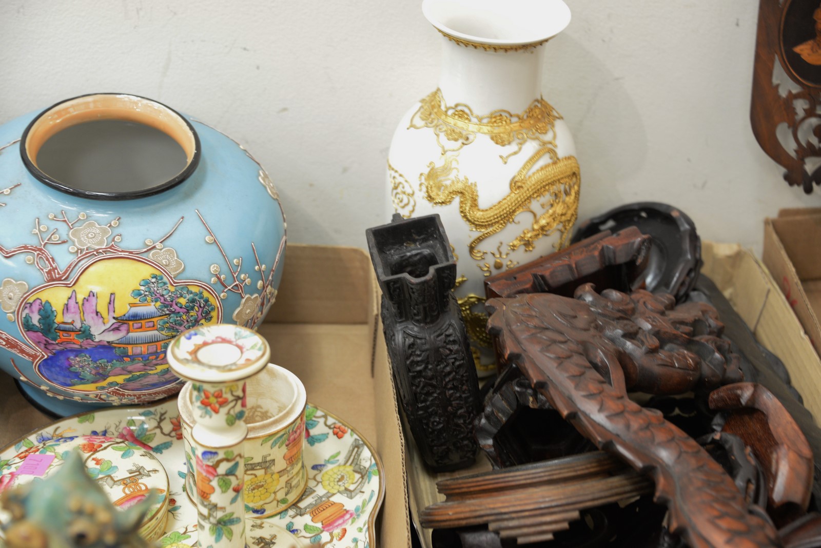 Lot 383: Six box lots of Oriental items to include two boxes of carved wood stands, Canton plate, three porcelain pitchers, and several platt…