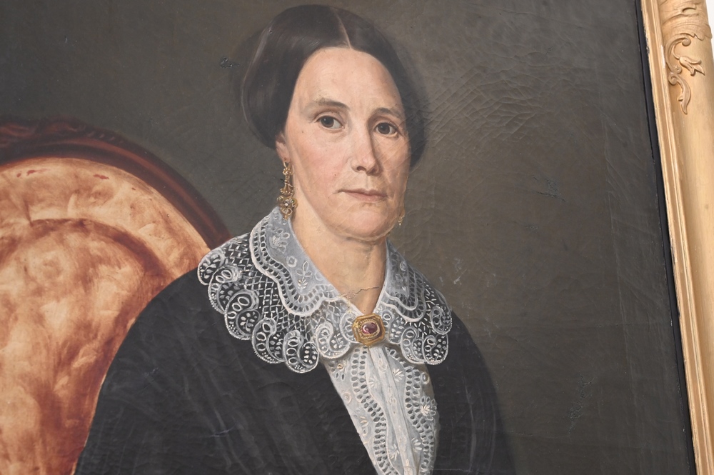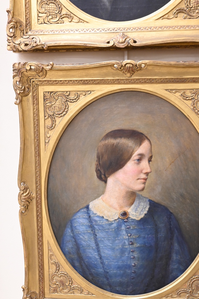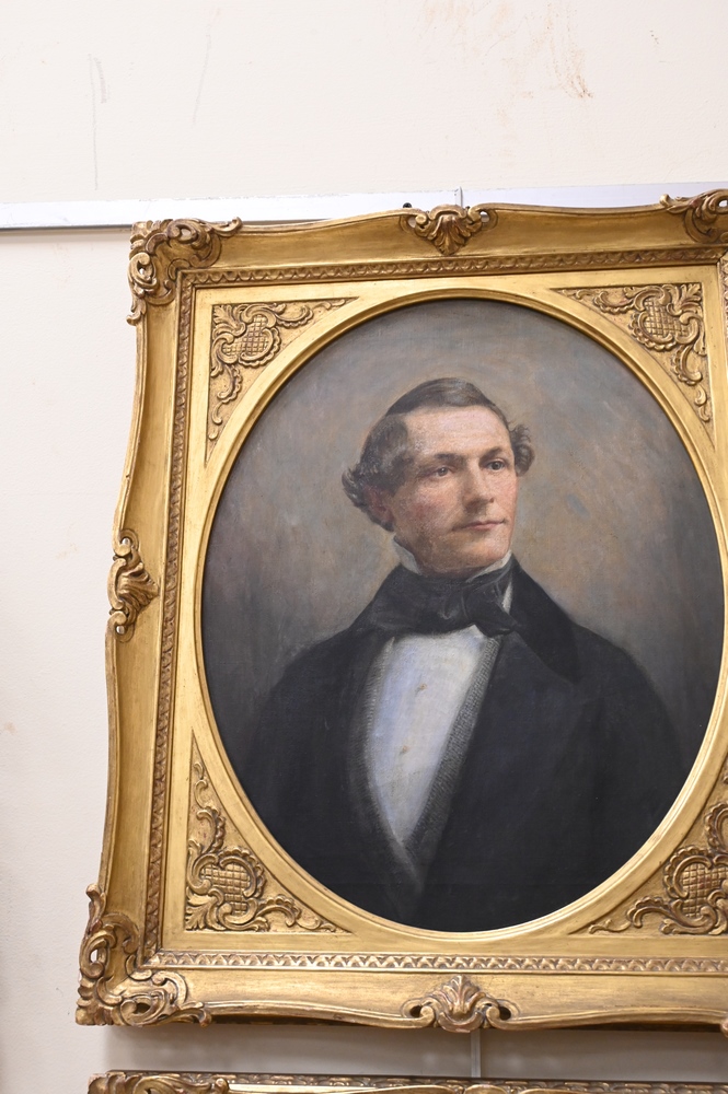 Lot 383: Three Portraits, to include pair of oval wedding portraits in gold frames, along with a large portrait of a woman wearing black, 19th century, wedding 20″ x 16″, wearing black 35″ x 29″.