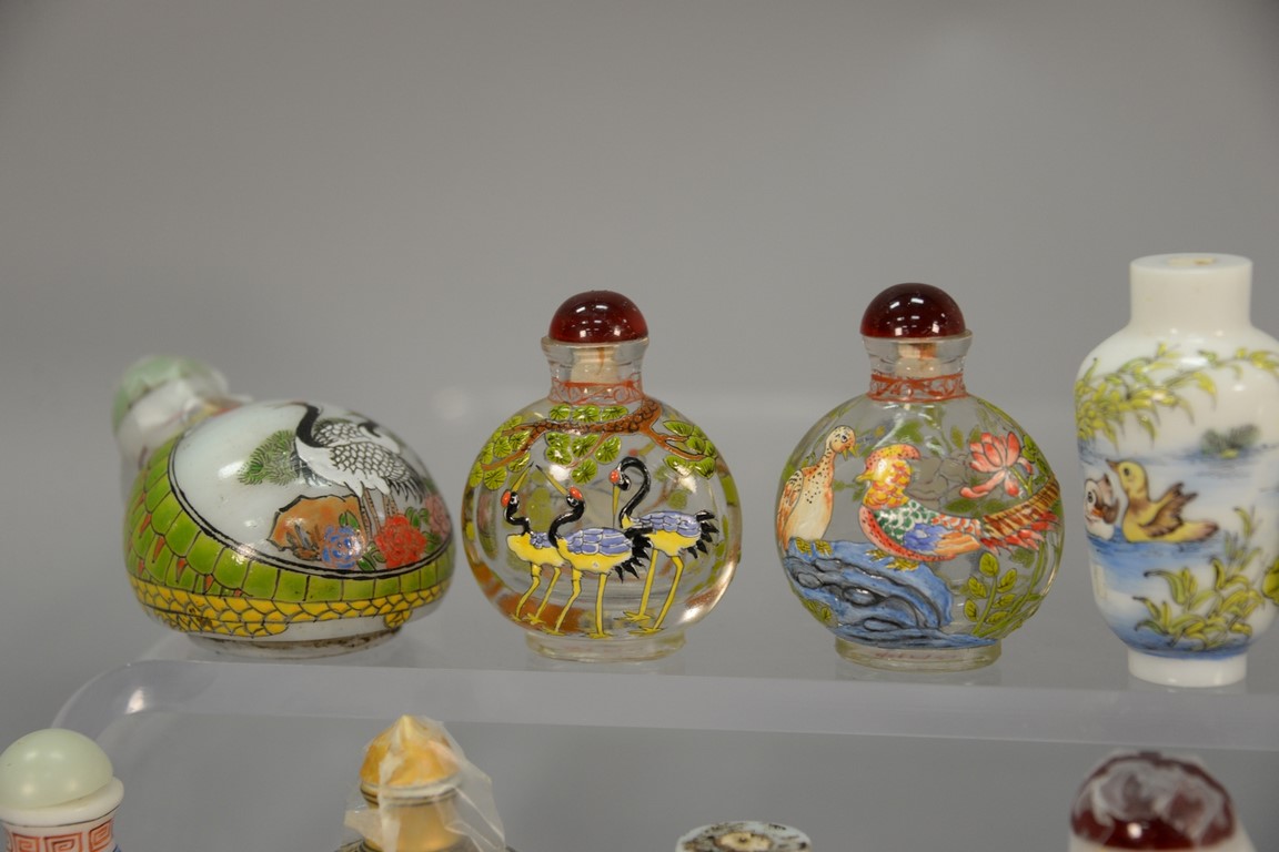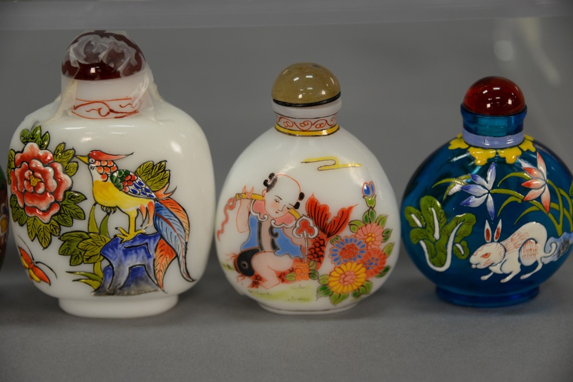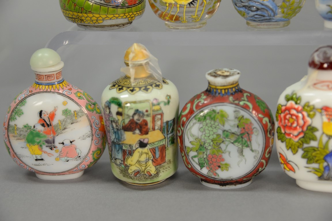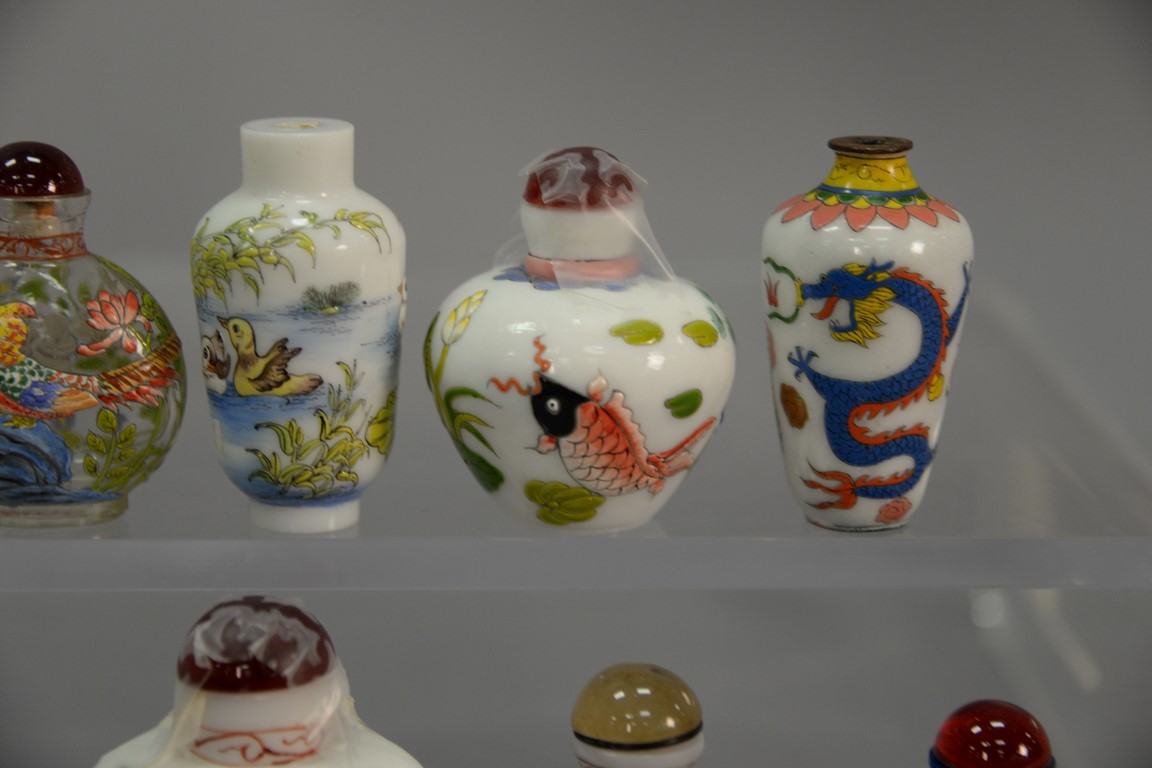 Twelve enameled glass and porcelain snuff bottles. ht. 2 1/2in. to 3 1/4in.