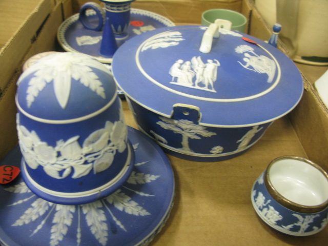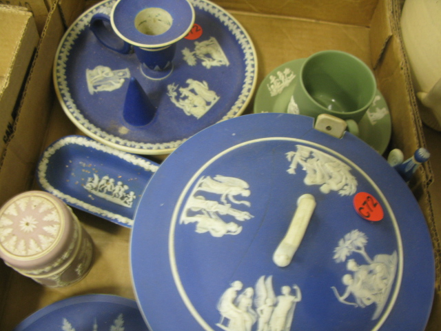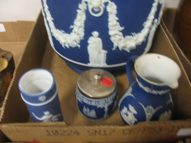 Two box lots of Wedgwood including a jardinire, covered dish, candlestick, pitcher and misc.