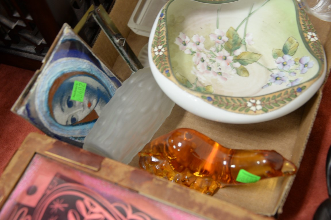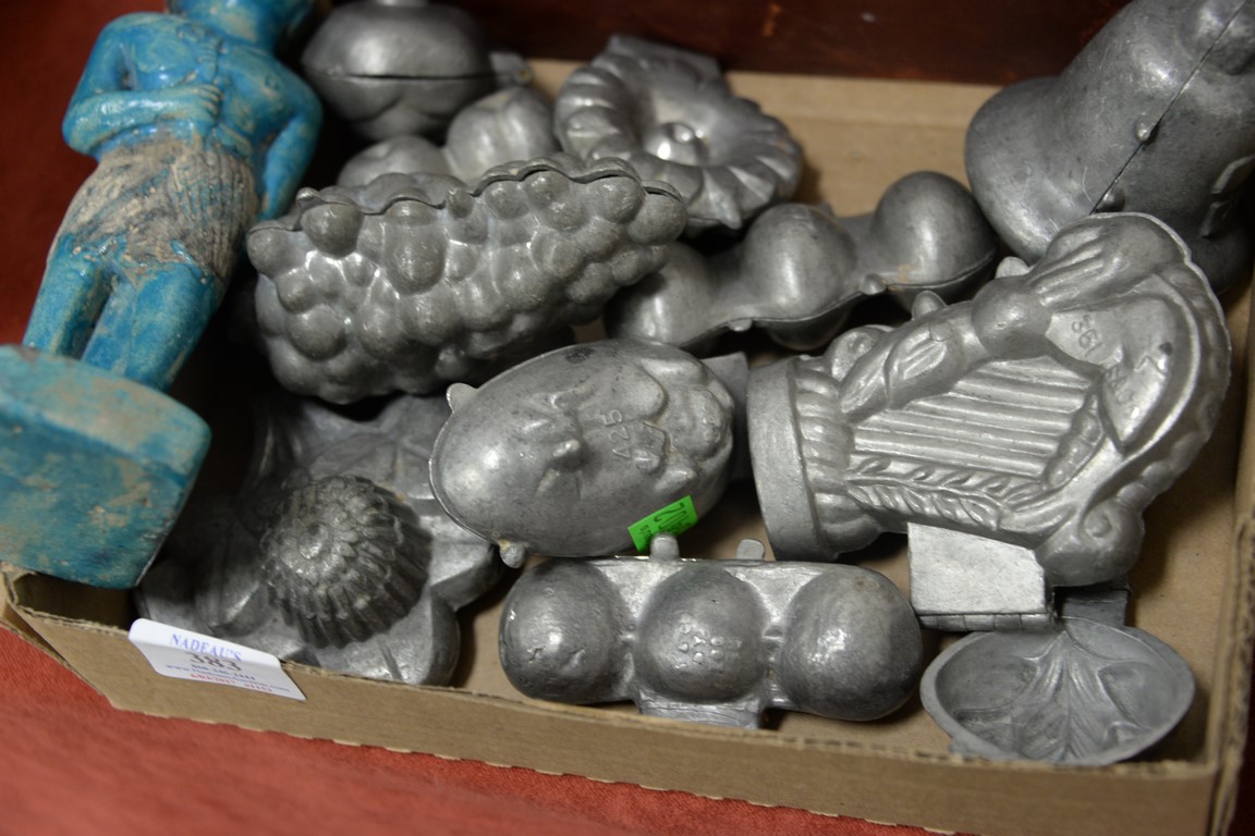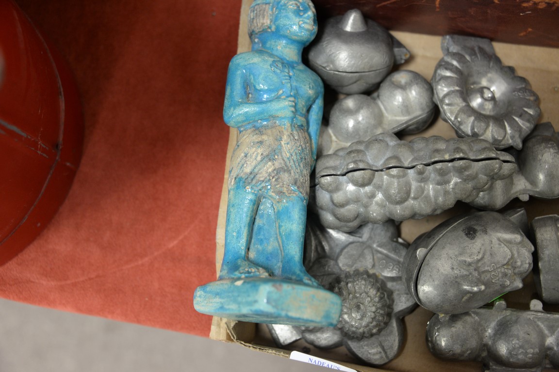 Two box lots to include eleven antique lead chocolate or ice cream molds, Edward Winter enameled plaque, Schoenberg enameled plaque, Nippon dish, and blue glazed Egyptian figure.
