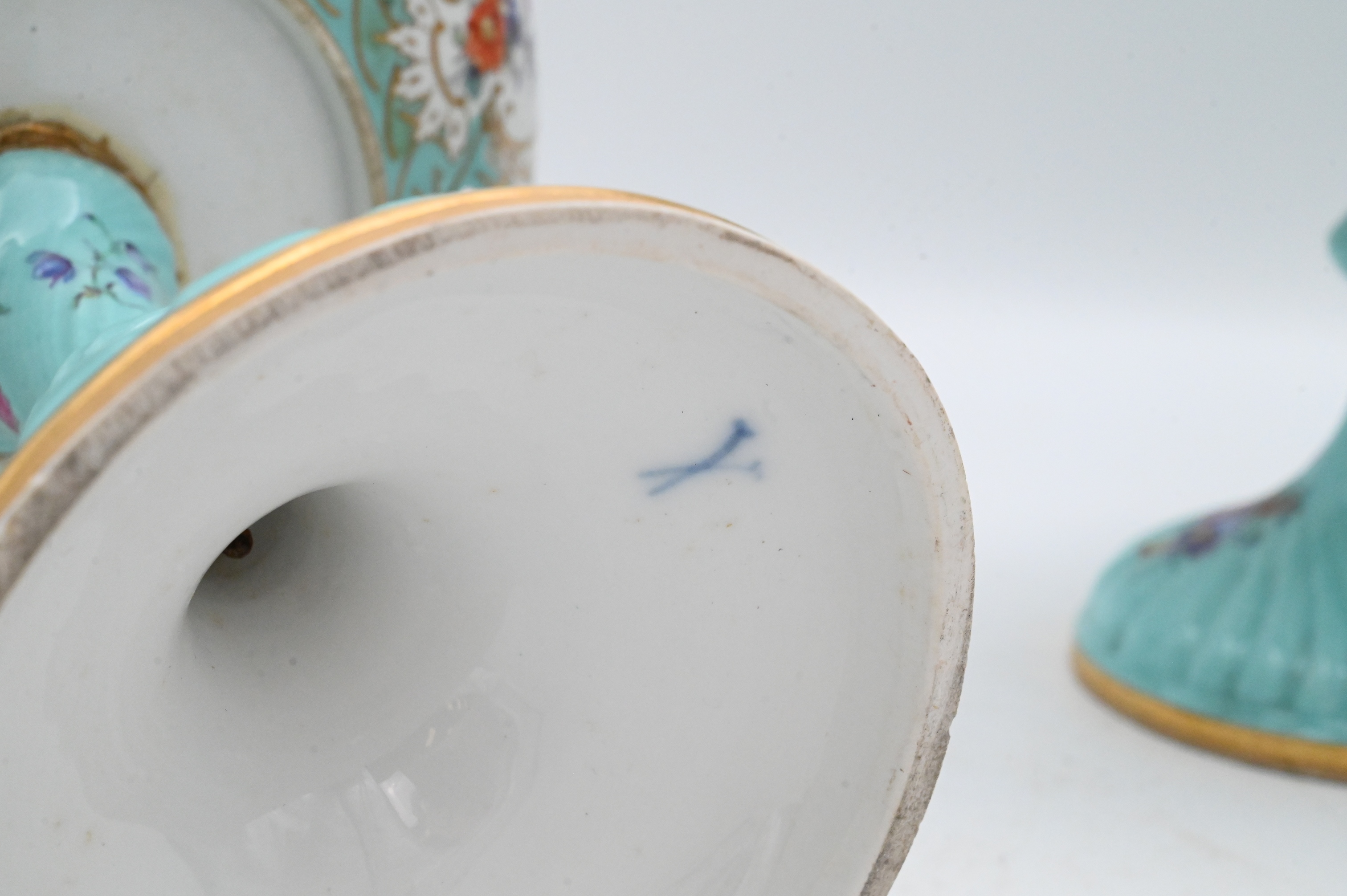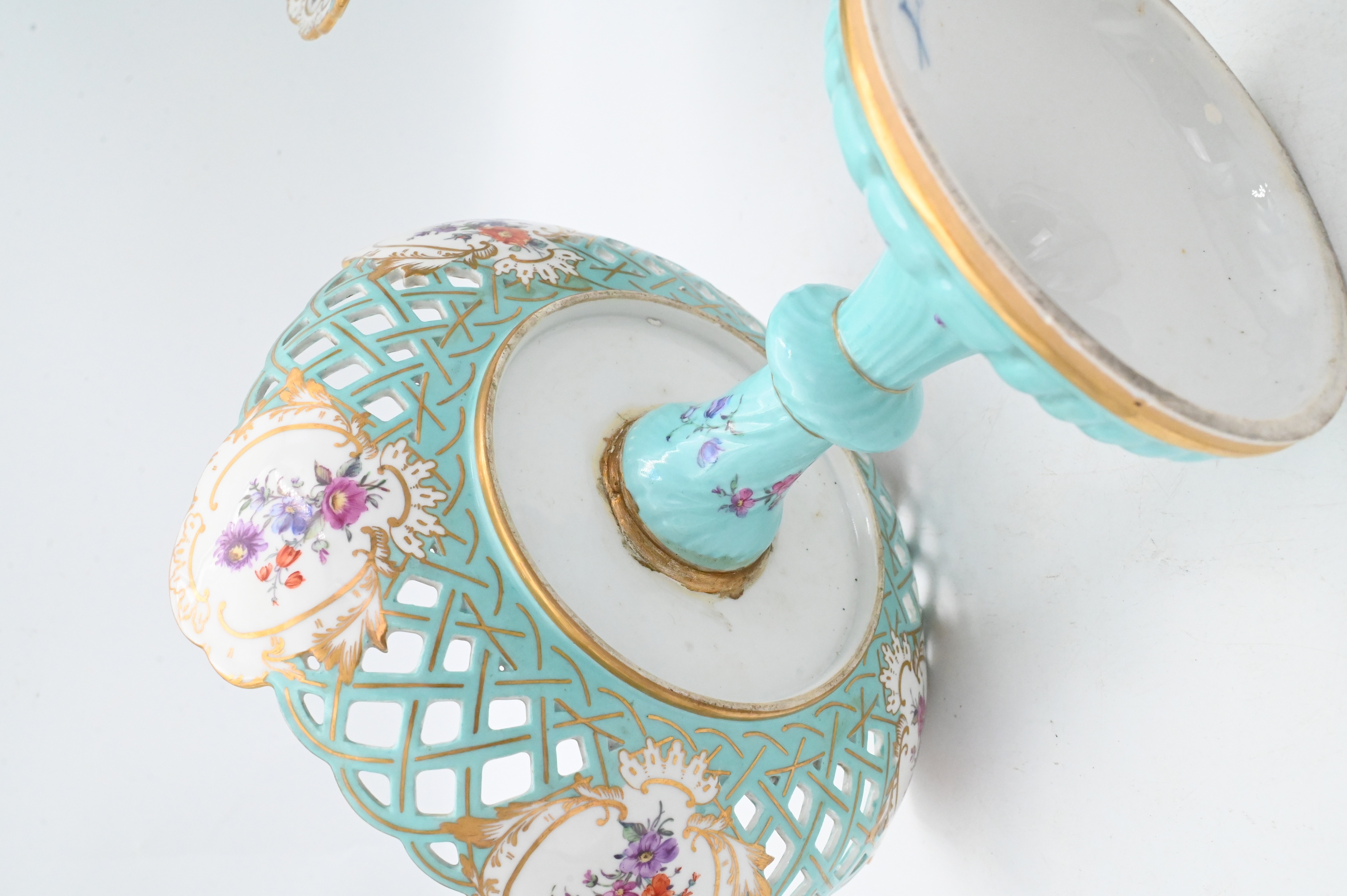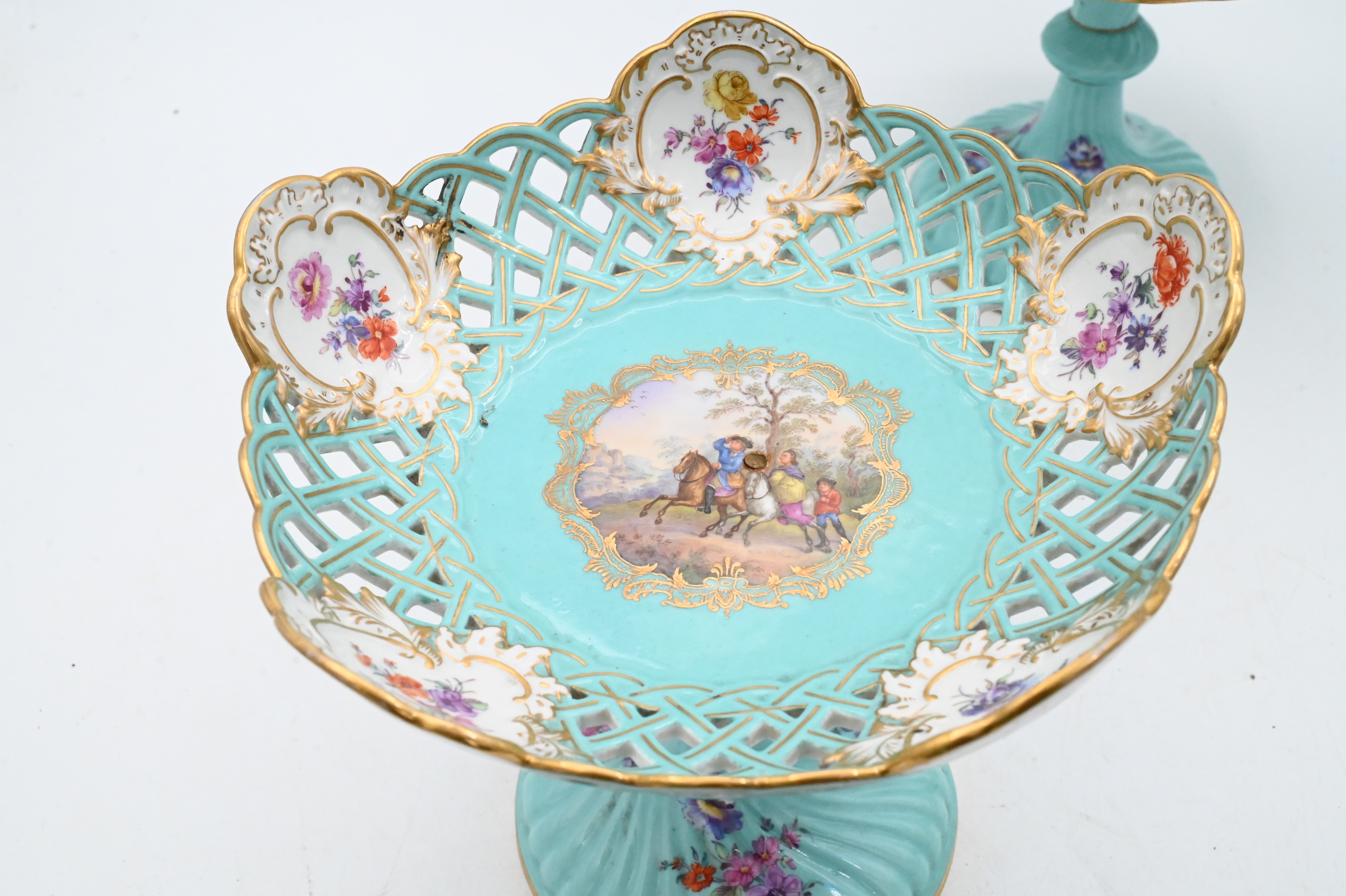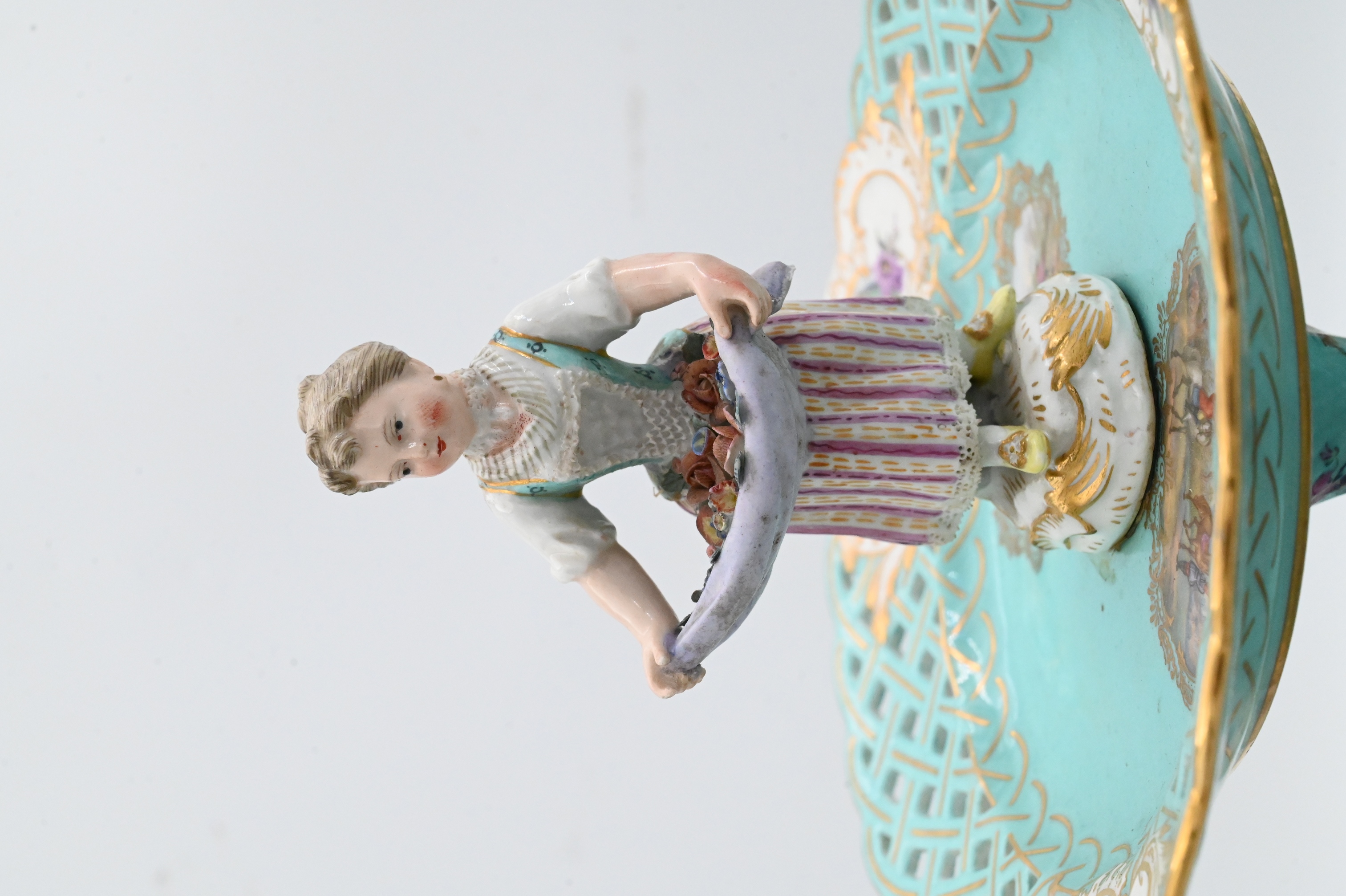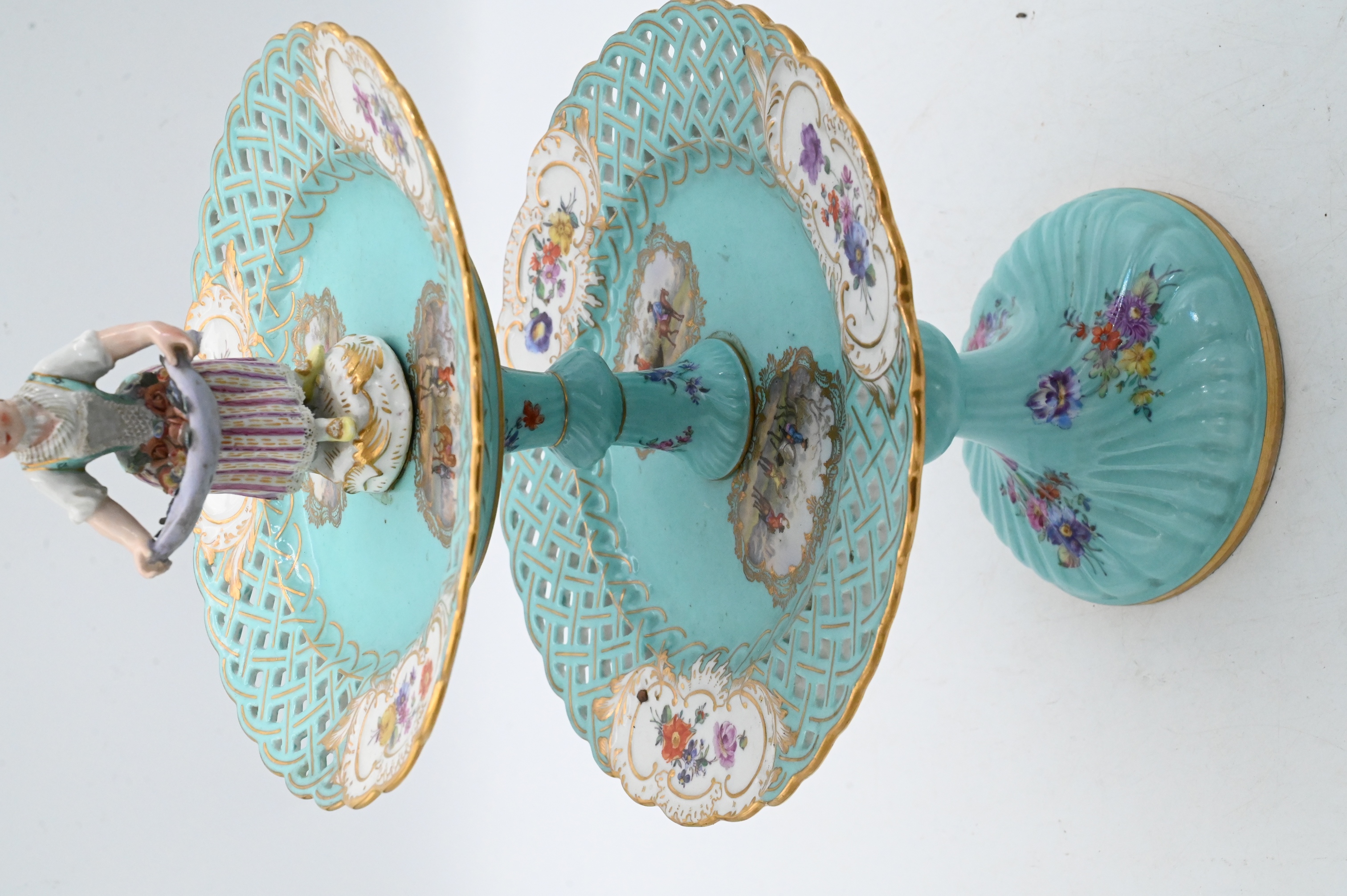 A fine pair of Meissen porcelain pedestal compotes, one surmounted by a standing female figure with basket, both with turquoise lattice work borders, gilt highlights, and hand-painted reserves of floral sprays and figural scenes. Each base with underglaze blue crossed swords mark.