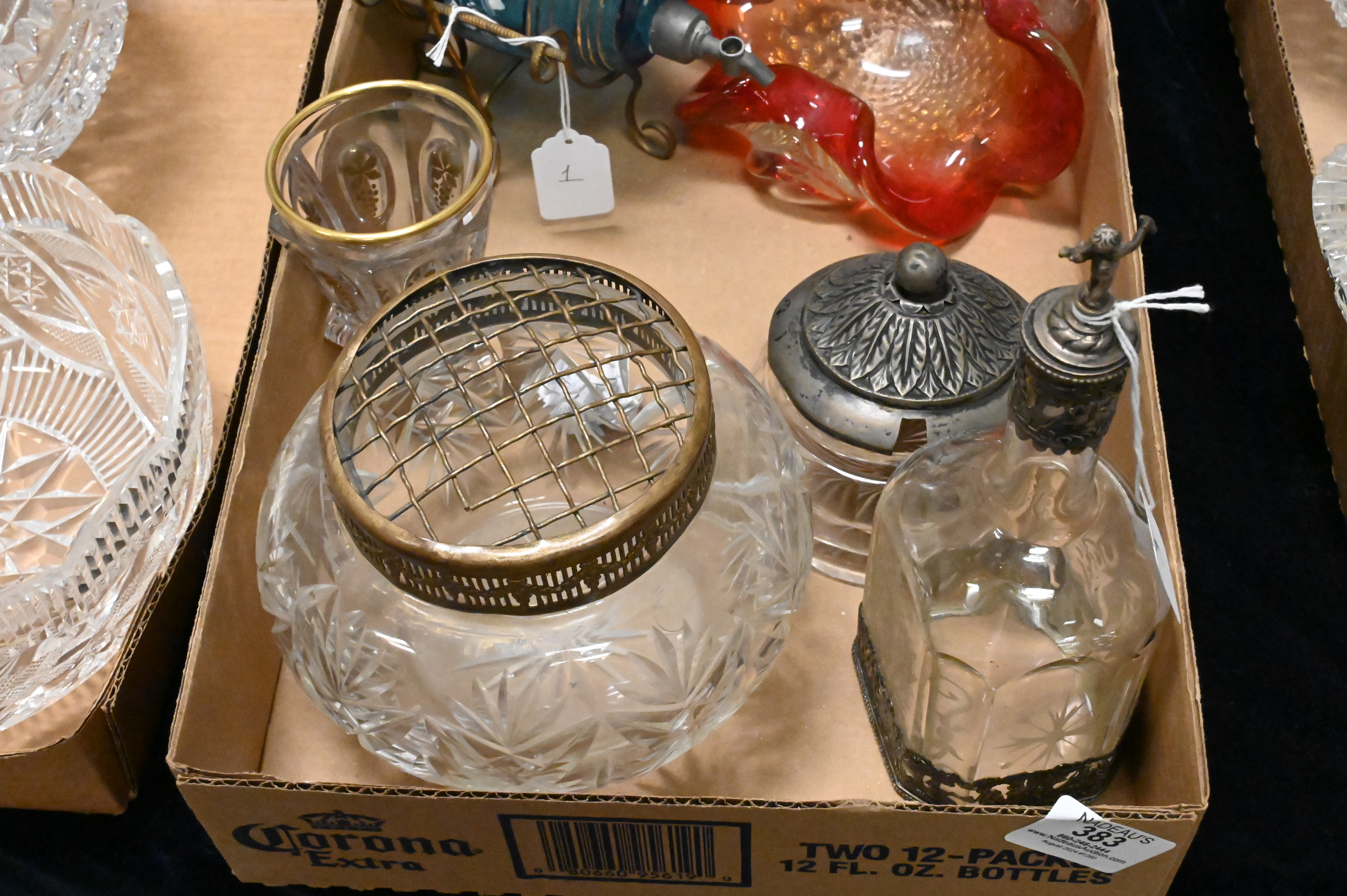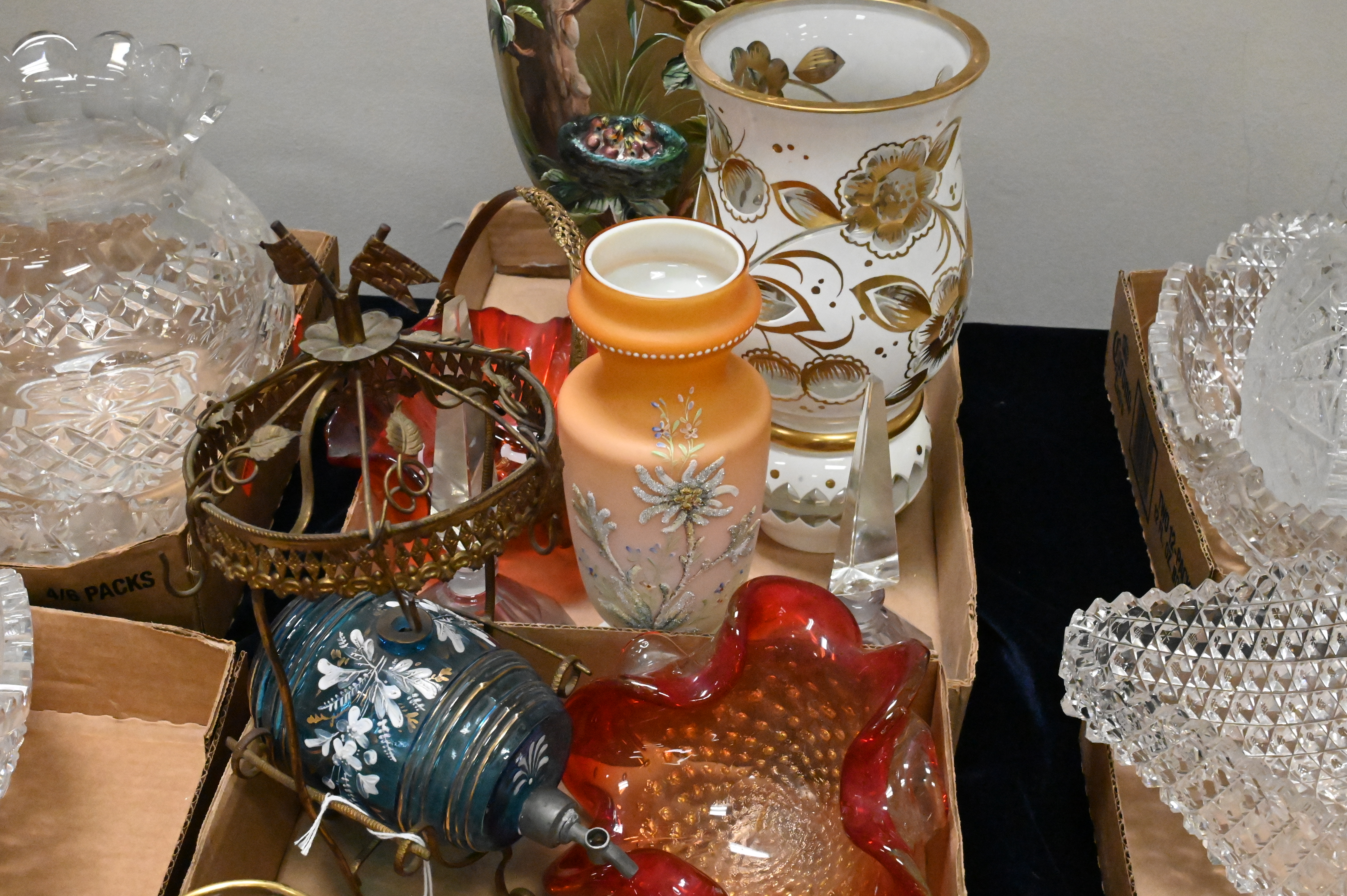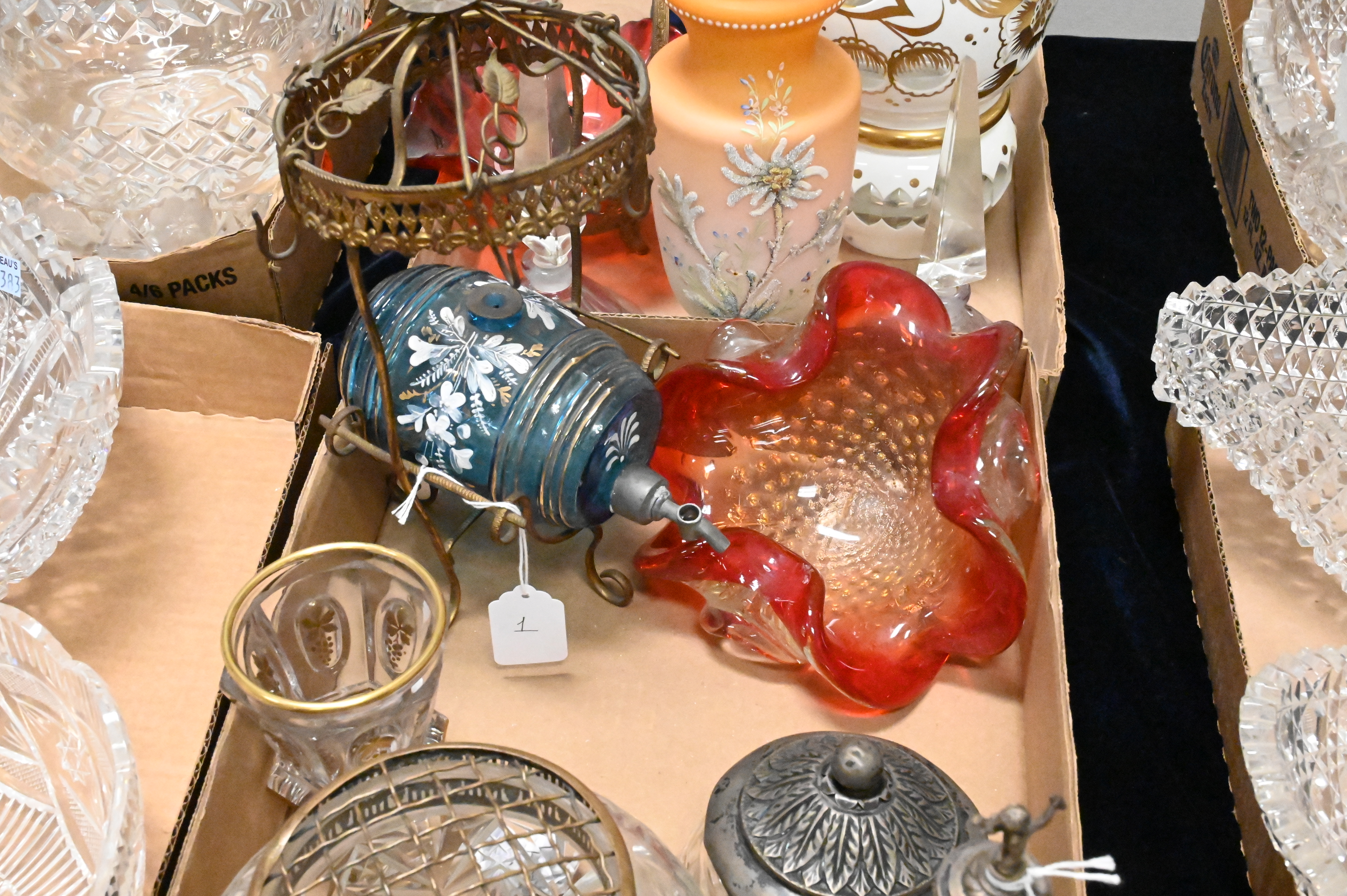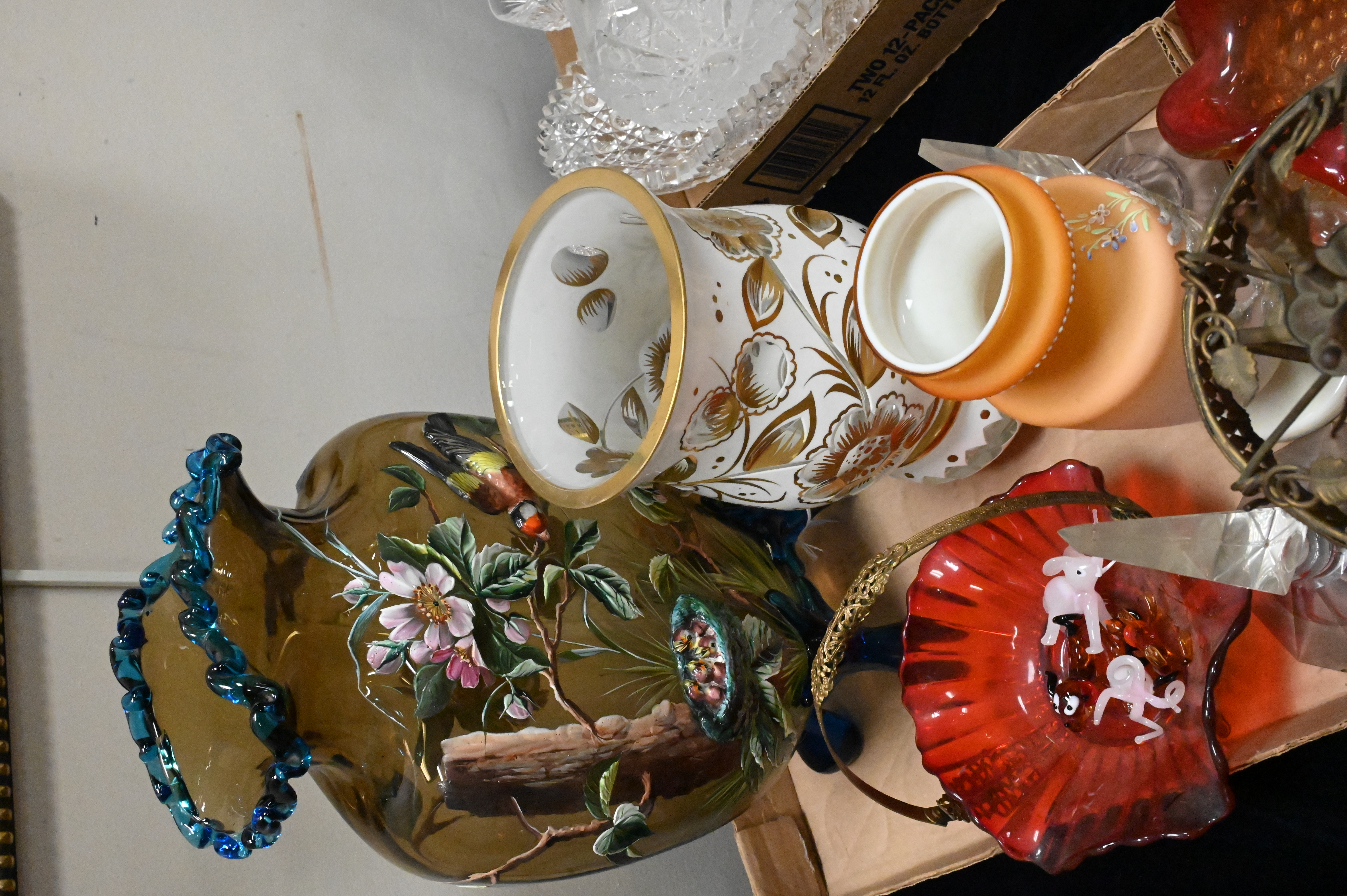 Harrach or Moser style vase having raised enamel bird and flower motif raised on four blue feet, Moser style blue glass barrel form decanter set in metal carousel form caddy, two red centerpiece baskets, white and orange frosted glass vase, etched glass decanter having figural silvered overlay, two early Baccarat obelisk perfume bottles