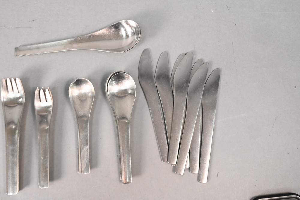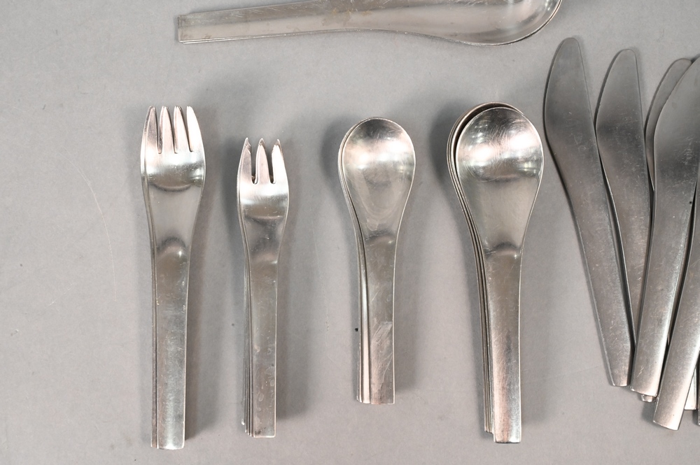 35 Piece Georg Jensen Stainless Steel Flatware, to include 7 dinner forks, 8 luncheon forks, 6 tablespoons, 5 teaspoons, 7 knives, and 2 serving spoons.