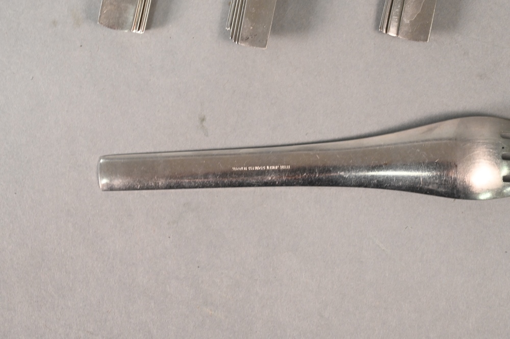 Lot 384: 35 Piece Georg Jensen Stainless Steel Flatware, to include 7 dinner forks, 8 luncheon forks, 6 tablespoons, 5 teaspoons, 7 knives, and 2 serving spoons.