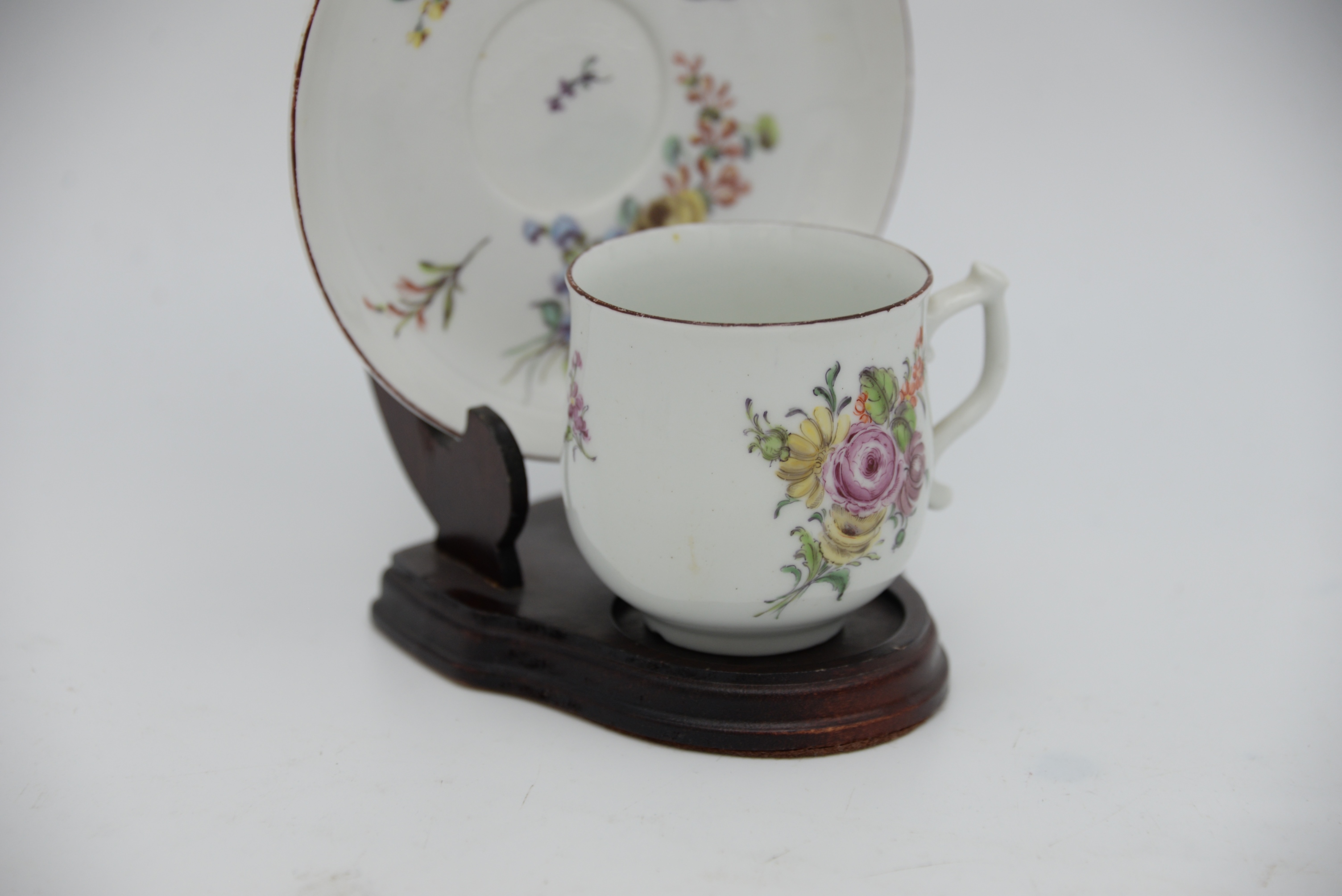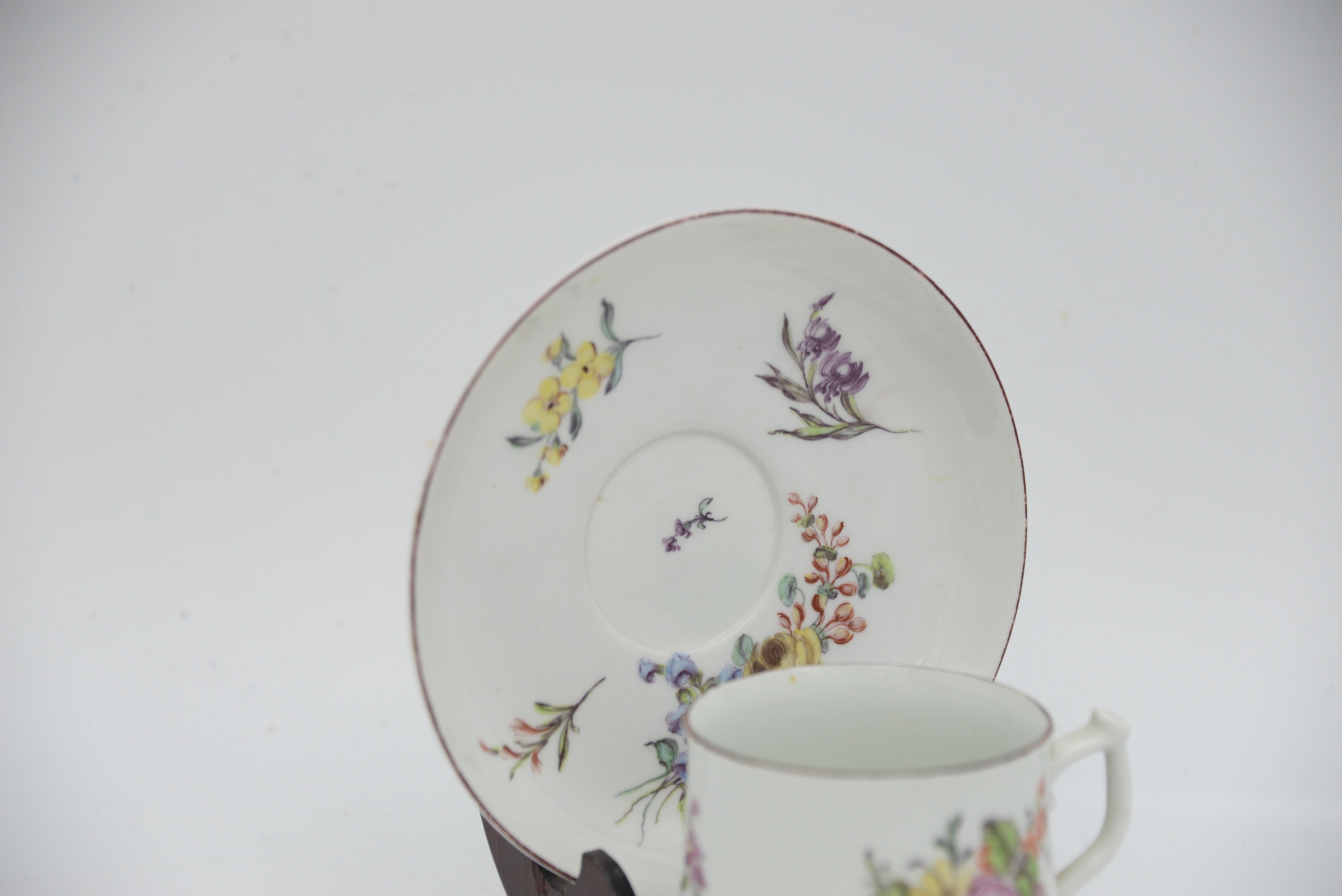 Chelsea Bell-Shaped Porcelain Cup and Saucer, circa 1750, finely painted in colors with sprays of flowers, red anchor mark, teacup height 2 1/2 inches, diameter of saucer 4 1/2 inches. Provenance: Julius H Jacobson II a Fifth Avenue Estate.