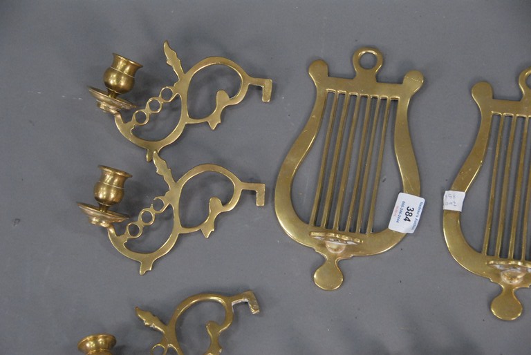 Lot 384: Four piece lot pair of brass candle sconces and pair of brass jam hooks. From the collection of Thomas and Alice Kugelman