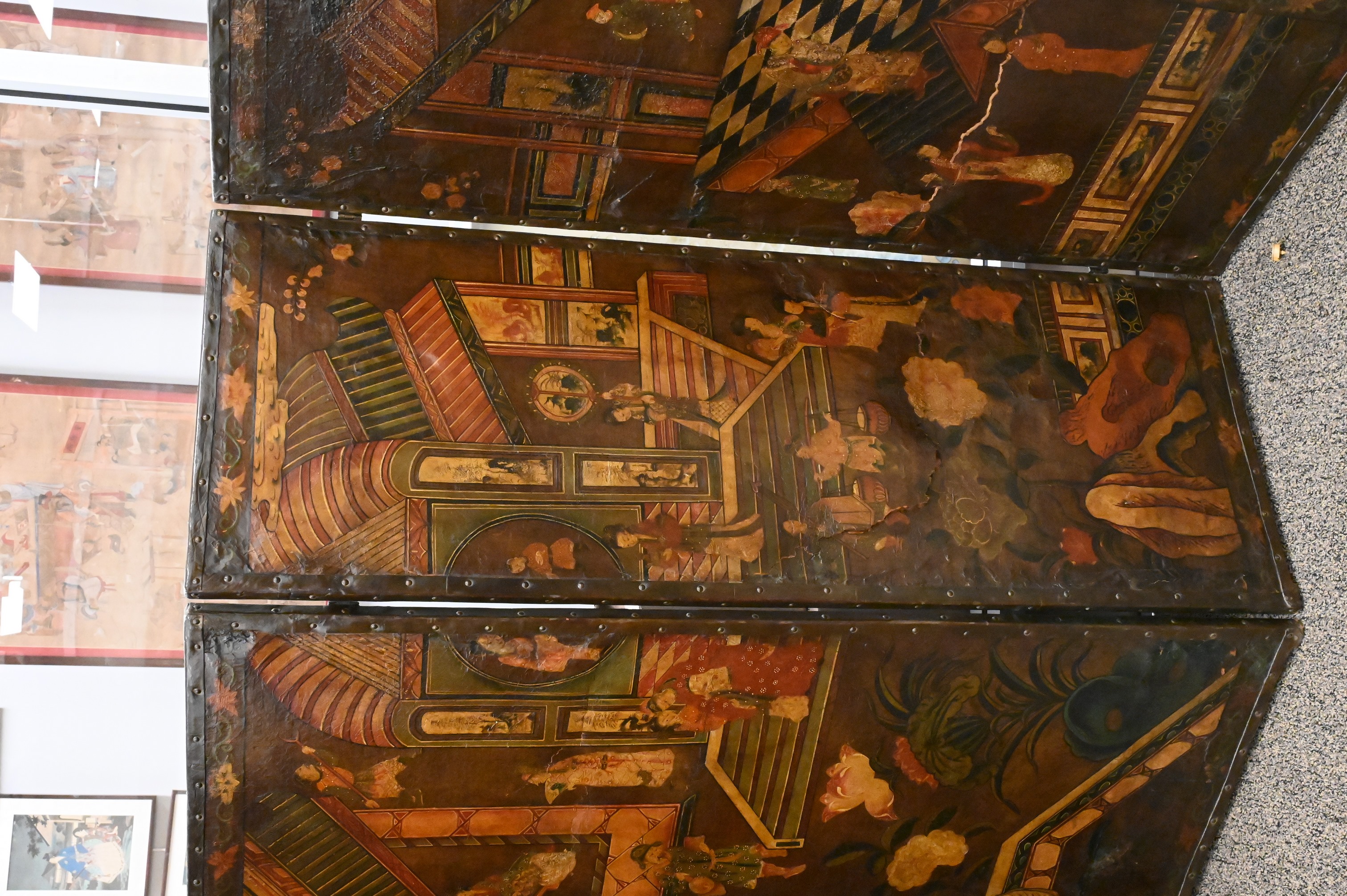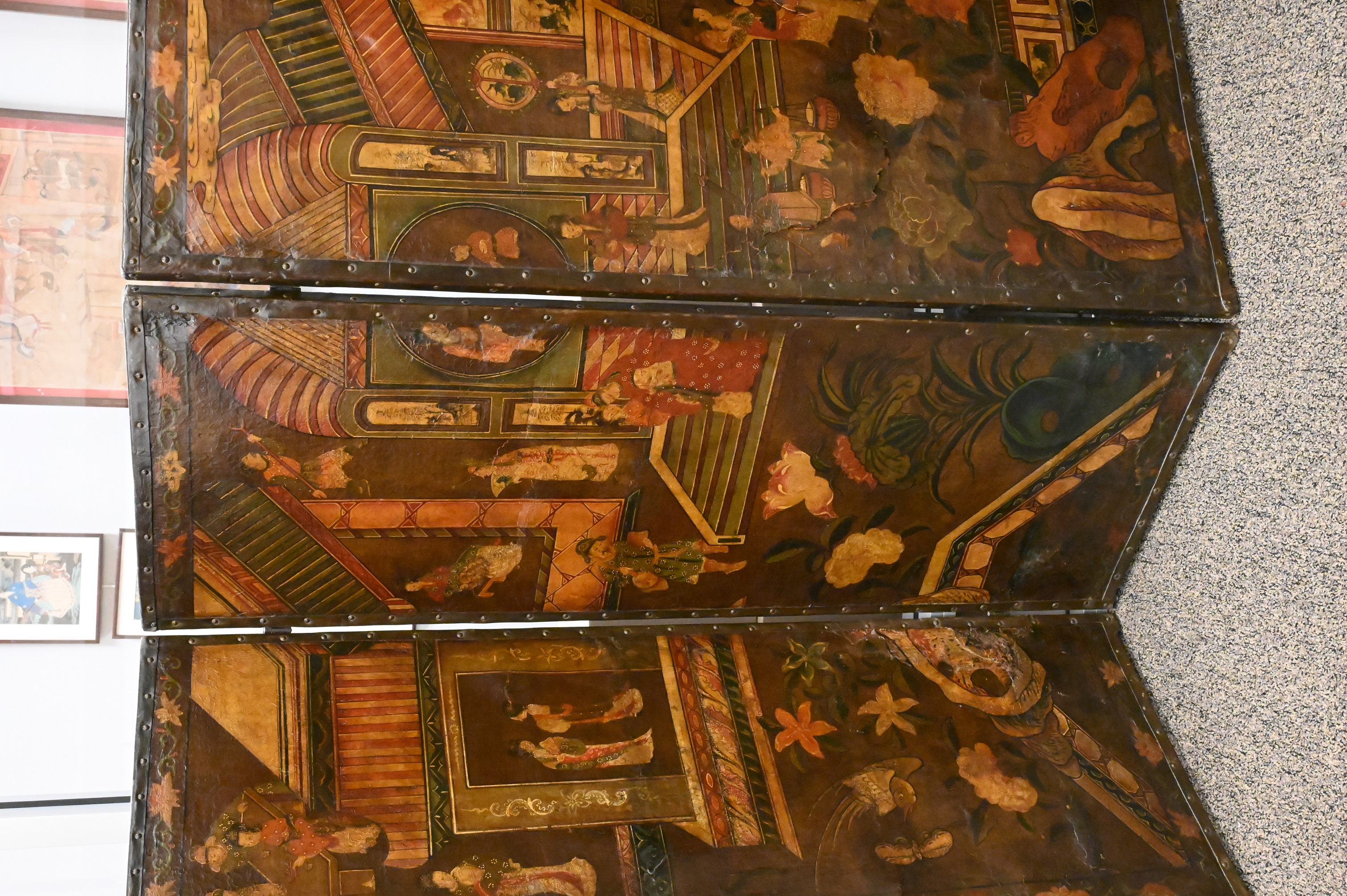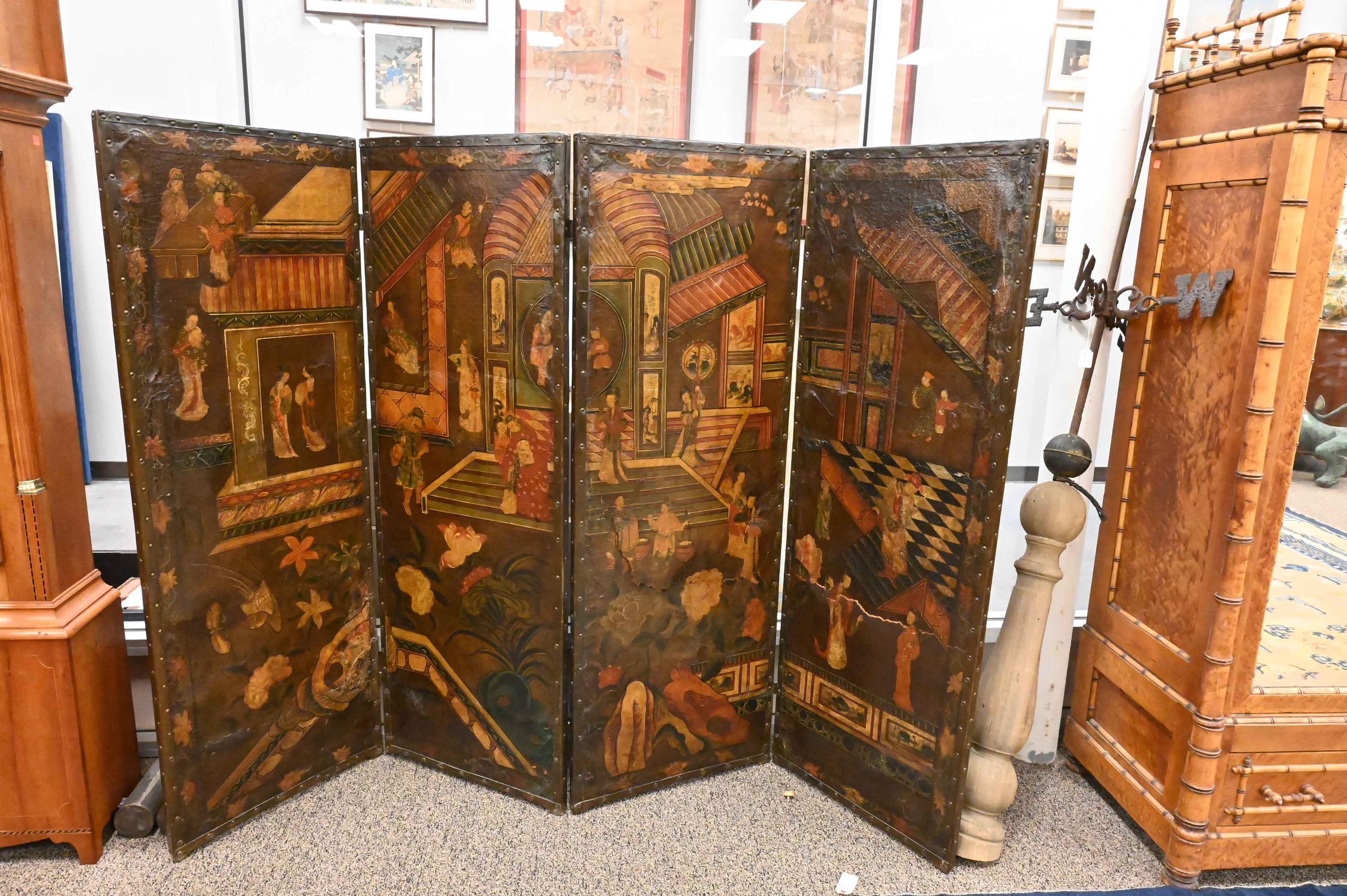 Lot 384: Leather Hand Painted Four Panel Dressing Screen