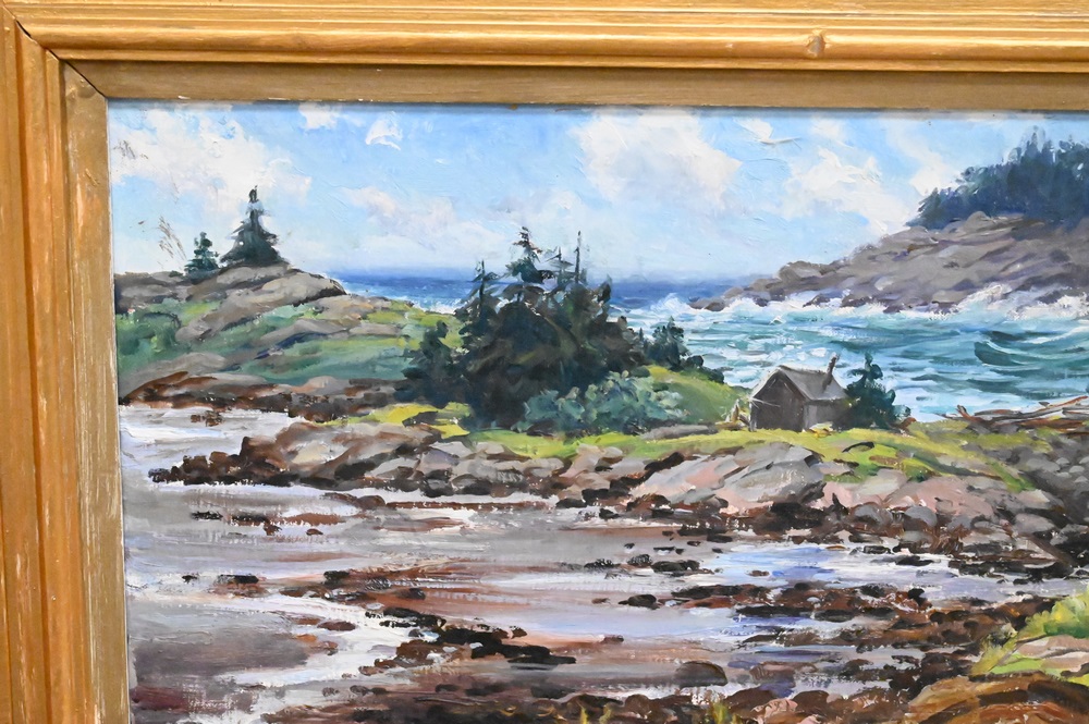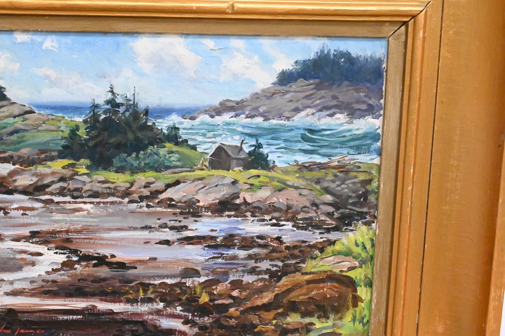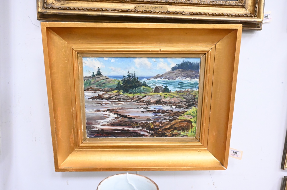 Lot 384: Sandra James (20th Century), rocky Maine coast, oil on board, signed lower left Sandra James, 12″ x 16″.