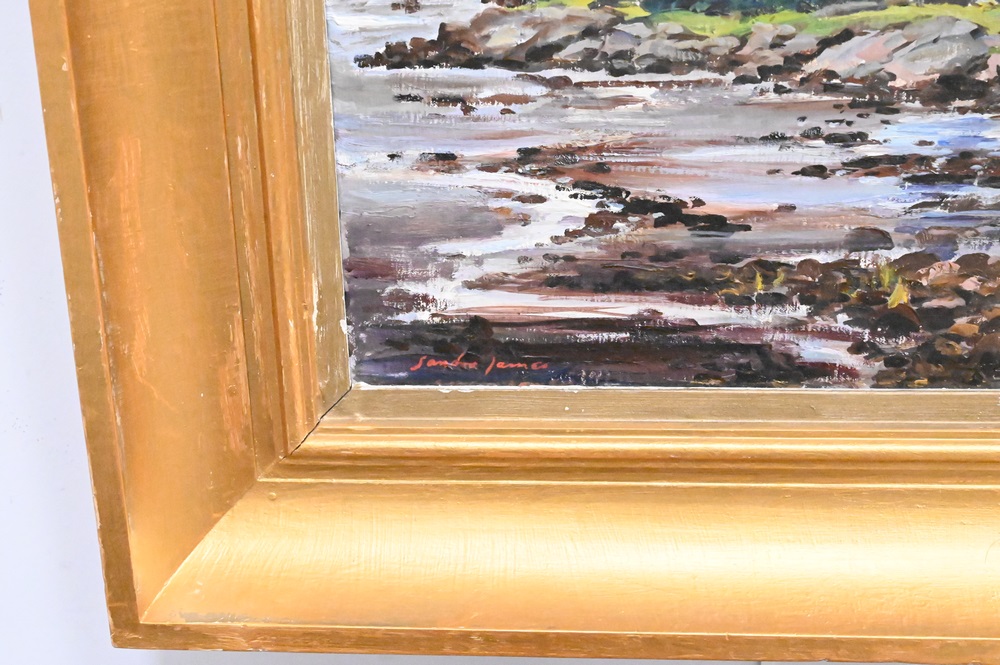 Sandra James (20th Century), rocky Maine coast, oil on board, signed lower left Sandra James, 12″ x 16″.
