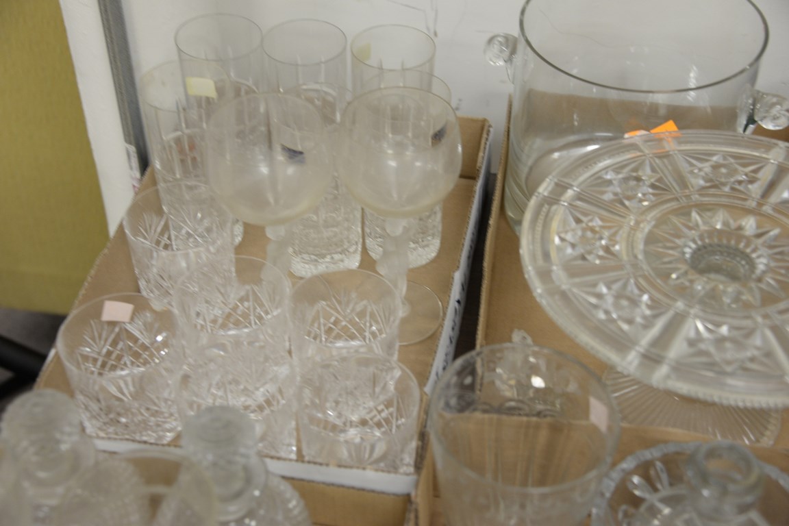 Six box lots of crystal, cut glass, and clear glass tumblers, decanter, cake plate, stems, etc.