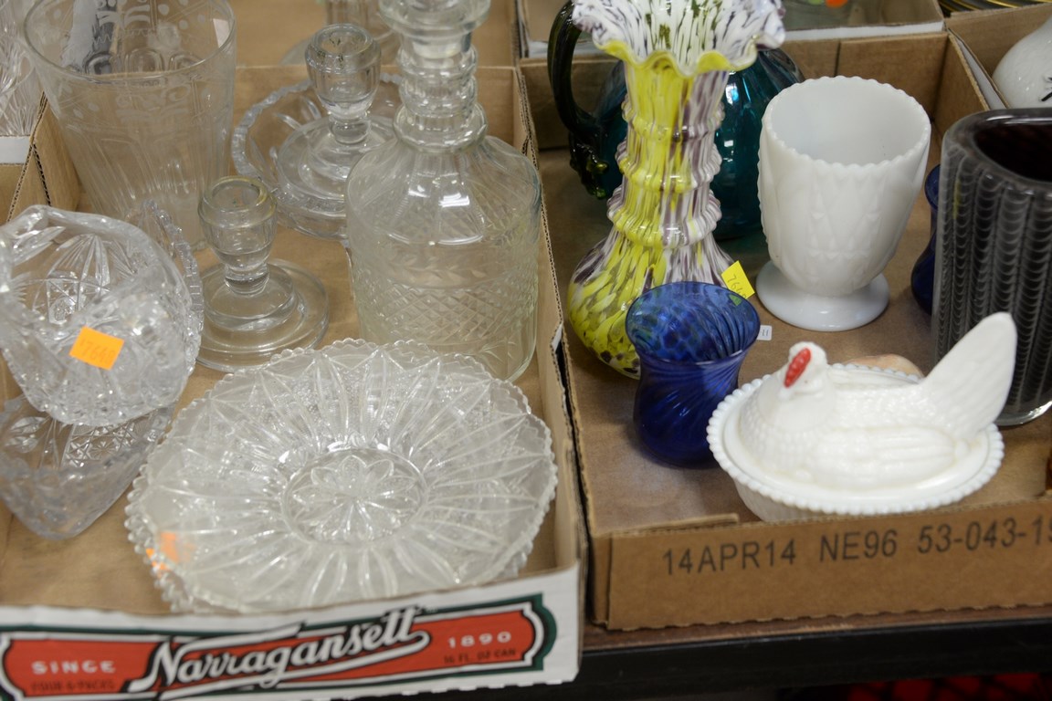 Lot 384: Six box lots of crystal, cut glass, and clear glass tumblers, decanter, cake plate, stems, etc.