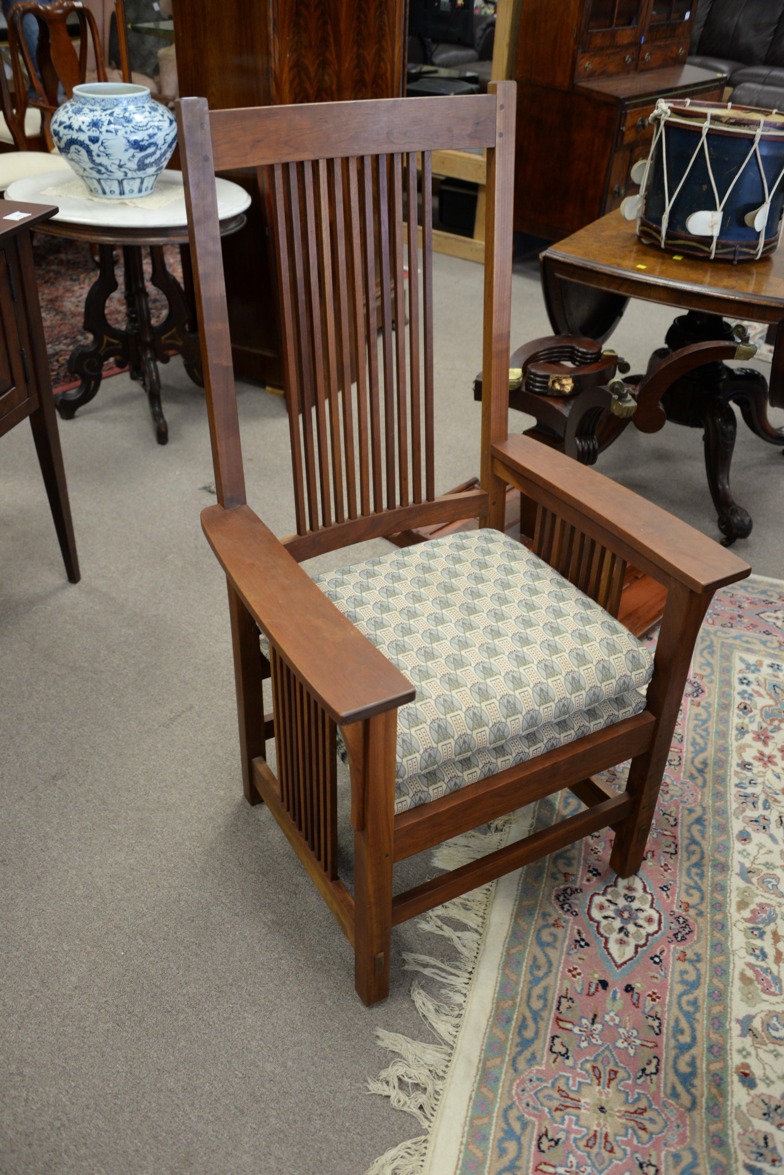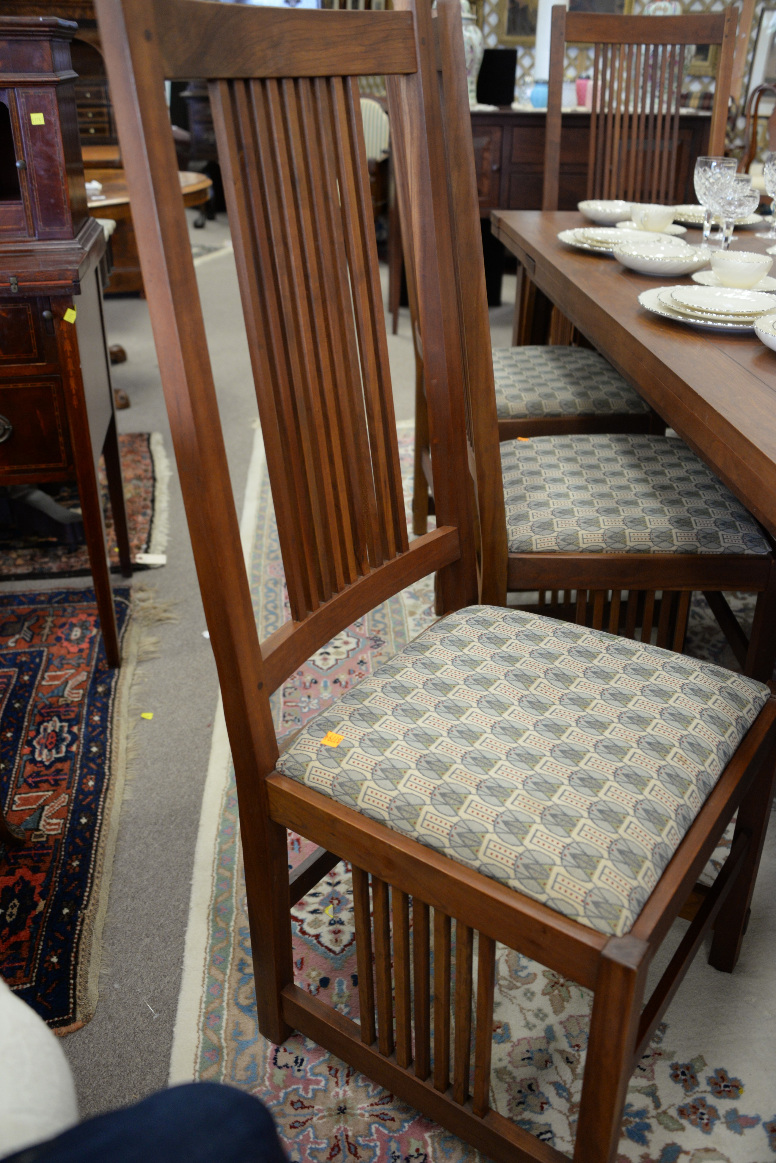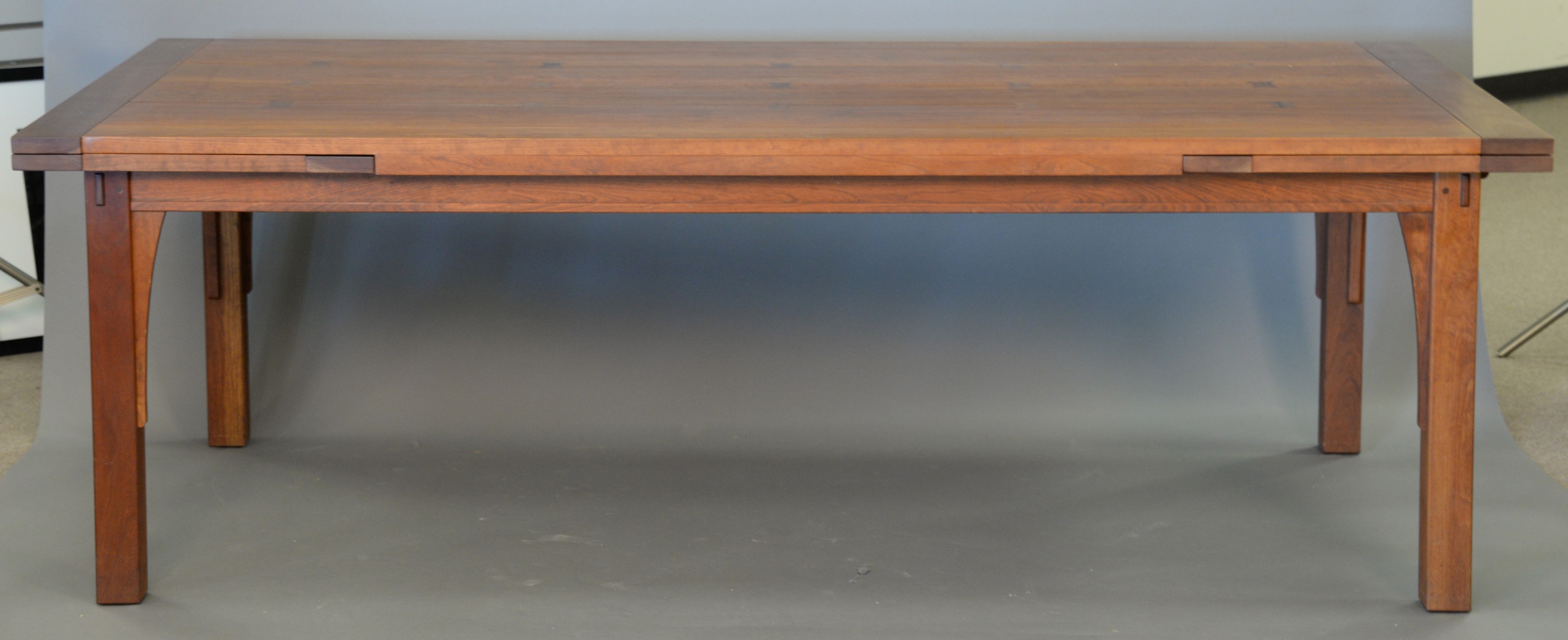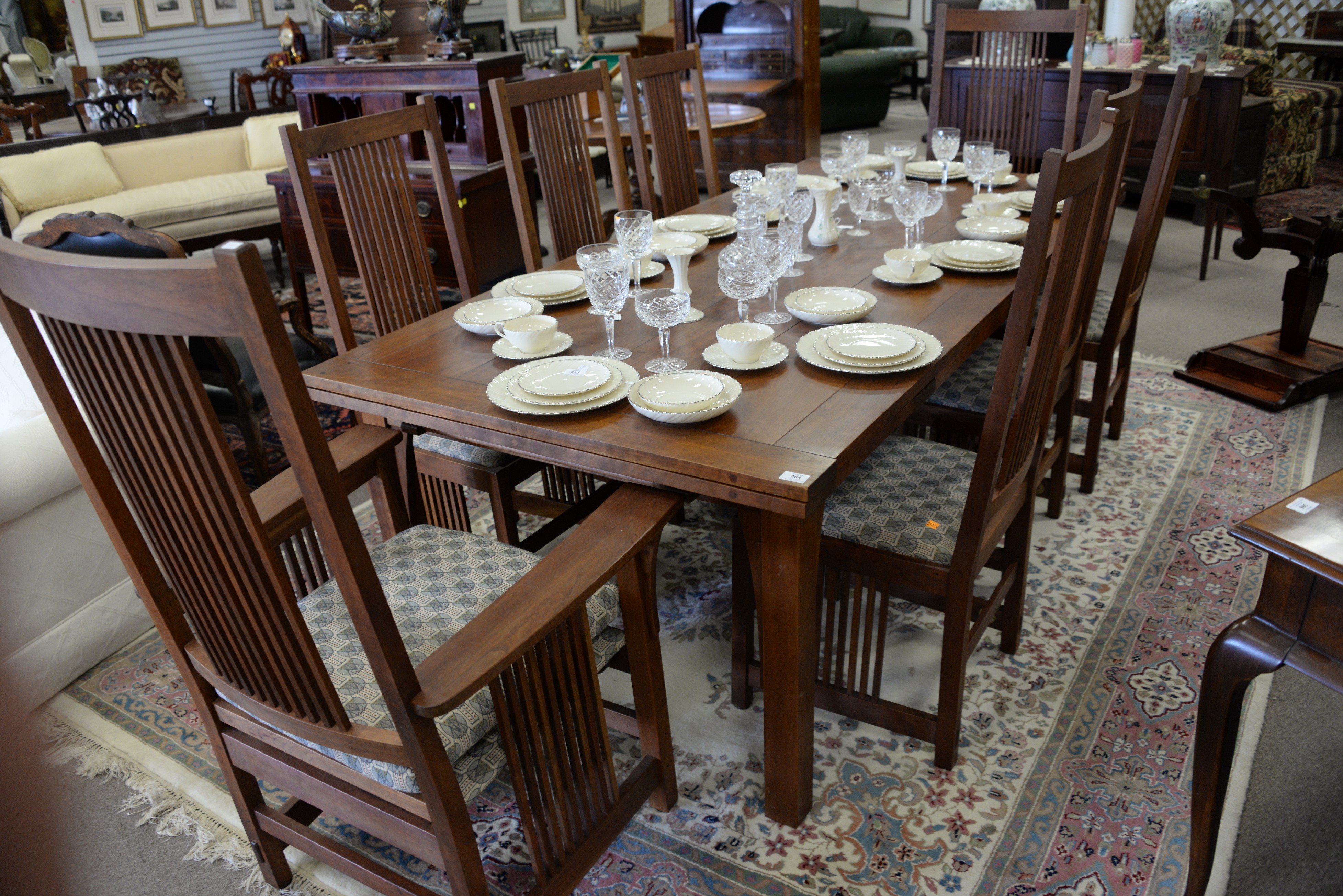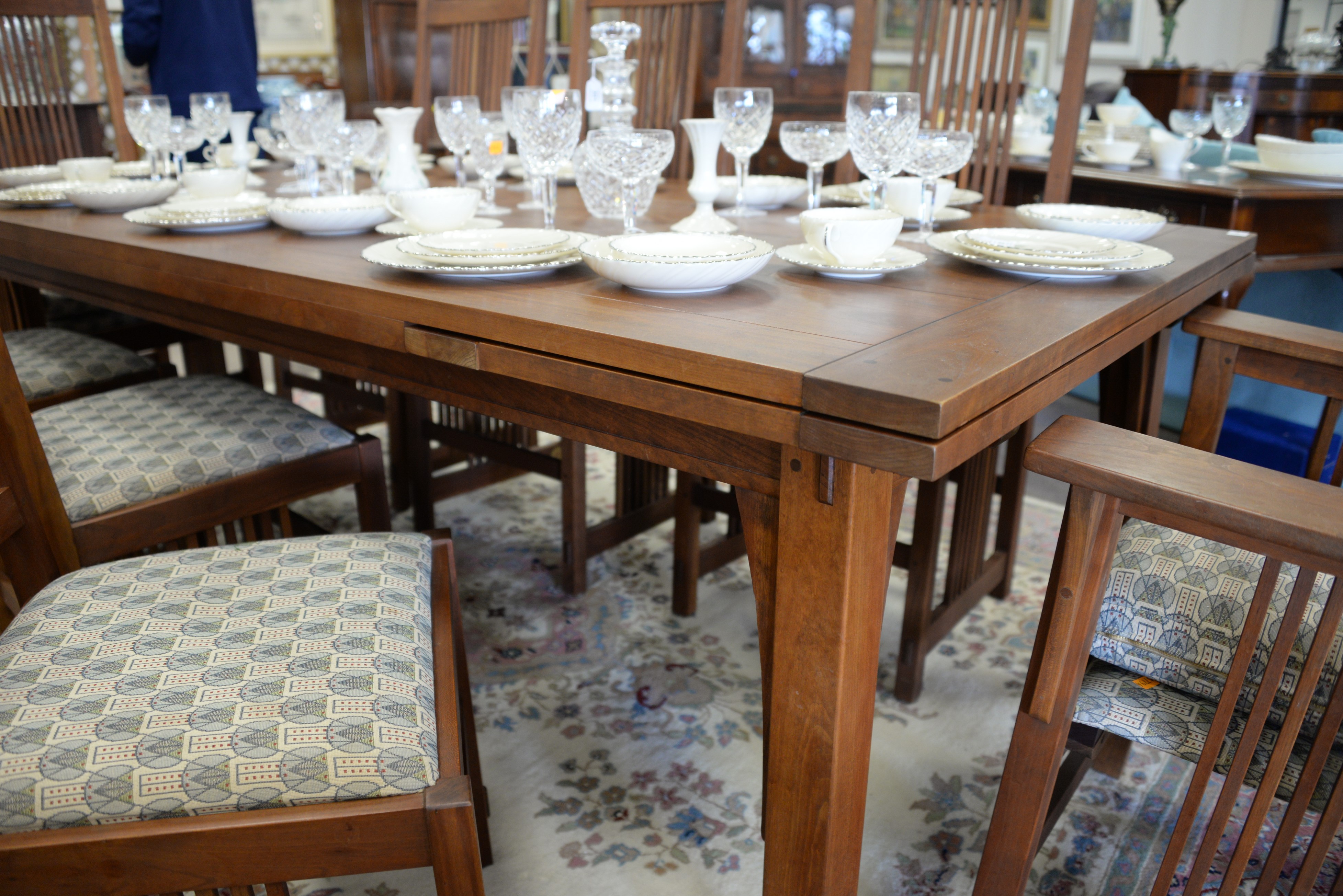 Stickley cherry nine piece dining set with eight spindle back chairs and extension table with two 21 inch leaves. ht. 29 in. top: 42 x 90, open: 42 x 132.