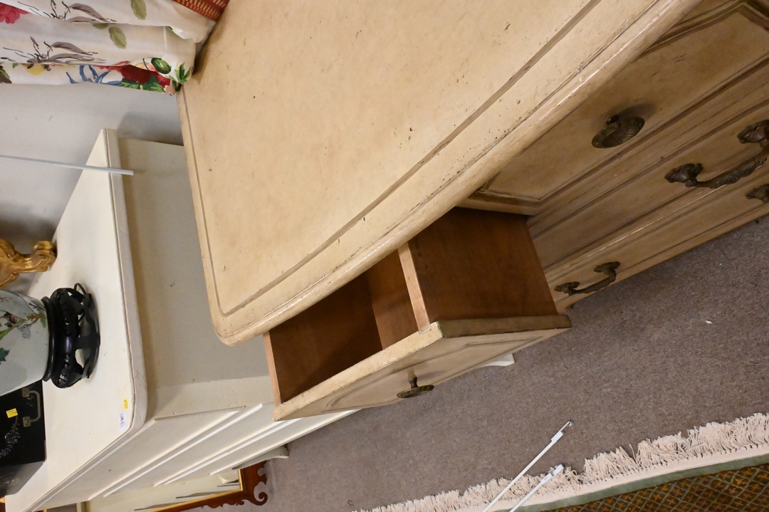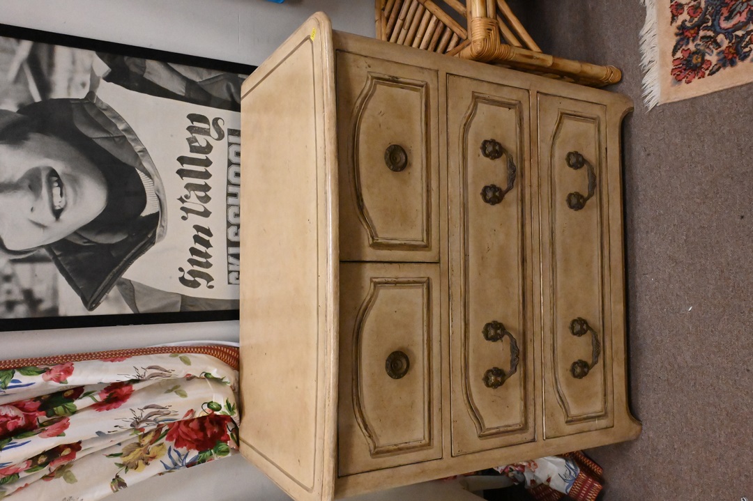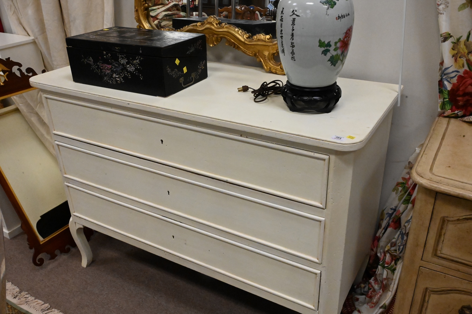 Two French Painted Chests, one having hardware, height 34 inches, width 36 inches; along with one without hardware, height 37 inches, width 53 inches.