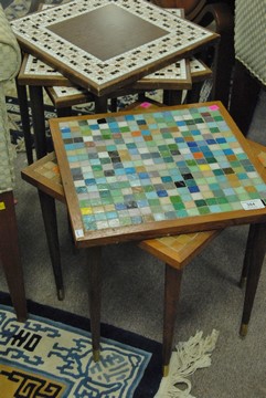 Lot 384: Two sets of tile top tables including a set of three and a set of two, brown and white and multicolored, ht. 15 and 17