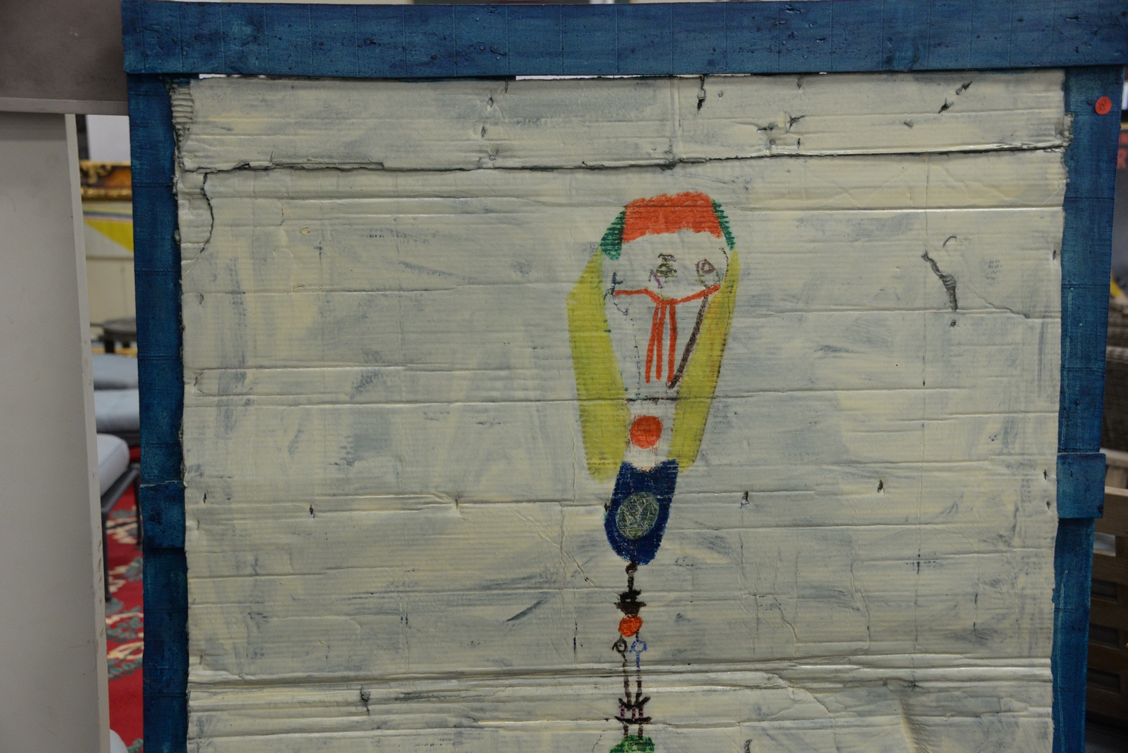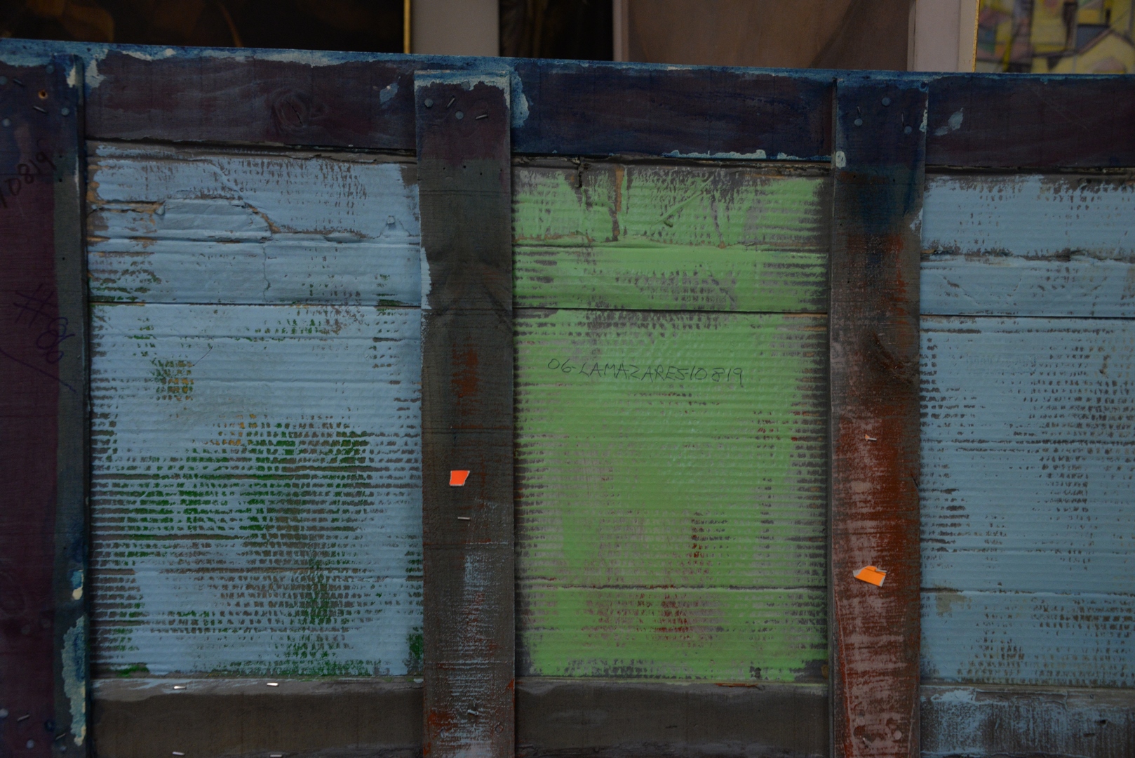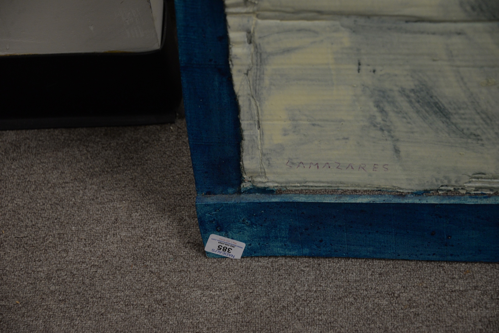 Lot 385: Anton Lamazares (Spanish, b. 1954), Rosario, 1984, mixed media with encaustic on cardboard with painted wood supports, signed lower left “Lamazares”; titled and dated on the reverse “Rosario 1984″, 65 3/8″ x 43 3/4”.