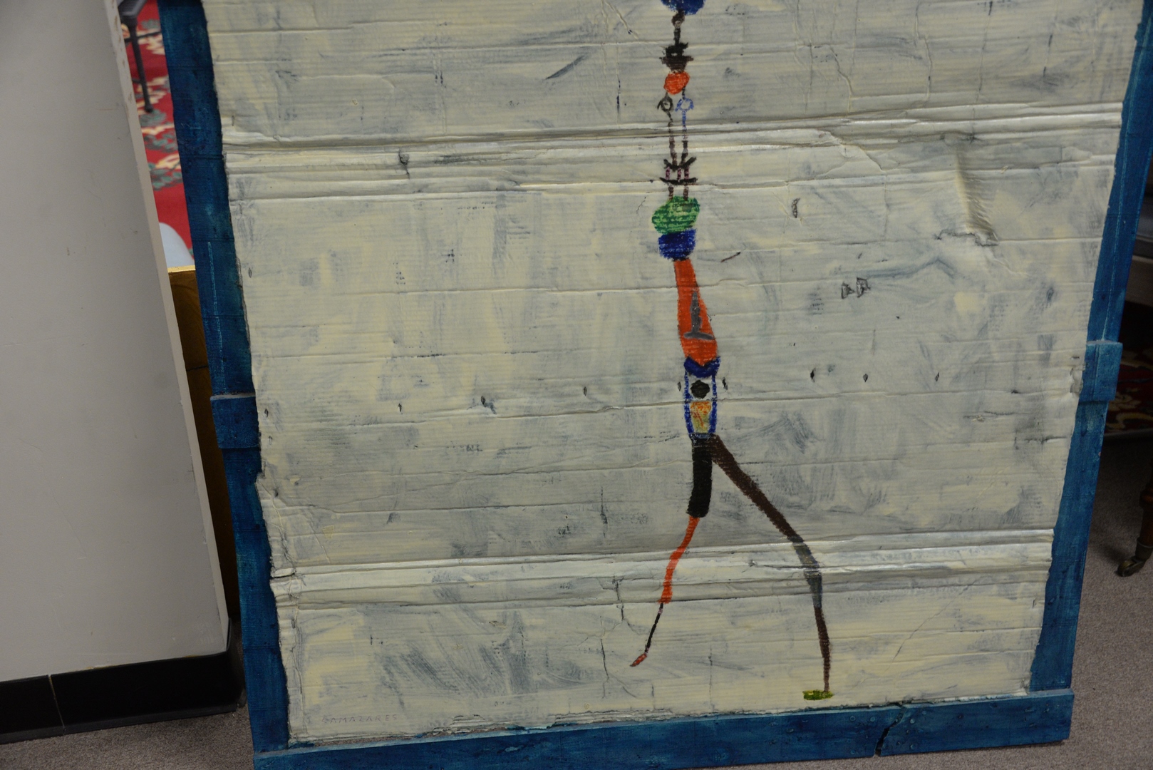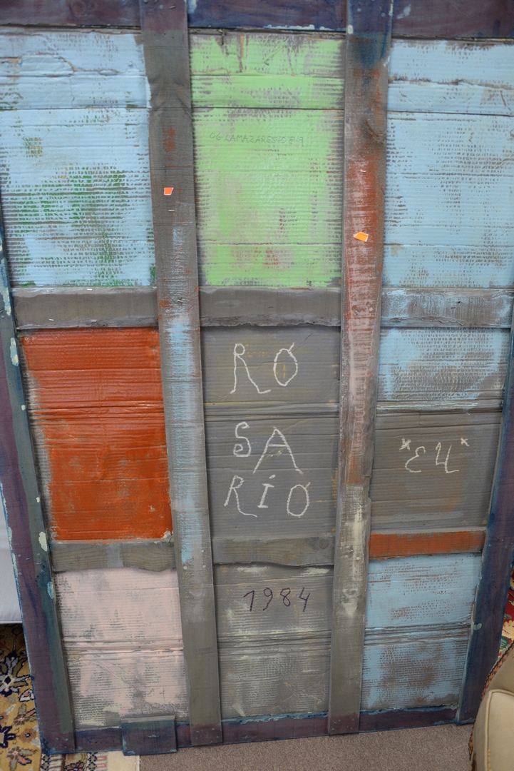 Anton Lamazares (Spanish, b. 1954), Rosario, 1984, mixed media with encaustic on cardboard with painted wood supports, signed lower left “Lamazares”; titled and dated on the reverse “Rosario 1984″, 65 3/8″ x 43 3/4”.