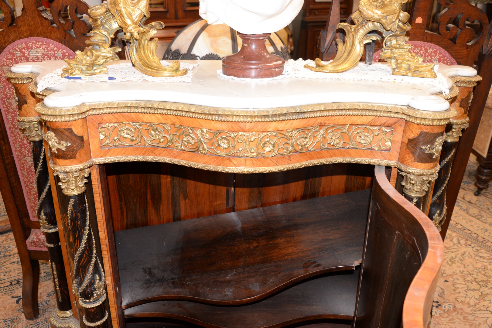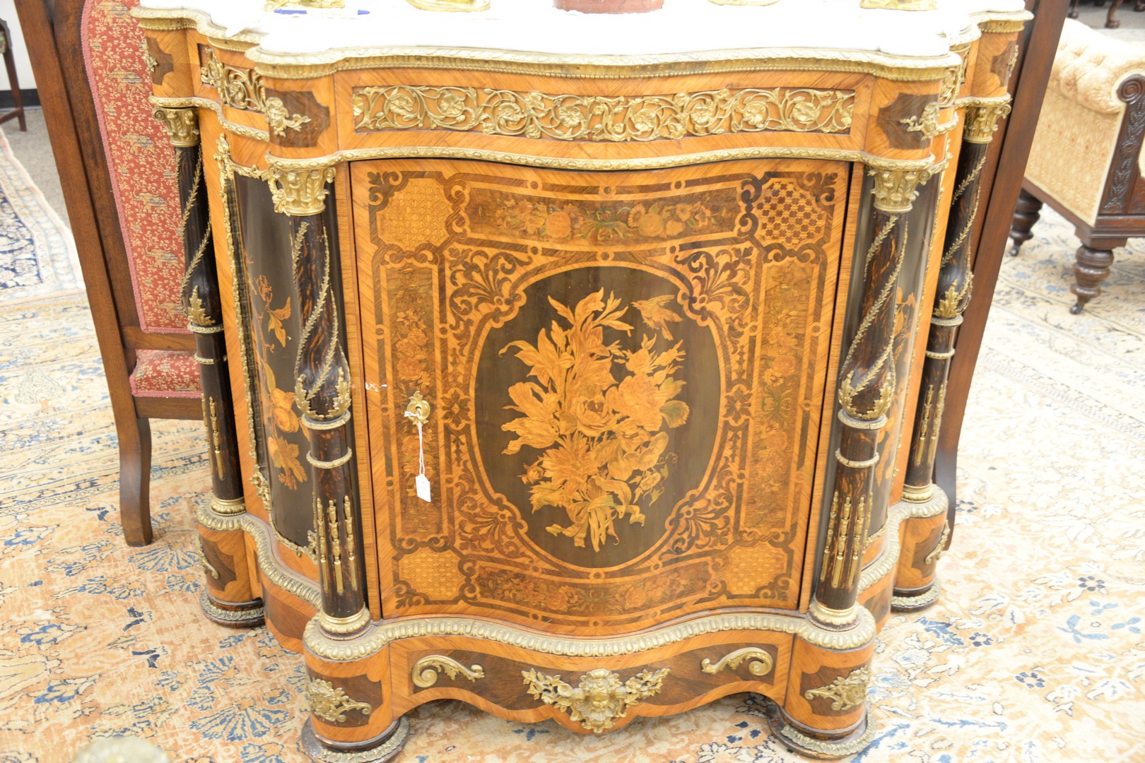 having marble top with turret corners, over inlaid conforming cabinet with brass mounts