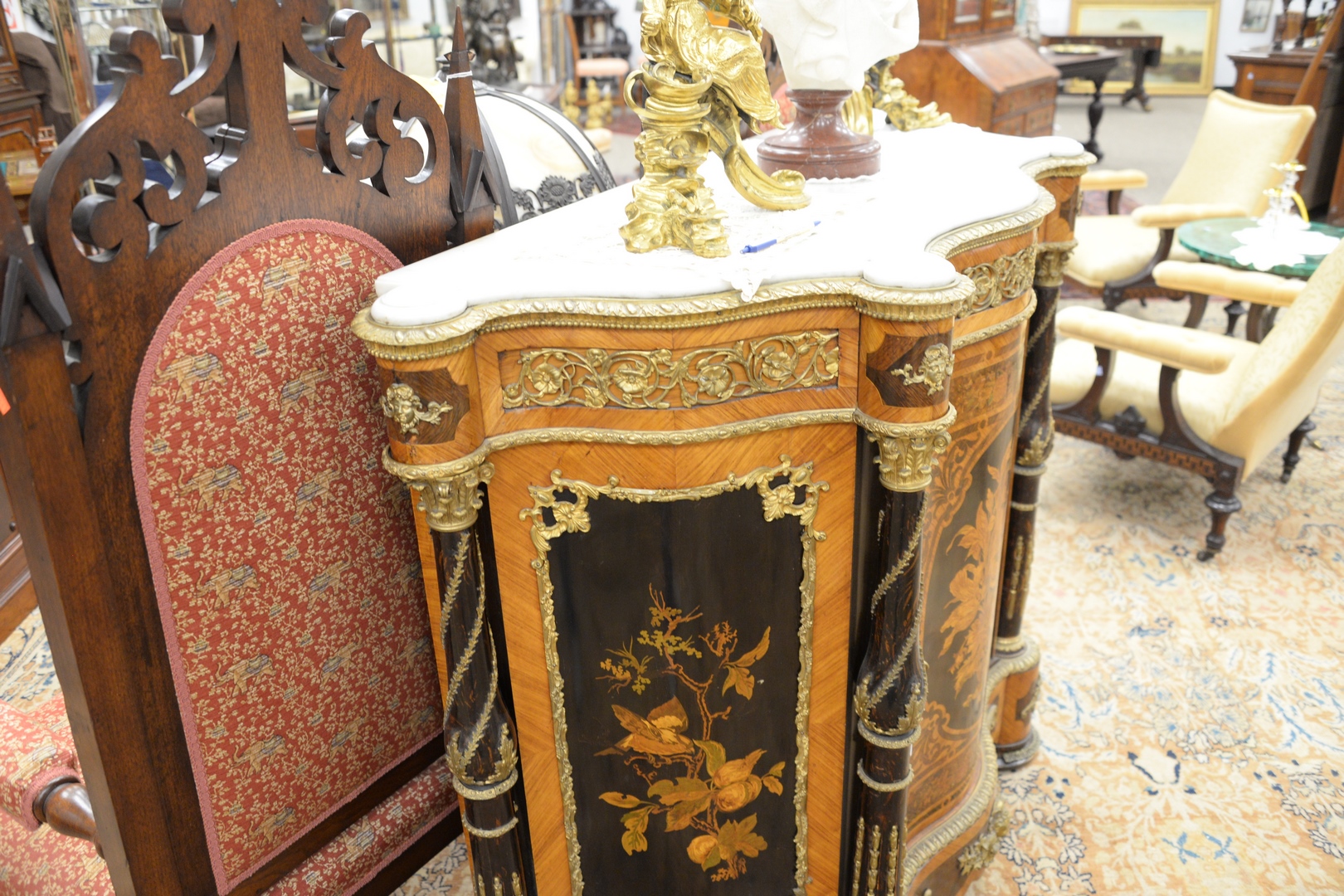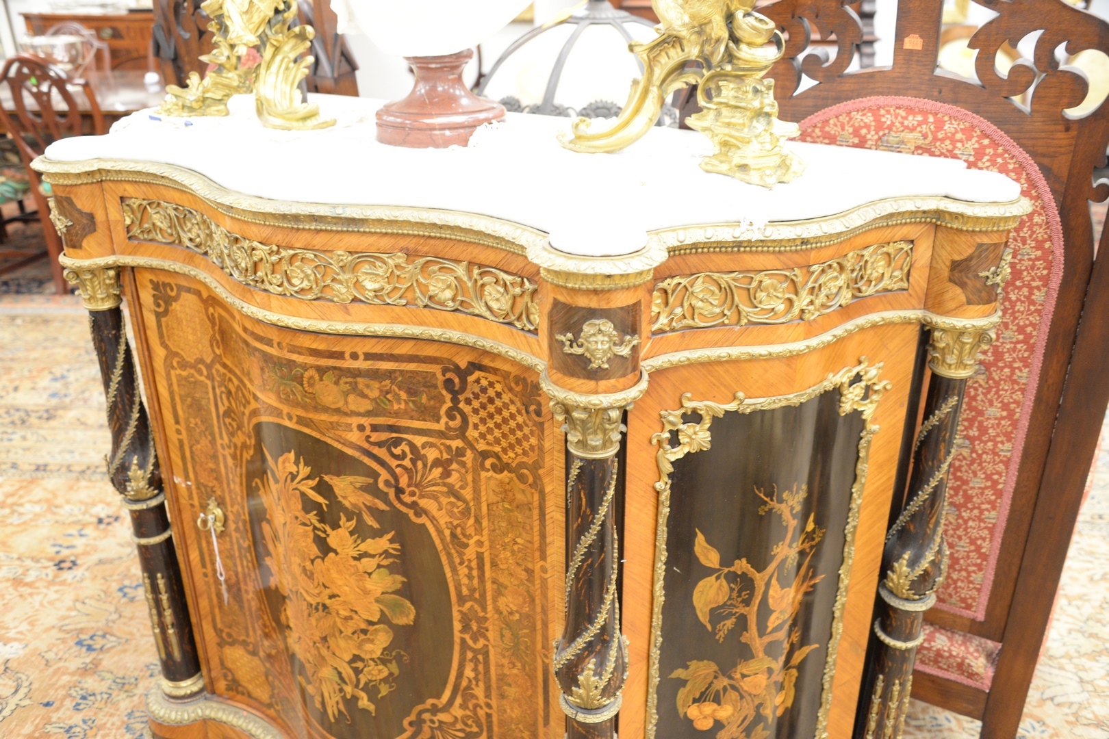 Lot 385: French Side Cabinet having marble top with turret corners, over inlaid conforming cabinet with brass mounts probably early 20th cen…