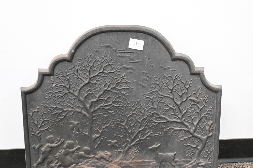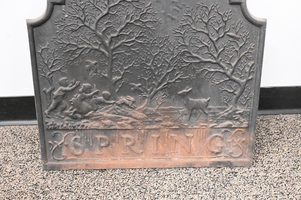 Lot 385: Iron Fire Back, having trees, people and deer, marked Spring, height 22 inches, width 21 1/2 inches.