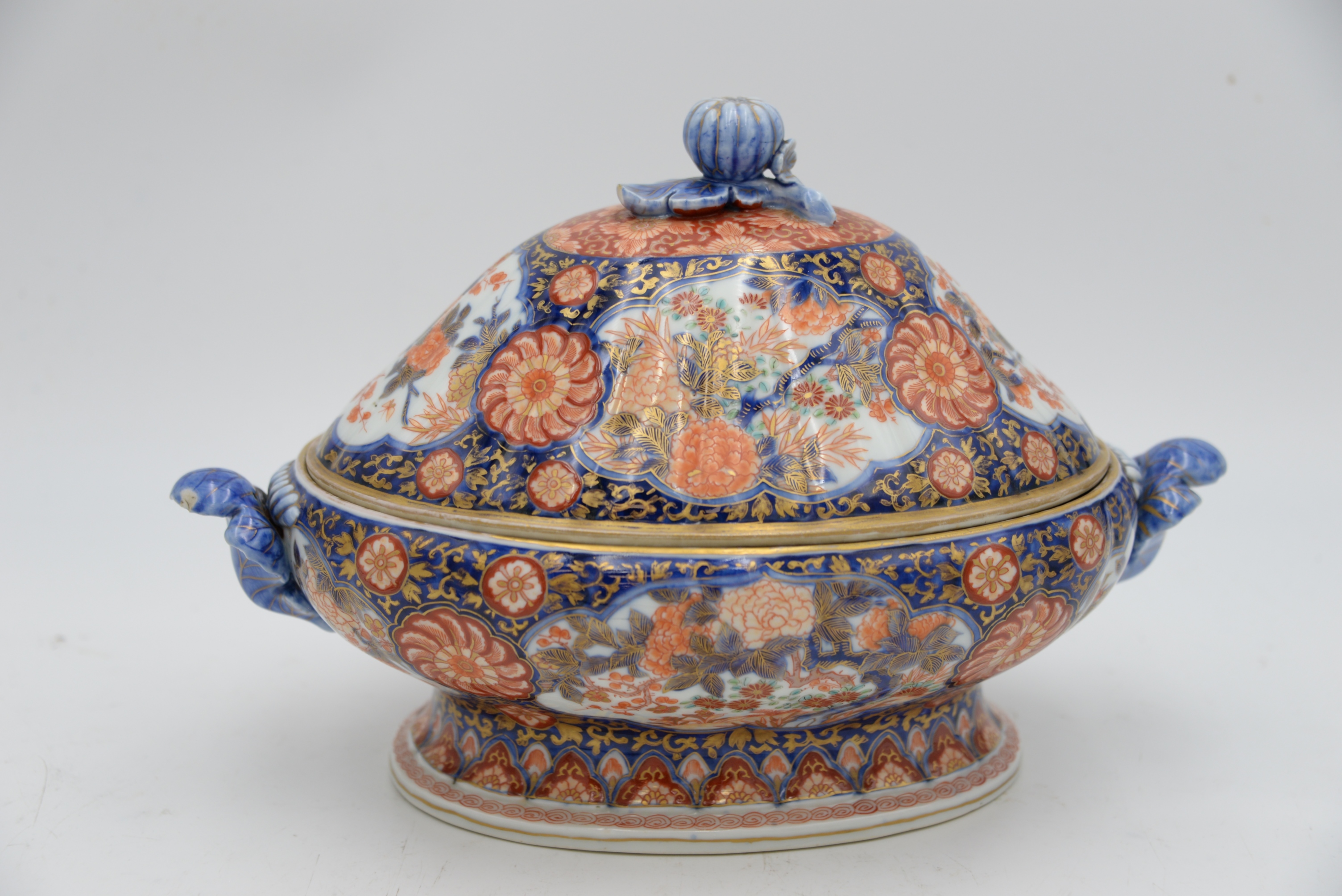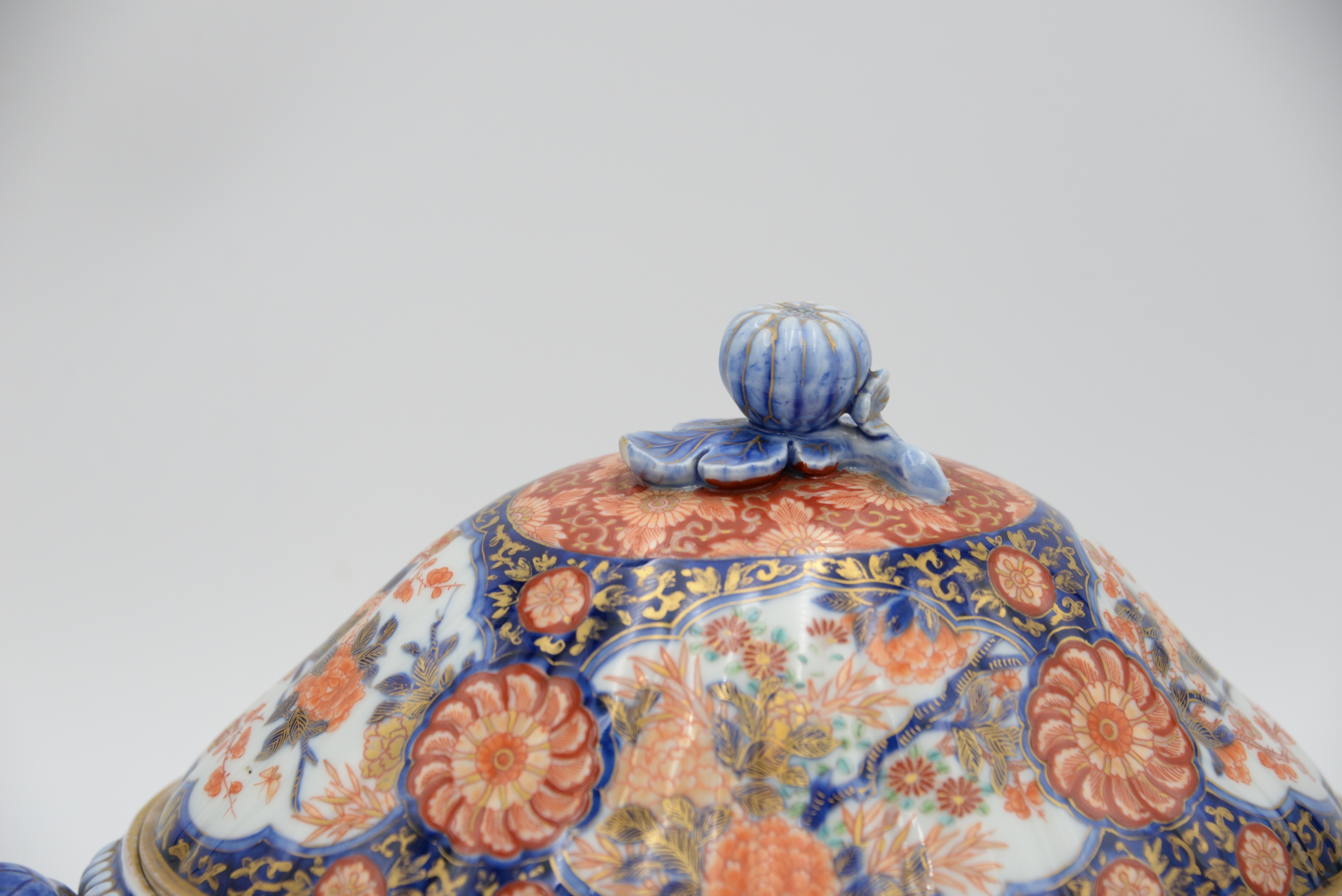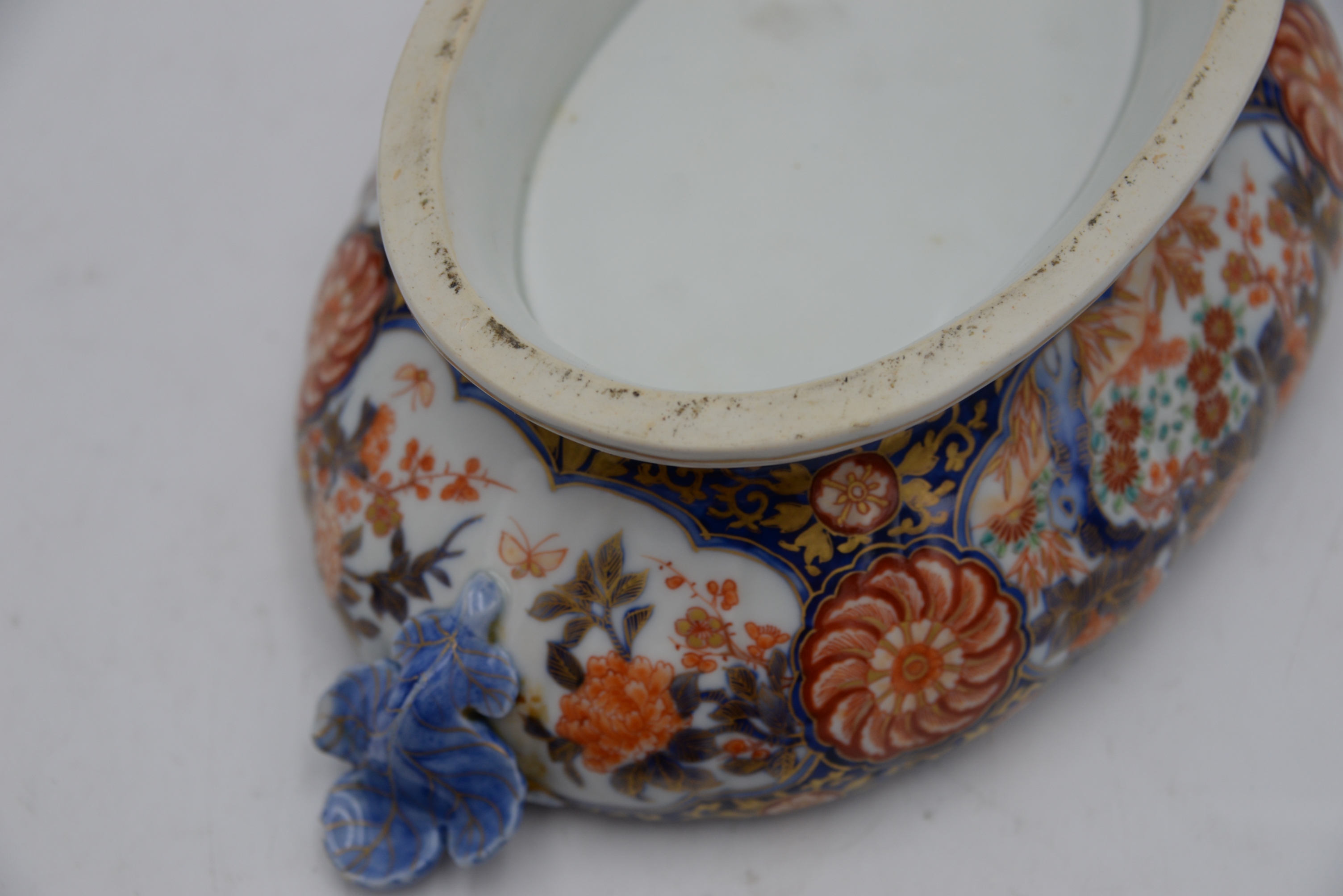 Japanese Imari Porcelain Tureen, having scallop body with cobalt blue and orange painted wild flowers, vegetable and leaf handles, marked on inside of cover, minor chips, height 8 inches, length 12 inches. Provenance: Julius H Jacobson II a Fifth Avenue Estate.