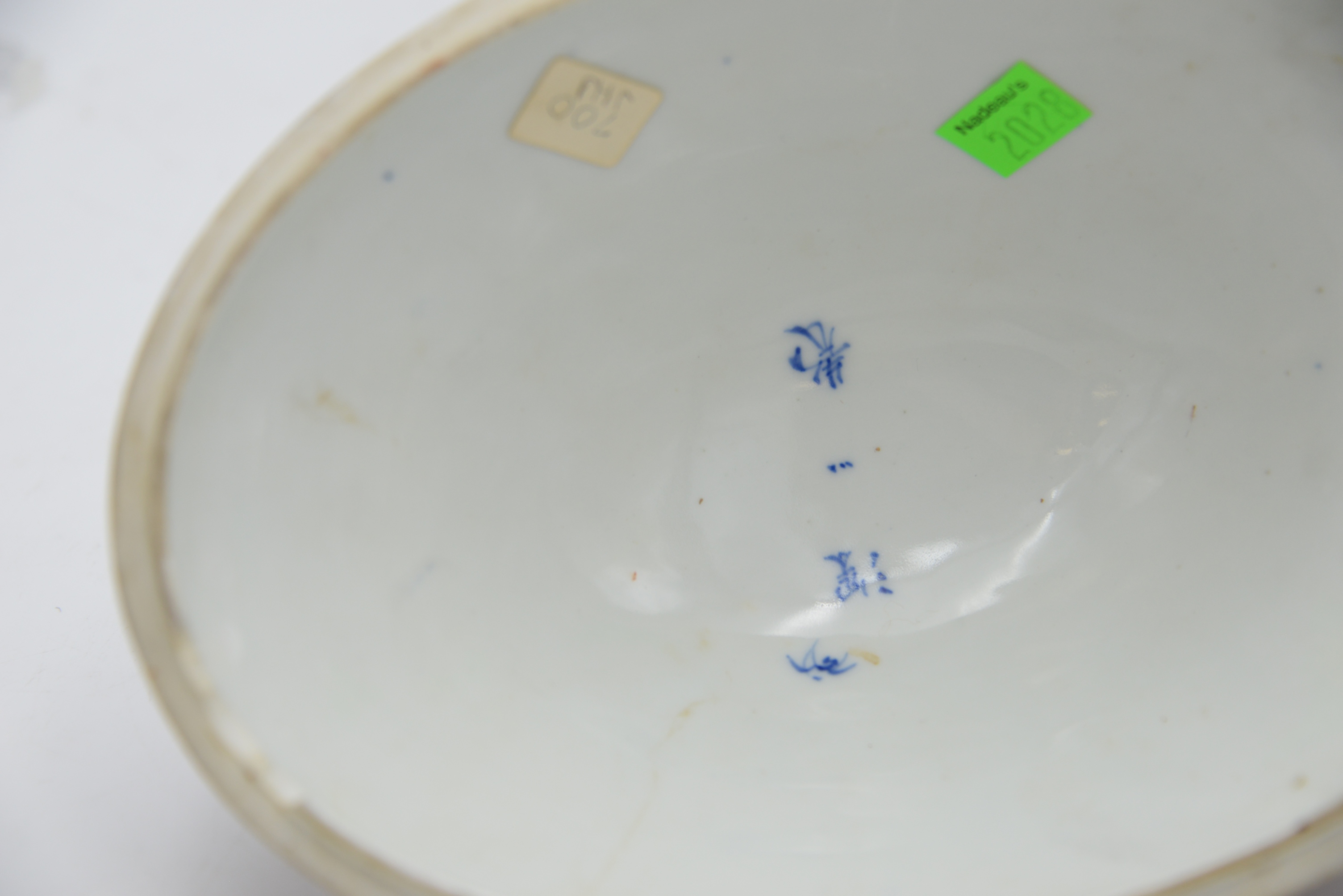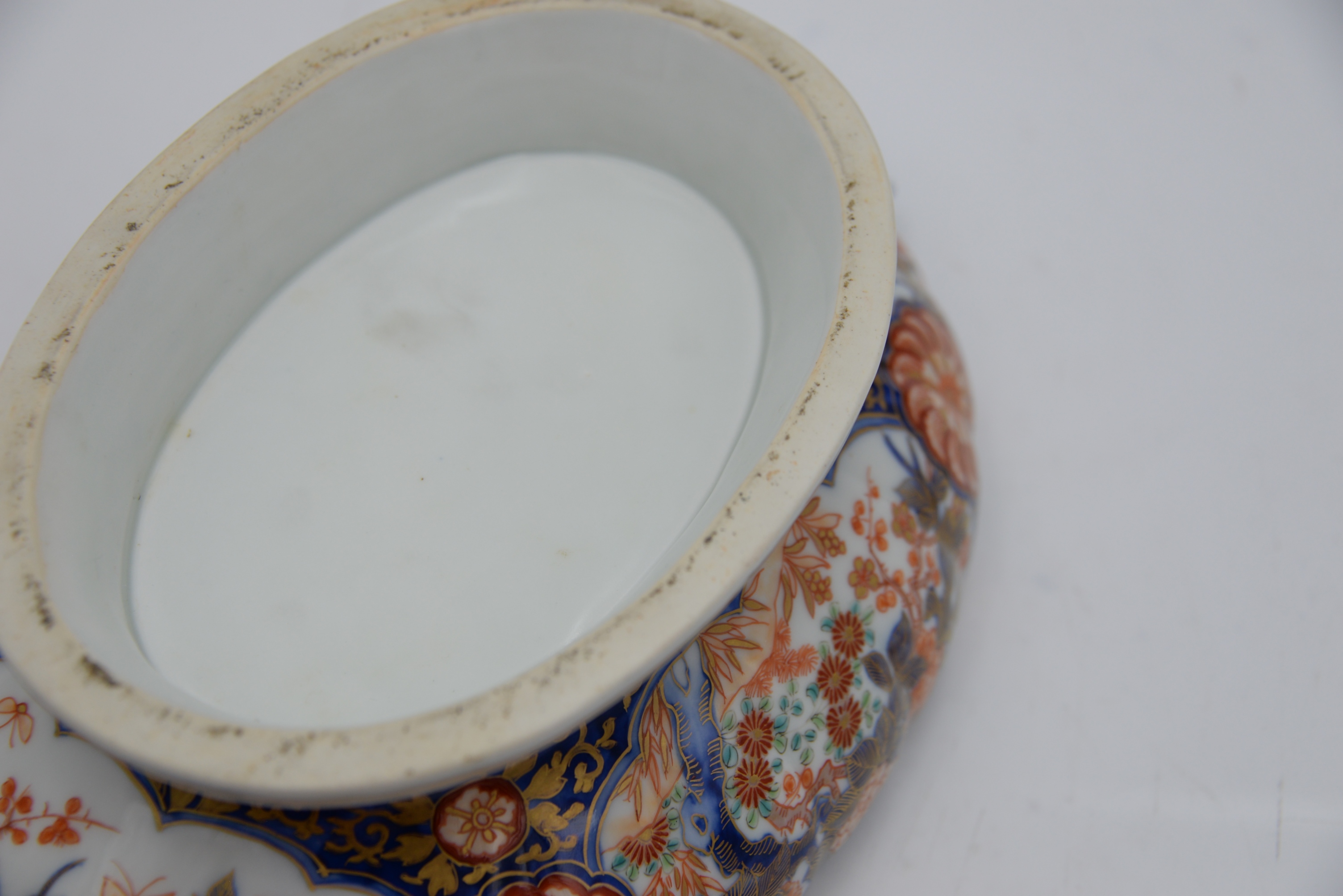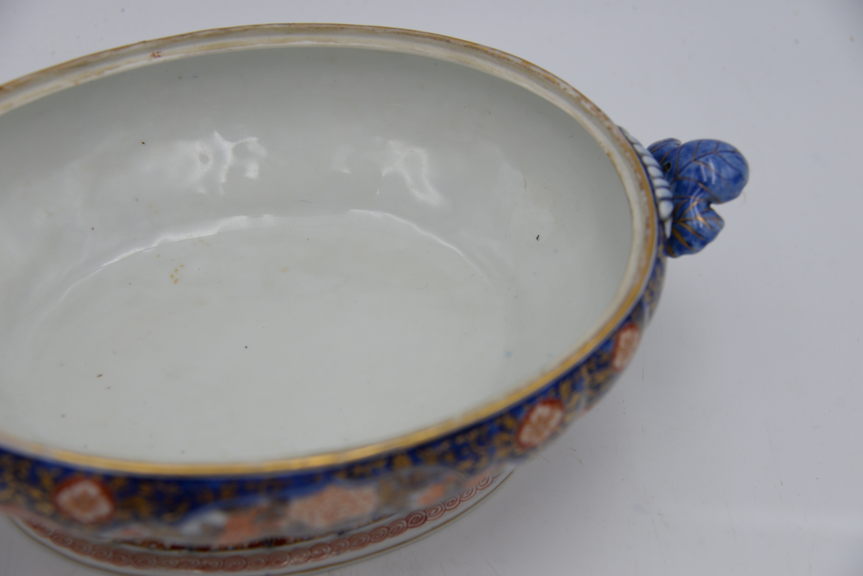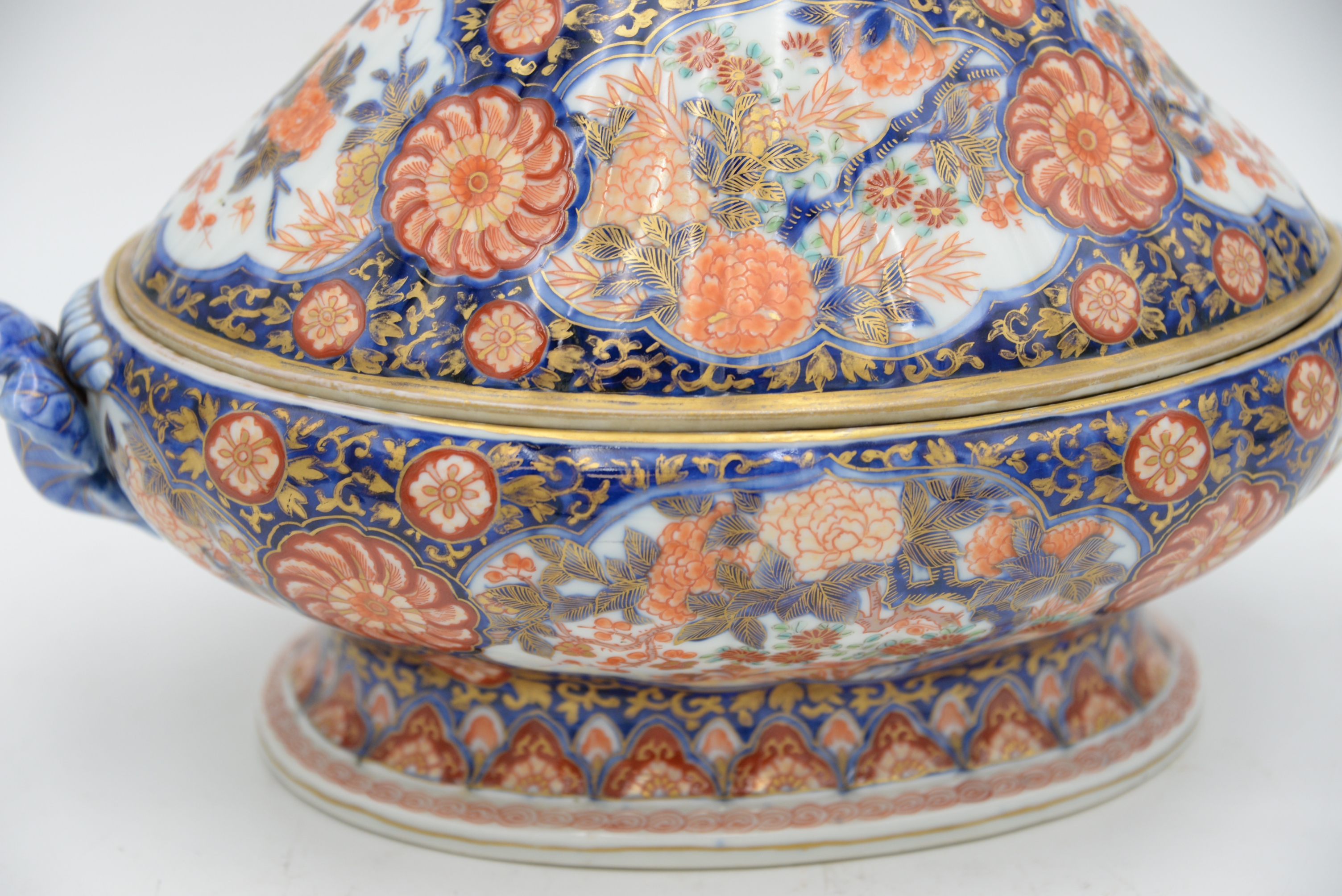 Japanese Imari Porcelain Tureen, having scallop body with cobalt blue and orange painted wild flowers, vegetable and leaf handles, marked on inside of cover, minor chips, height 8 inches, length 12 inches. Provenance: Julius H Jacobson II a Fifth Avenue Estate.