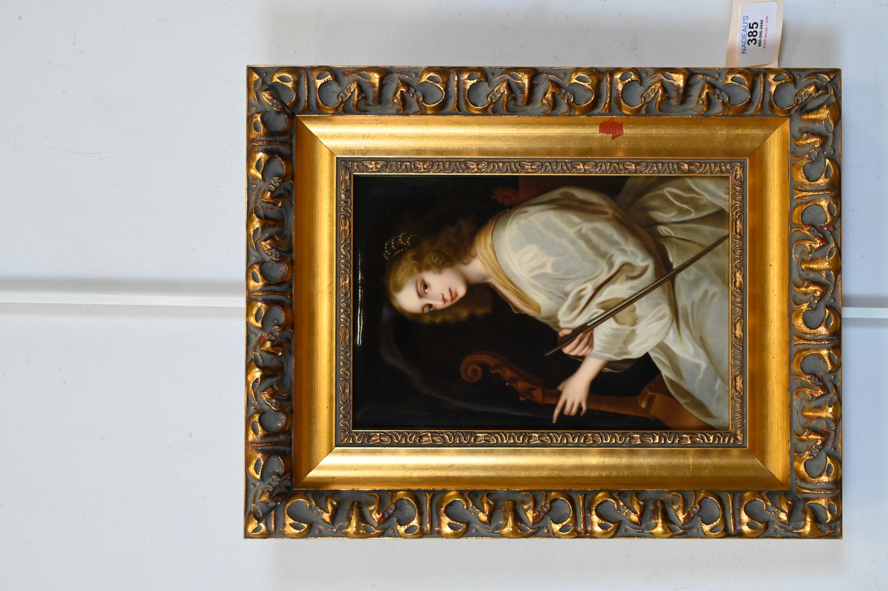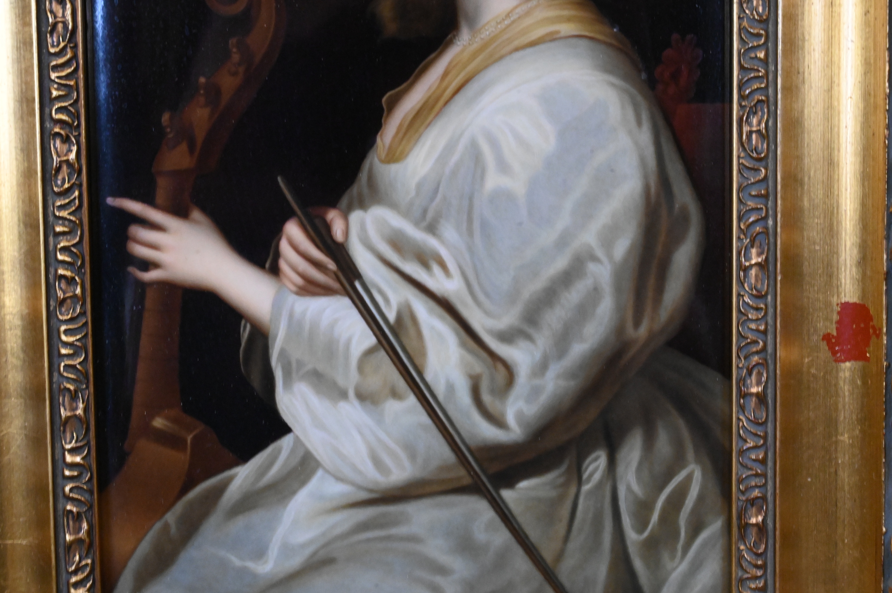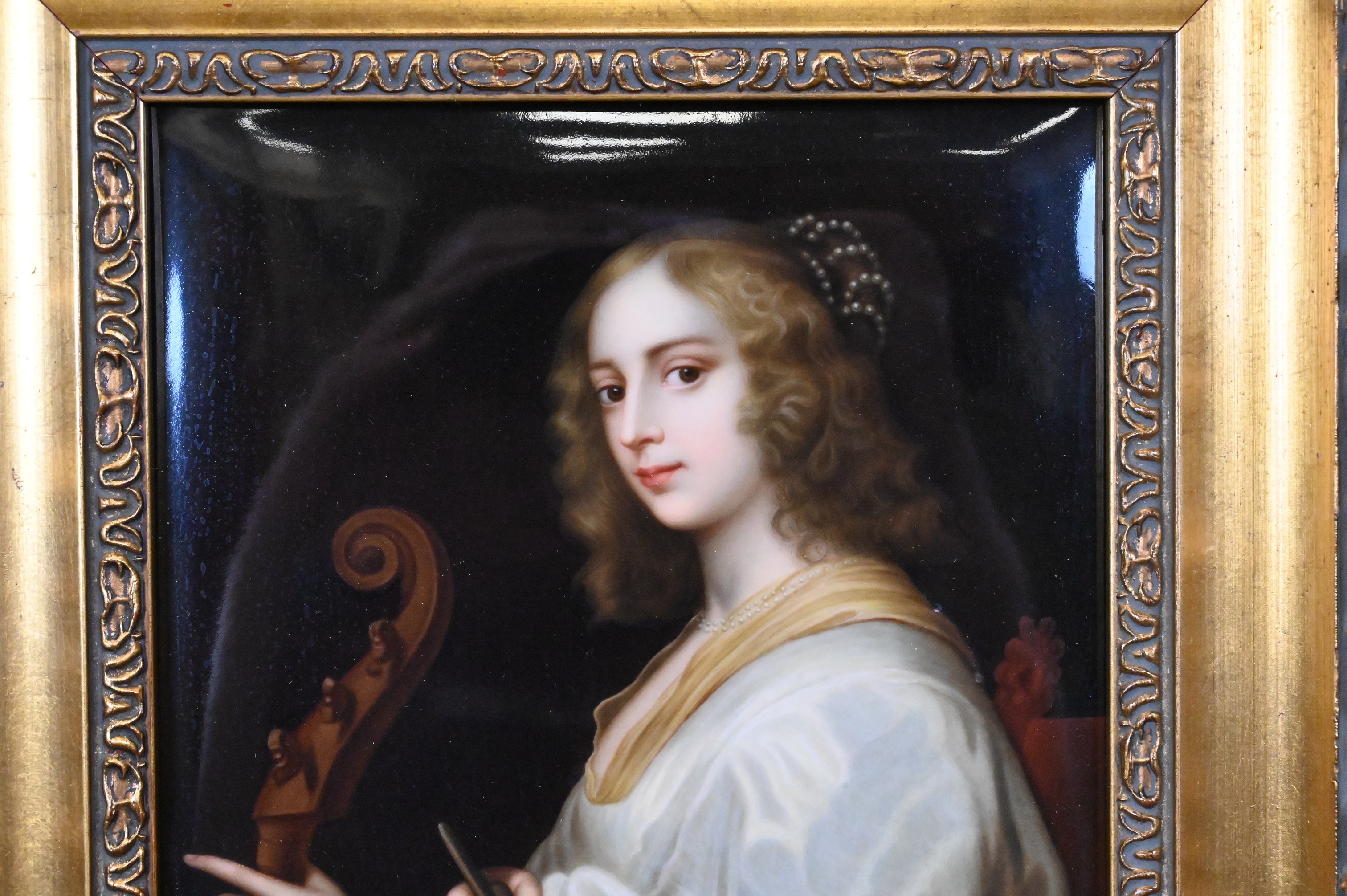 Finely painted K.P.M. porcelain plaque depicting Mary Ruthven, the wife of Sir Anthony van Dyck, shown seated beside a cello and bow, wearing a flowing white gown and pearl-adorned coiffure; his composition follows Van Dyck’s elegant portrayal of his wife, capturing the refinement and grace of 17th-century court portraiture