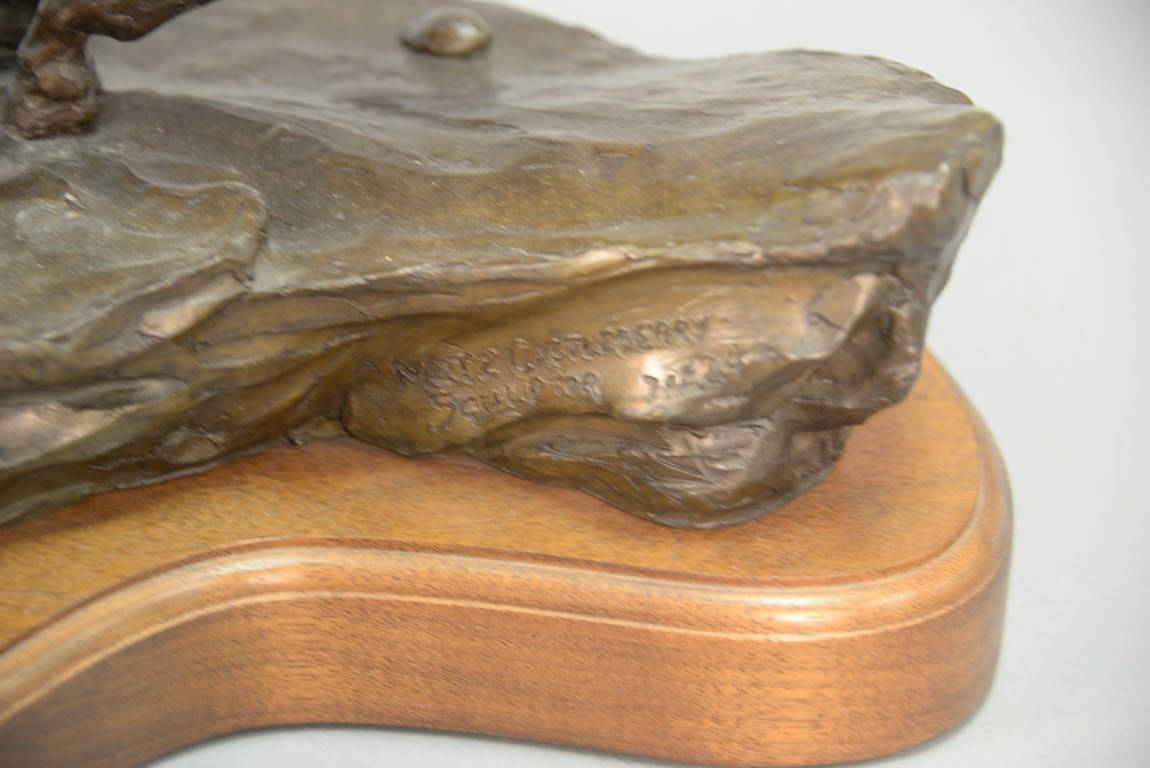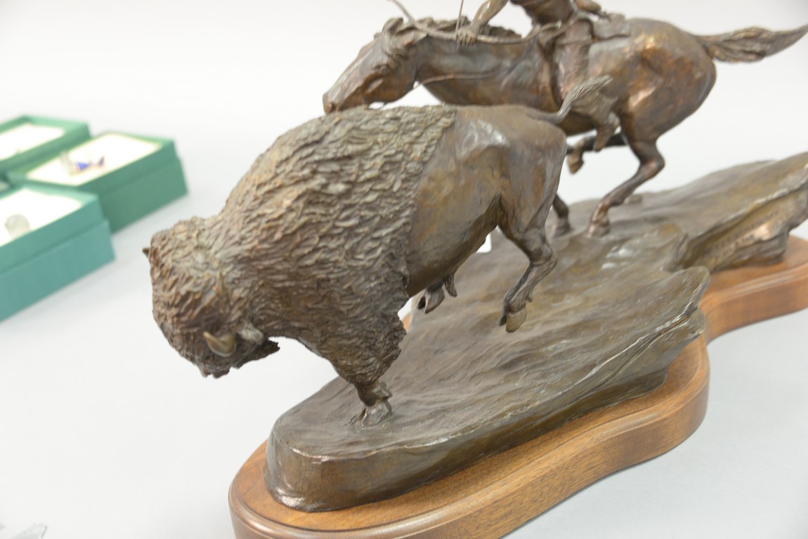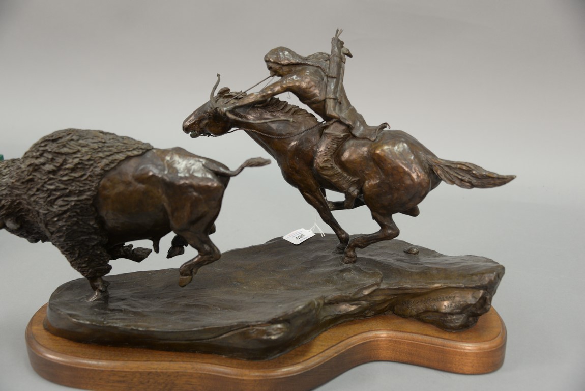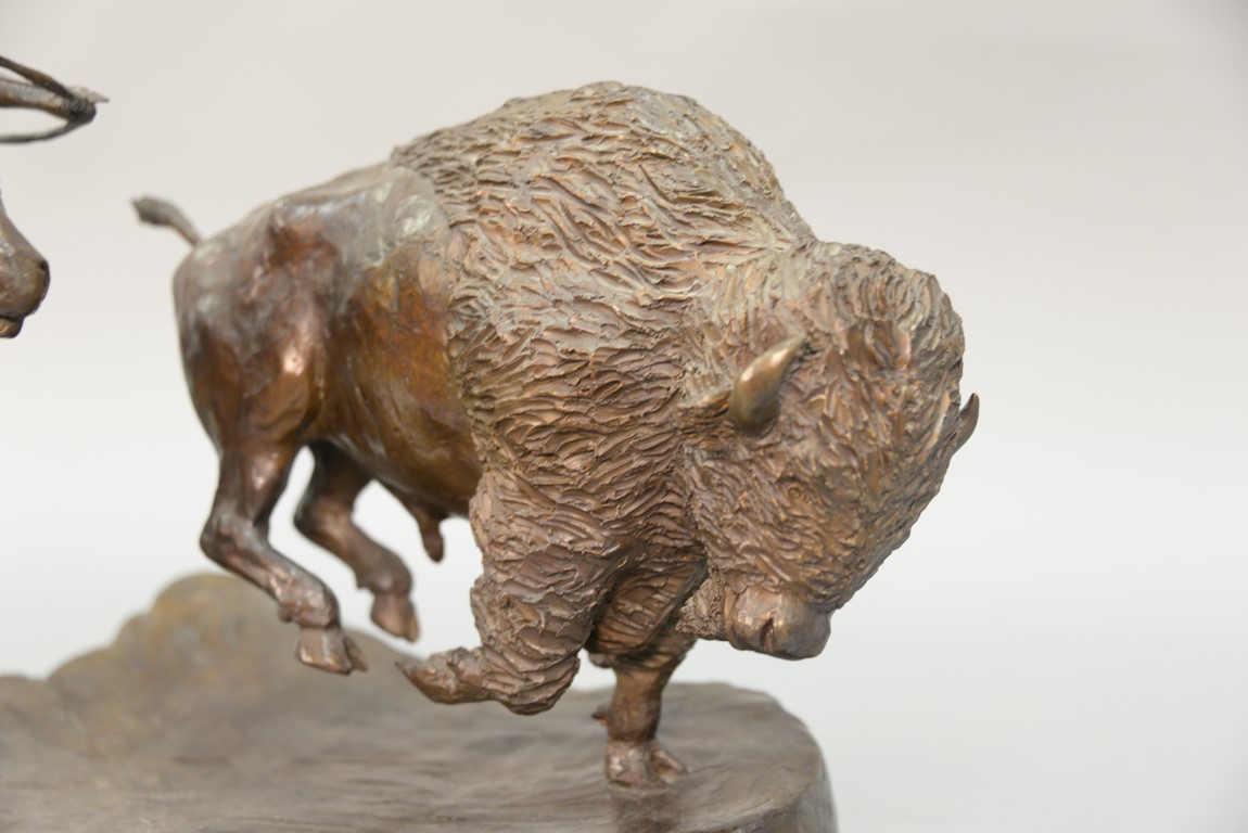 Metz Castleberry western bronze Great Plains Provider Indian on horseback shooting arrow at buffalo, on swivel wood base, signed and numbered on back. ht. 12 1/2 in. lg. 20 1/2 in.