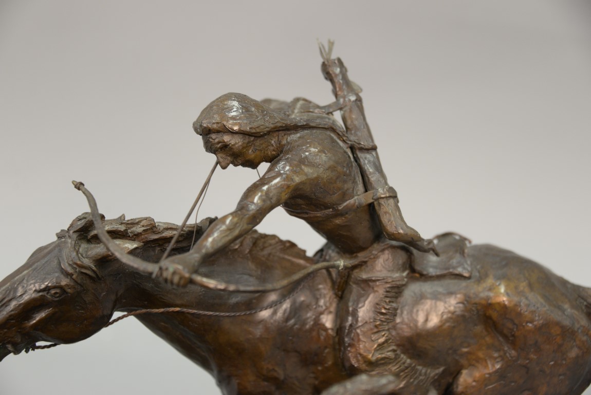 Lot 385: Metz Castleberry western bronze Great Plains Provider Indian on horseback shooting arrow at buffalo, on swivel wood base, signed a…