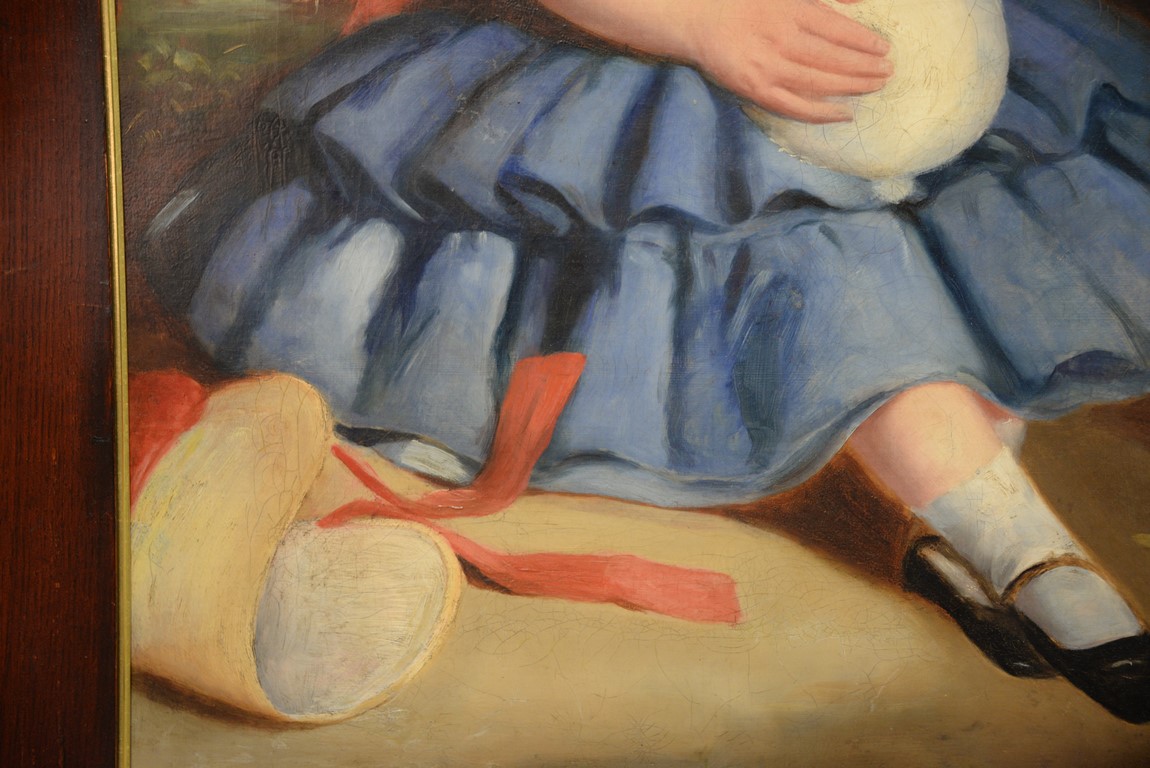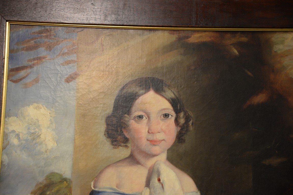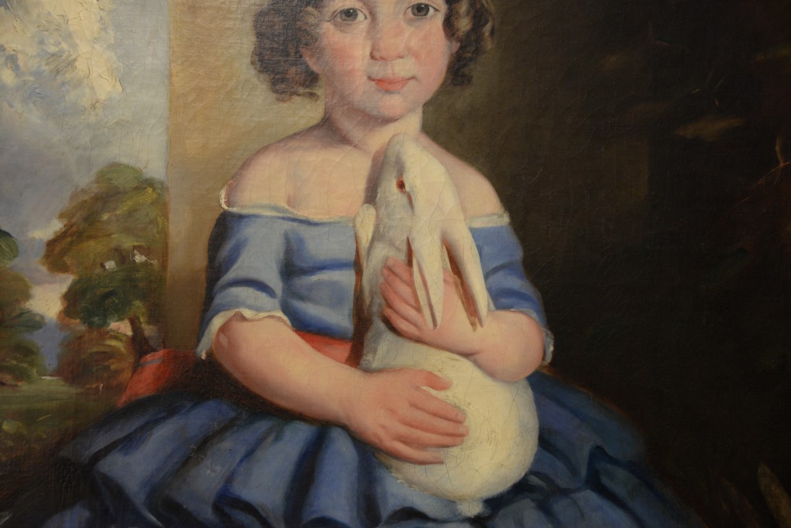 Primitive portrait of a young girl with rabbits, oil on canvas unsigned, 19th century. 35 1/2 x 28